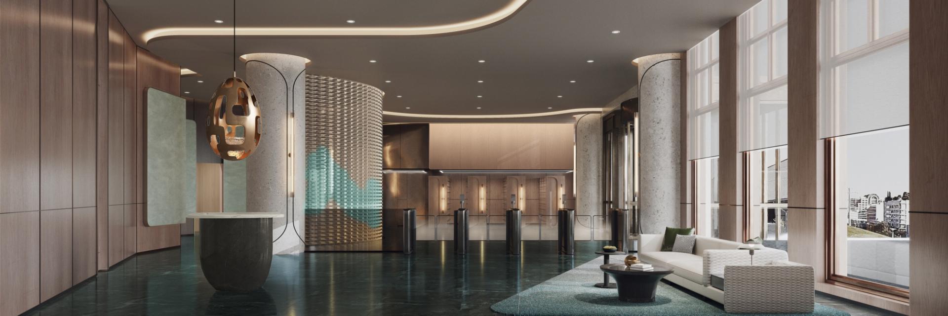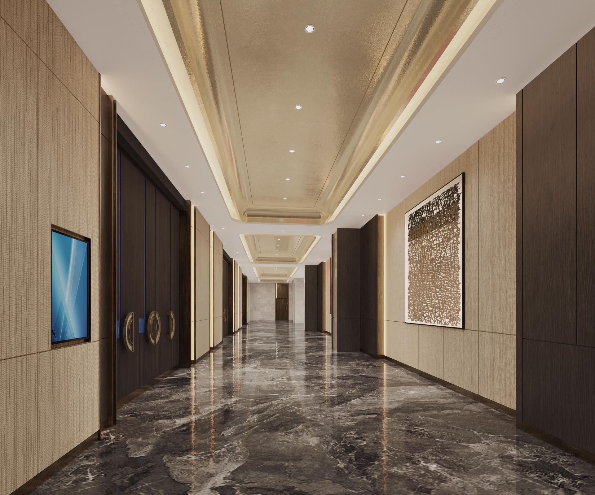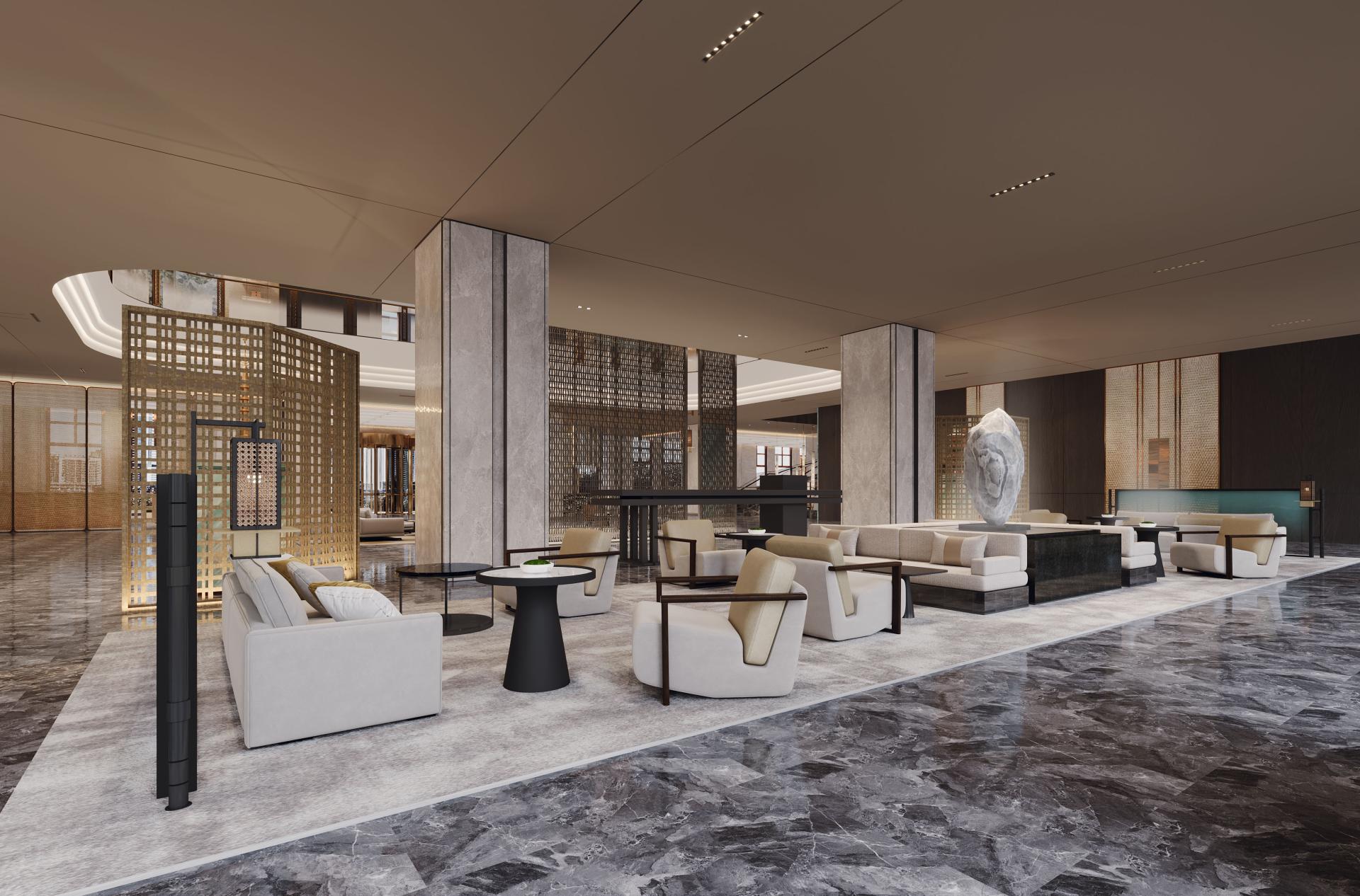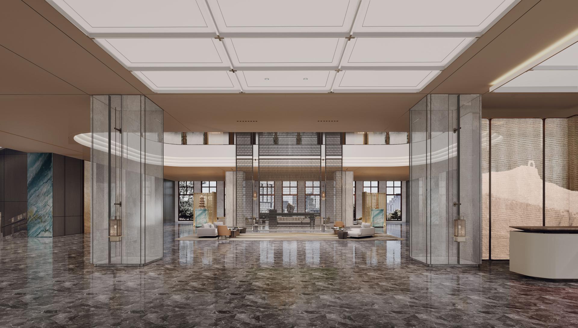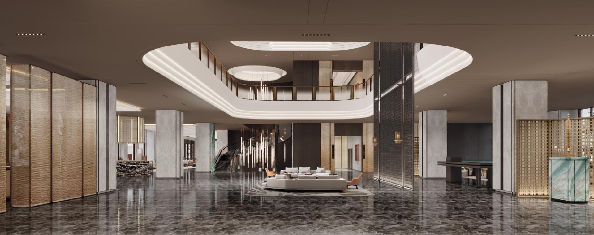 The hotel skillfully integrates local cultural elements with contemporary design, creating a distinctive visual identity for the Maison New Century Hotel—where regional culture meets innovative hotel design. Inspired by "Mist and Rain over the Sanggan River"—one of the ancient eight scenic views of Shanyin County—the design employs a sophisticated combination of bronze and subtle green tones. Modern materials such as glass screens, frosted glass panels, crystal lighting, artistic glass decorations, and hollow grilles are illuminated by soft light descending from the double-height atrium, evoking the dreamy, rain-kissed atmosphere of the Sanggan River banks. This approach immerses guests in an atmosphere where nature and art seamlessly converge.