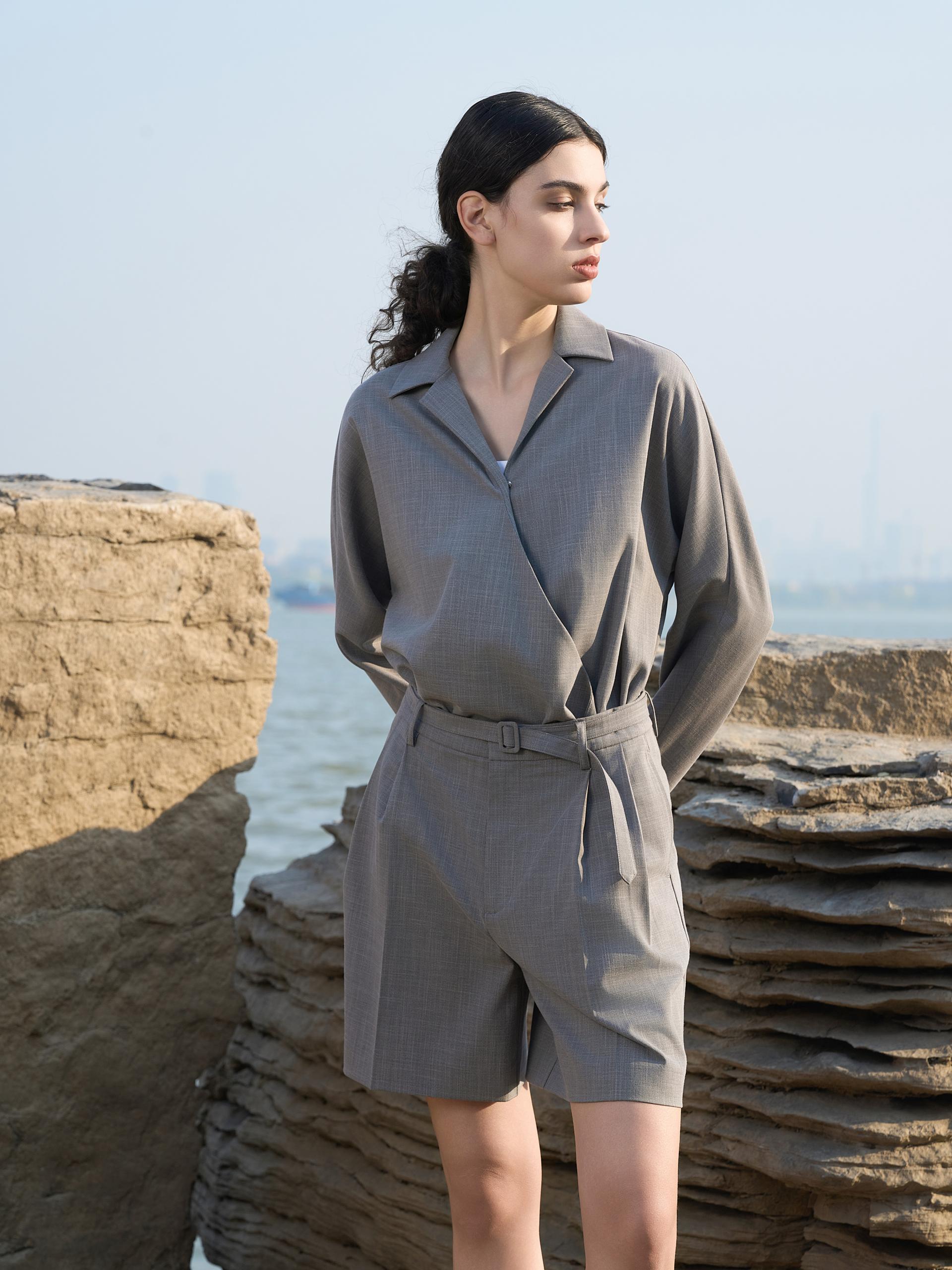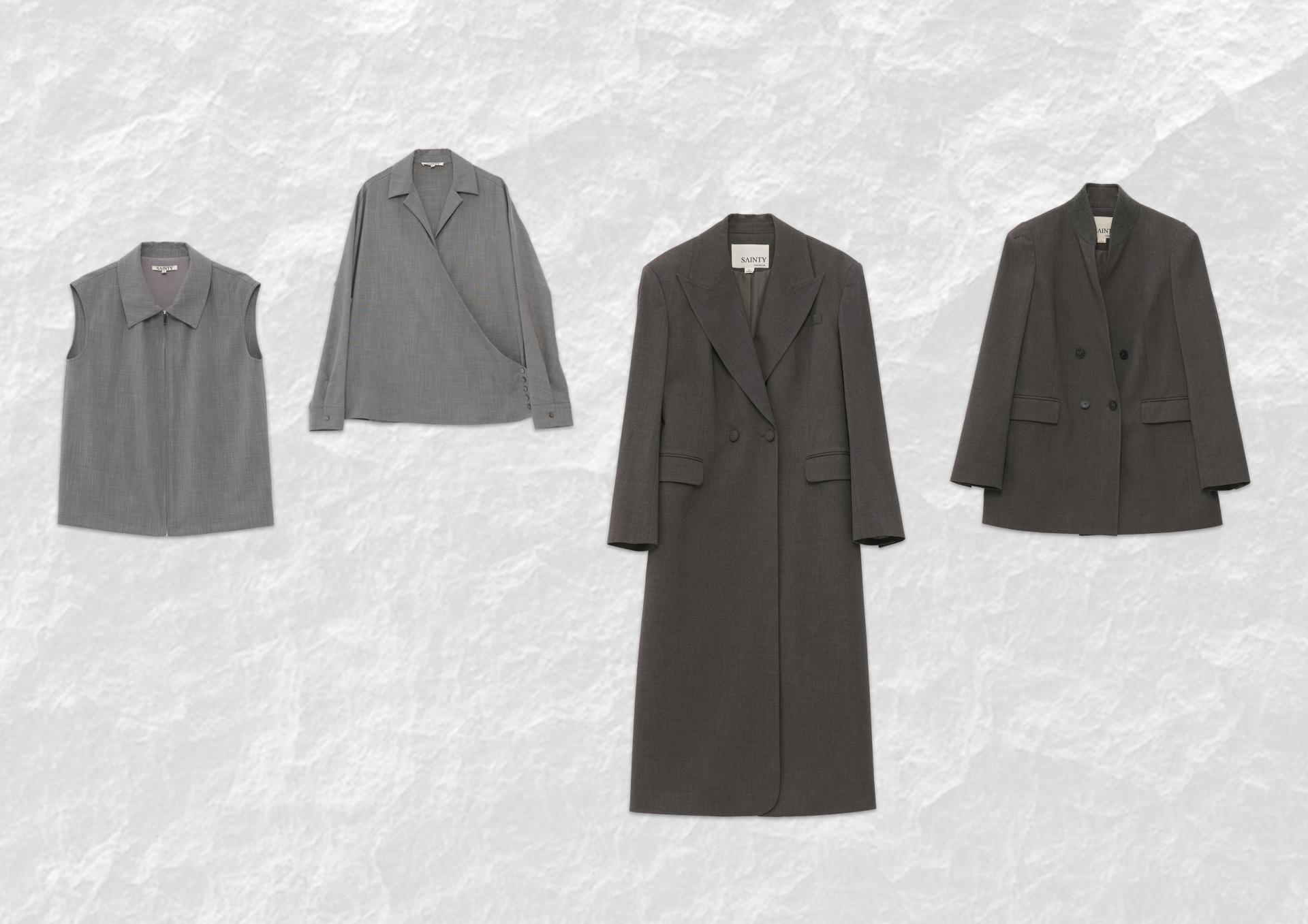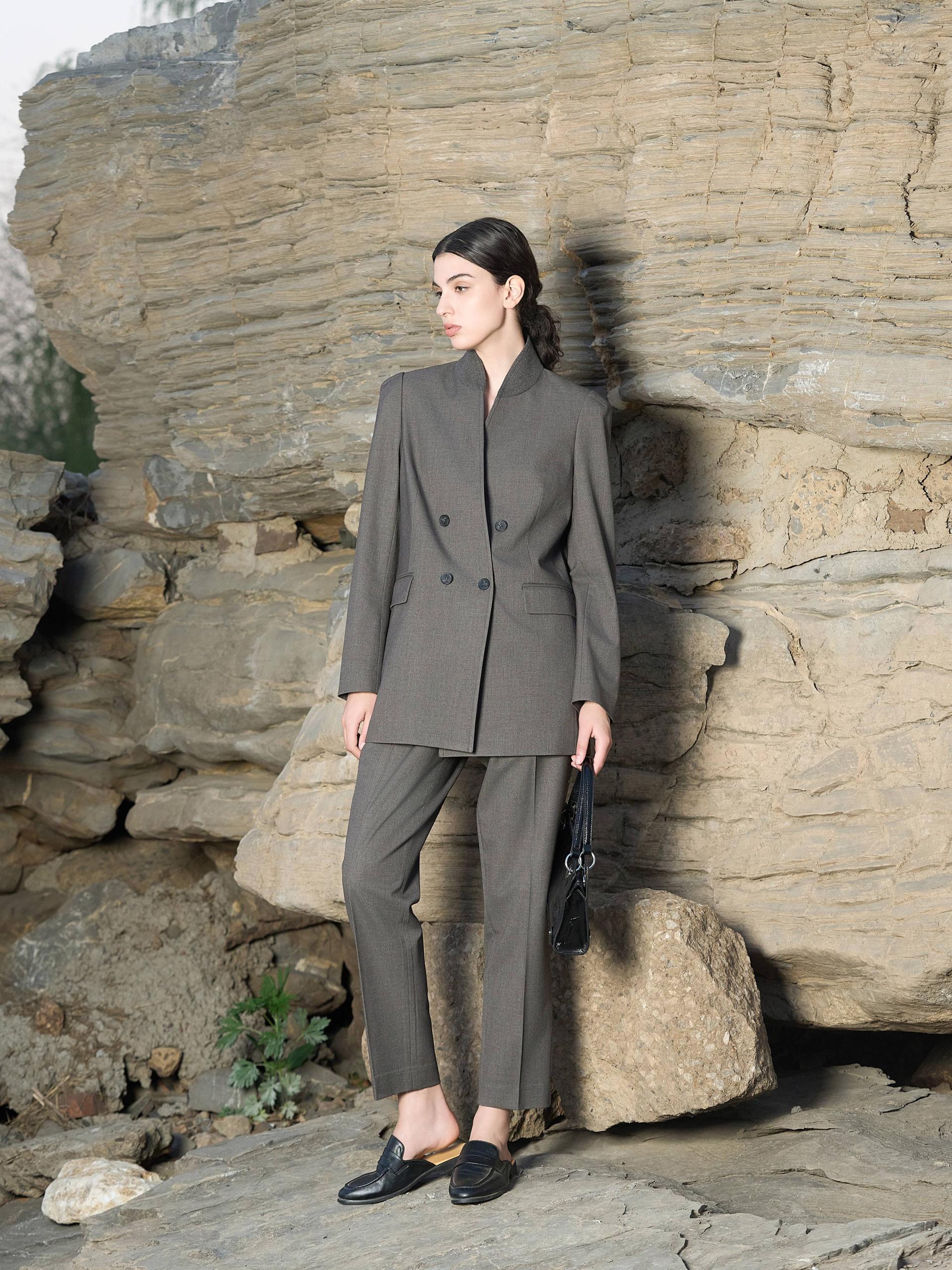 Drawing inspiration from gravel, the collection employs a low-saturation gray color palette, and adopts a blended fabric to replicate the delicate texture of gray; at the same time, the varying shades of gray enhance visual layering. Such a design achieves a harmonious unity of natural simplicity with modern minimalism. In terms of silhouette design, Gray Tone of Gravel is built upon classic minimalist forms like the H-shaped blazer and the high-waisted wide-leg pants, featuring clean, sharp lines that embody the aesthetics of architecture. Shoulder pads and a stand collar maintain a crisp effect, while shoulder pleats and a napped-in waist showcase elegant professionalism, ensure a snug fit, and improve freedom of movement. Moreover, the wrap blazer innovatively merges traditional Chinese wrap collars with Western blazers, infusing modern professional wear with cultural significance.