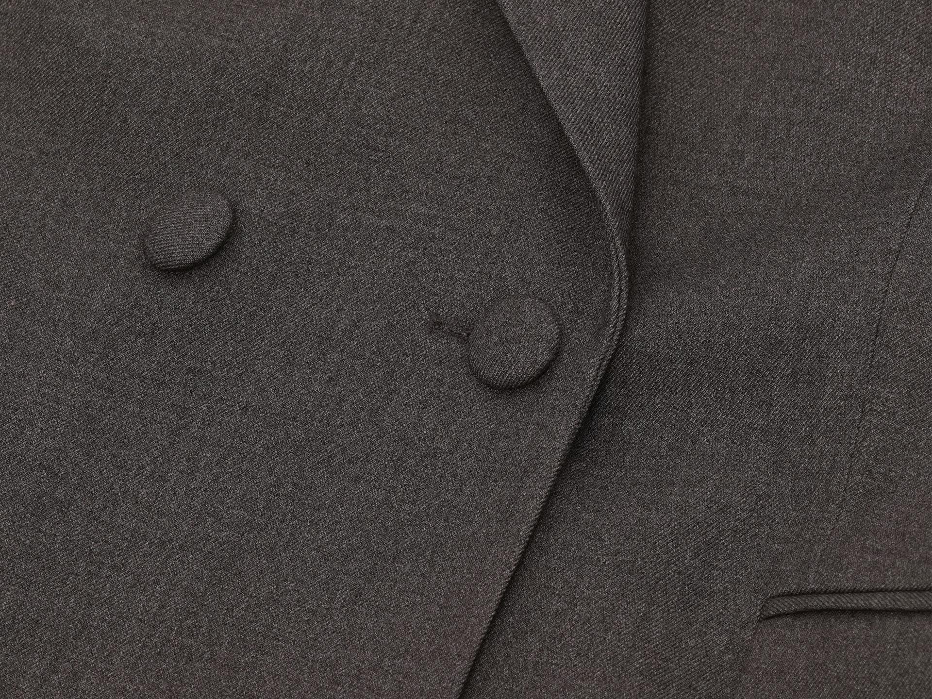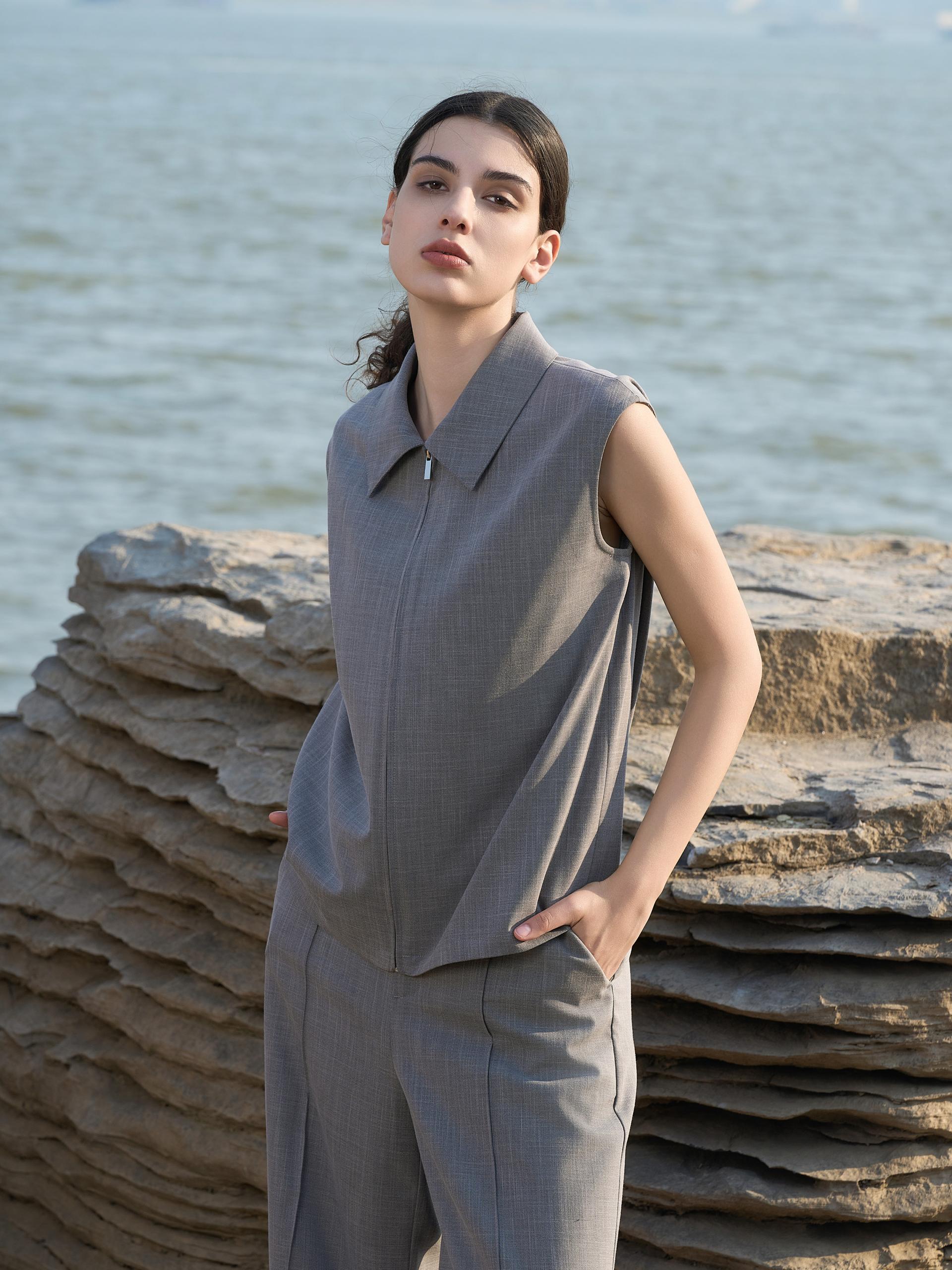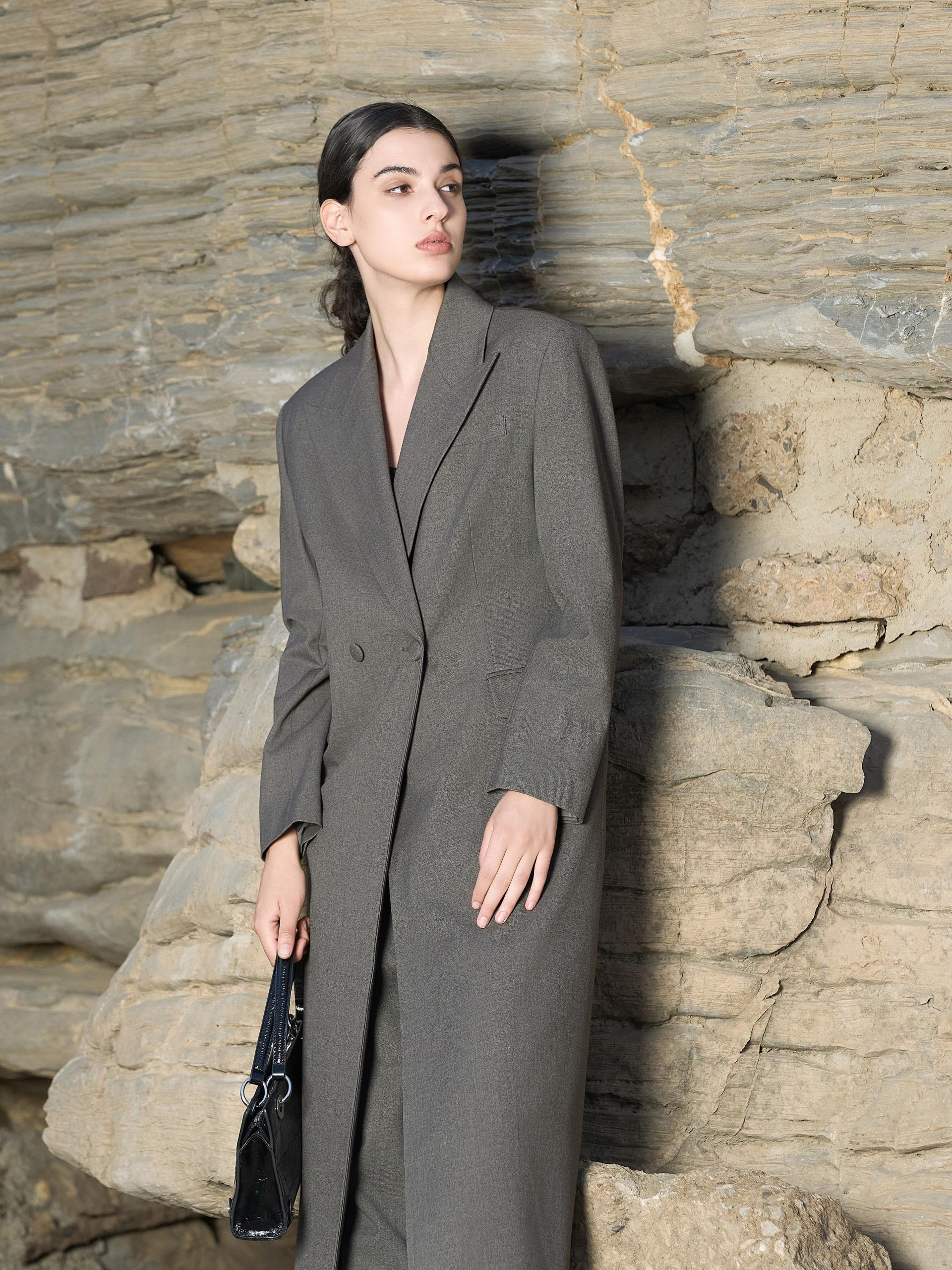 Drawing inspiration from gravel, the collection employs a low-saturation gray color palette, and adopts a blended fabric to replicate the delicate texture of gray; at the same time, the varying shades of gray enhance visual layering. Such a design achieves a harmonious unity of natural simplicity with modern minimalism. In terms of silhouette design, Gray Tone of Gravel is built upon classic minimalist forms like the H-shaped blazer and the high-waisted wide-leg pants, featuring clean, sharp lines that embody the aesthetics of architecture. Shoulder pads and a stand collar maintain a crisp effect, while shoulder pleats and a napped-in waist showcase elegant professionalism, ensure a snug fit, and improve freedom of movement. Moreover, the wrap blazer innovatively merges traditional Chinese wrap collars with Western blazers, infusing modern professional wear with cultural significance.
