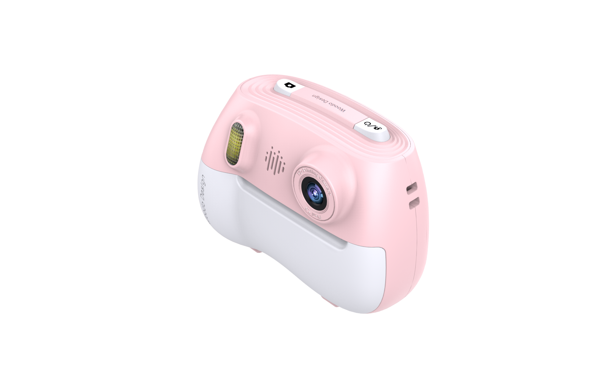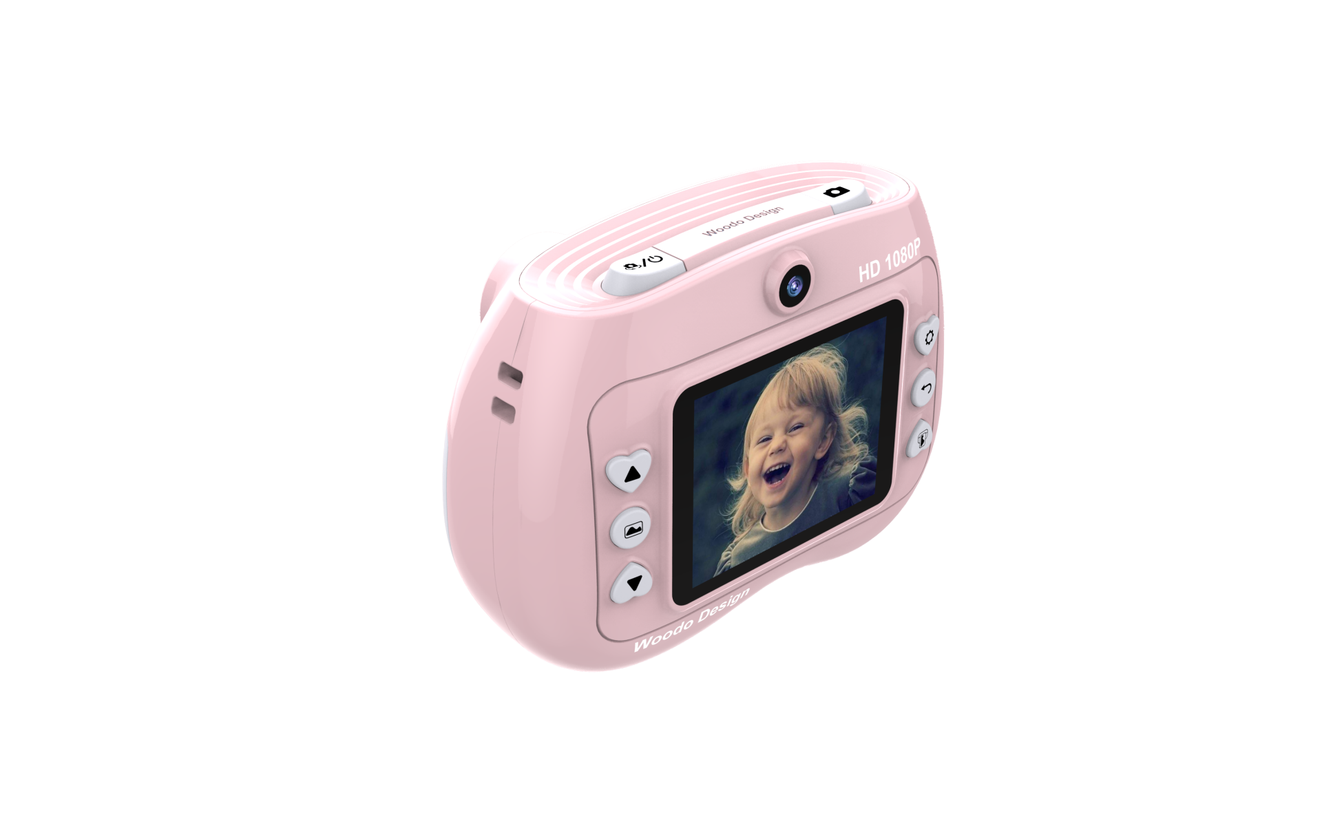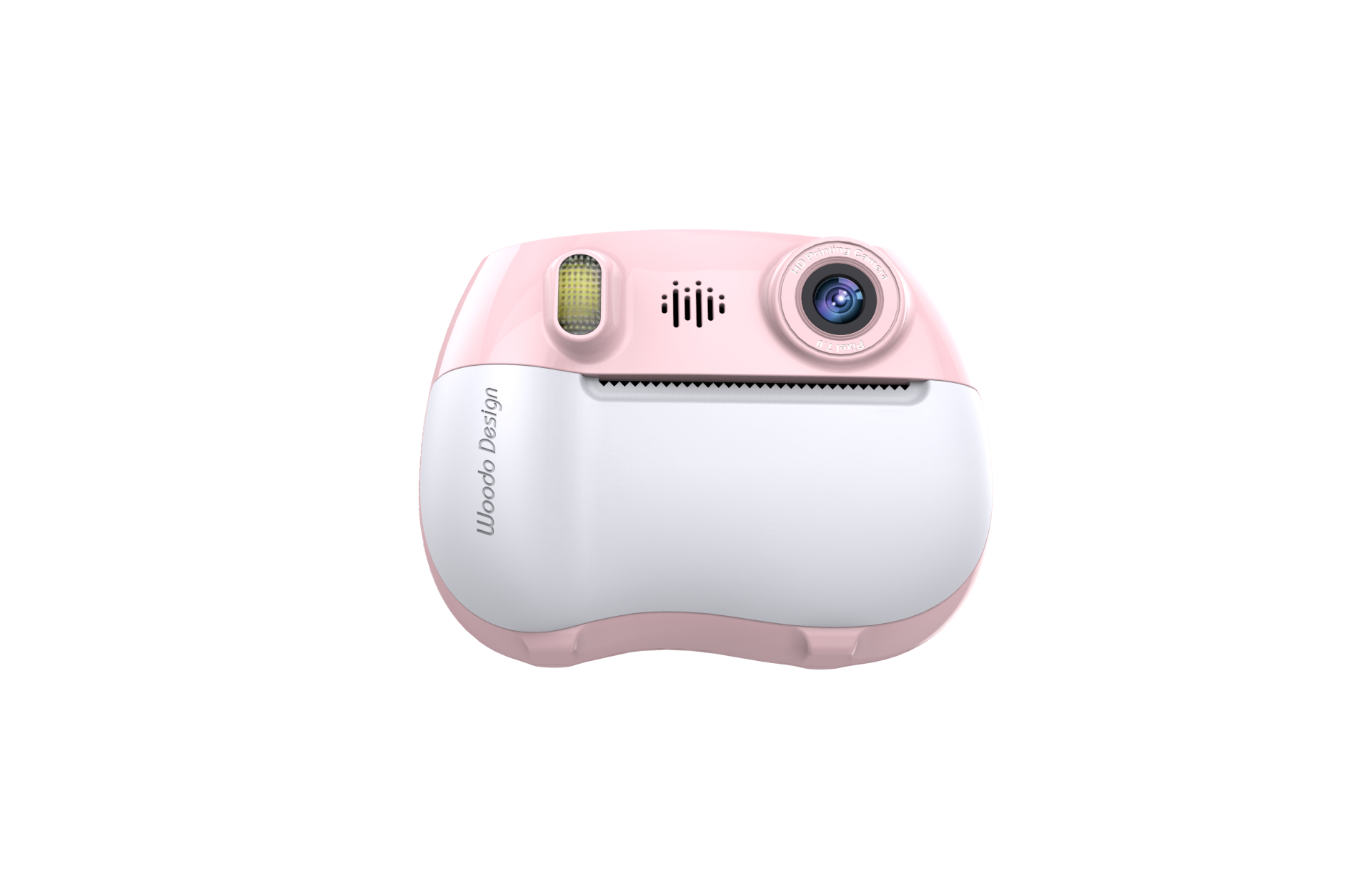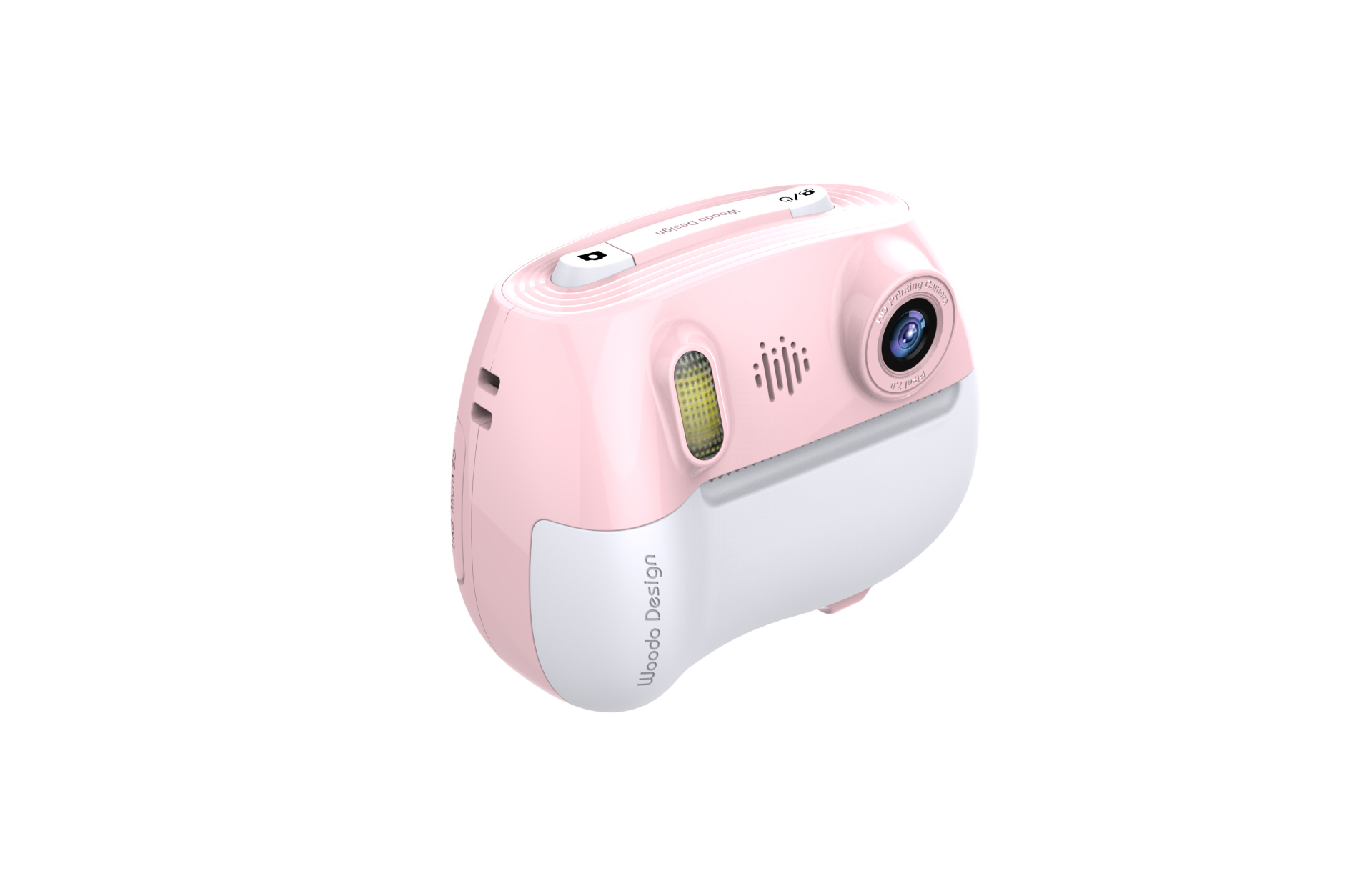 This product draws inspiration from the rounded shape of a hippo, featuring a smooth and natural design with a simple yet attractive color scheme, and a structure that adheres to ergonomic principles, making it ideal for children. The camera sports a soft pink base color, complemented by a white body and pink trim, adding a cute and appealing visual effect. Additionally, it is available in multiple colors, including blue, green, and yellow, catering to the preferences of different children. The front is equipped with a high-definition camera alongside a flash, ensuring clear photos under various lighting conditions. The brand name "Woodo Design" is prominently displayed on the side, highlighting the brand's identity. Designed with child safety and comfort in mind, the camera features an intuitive button layout that is easy to operate, perfect for small hands, and encourages children's creativity and interest in photography.
