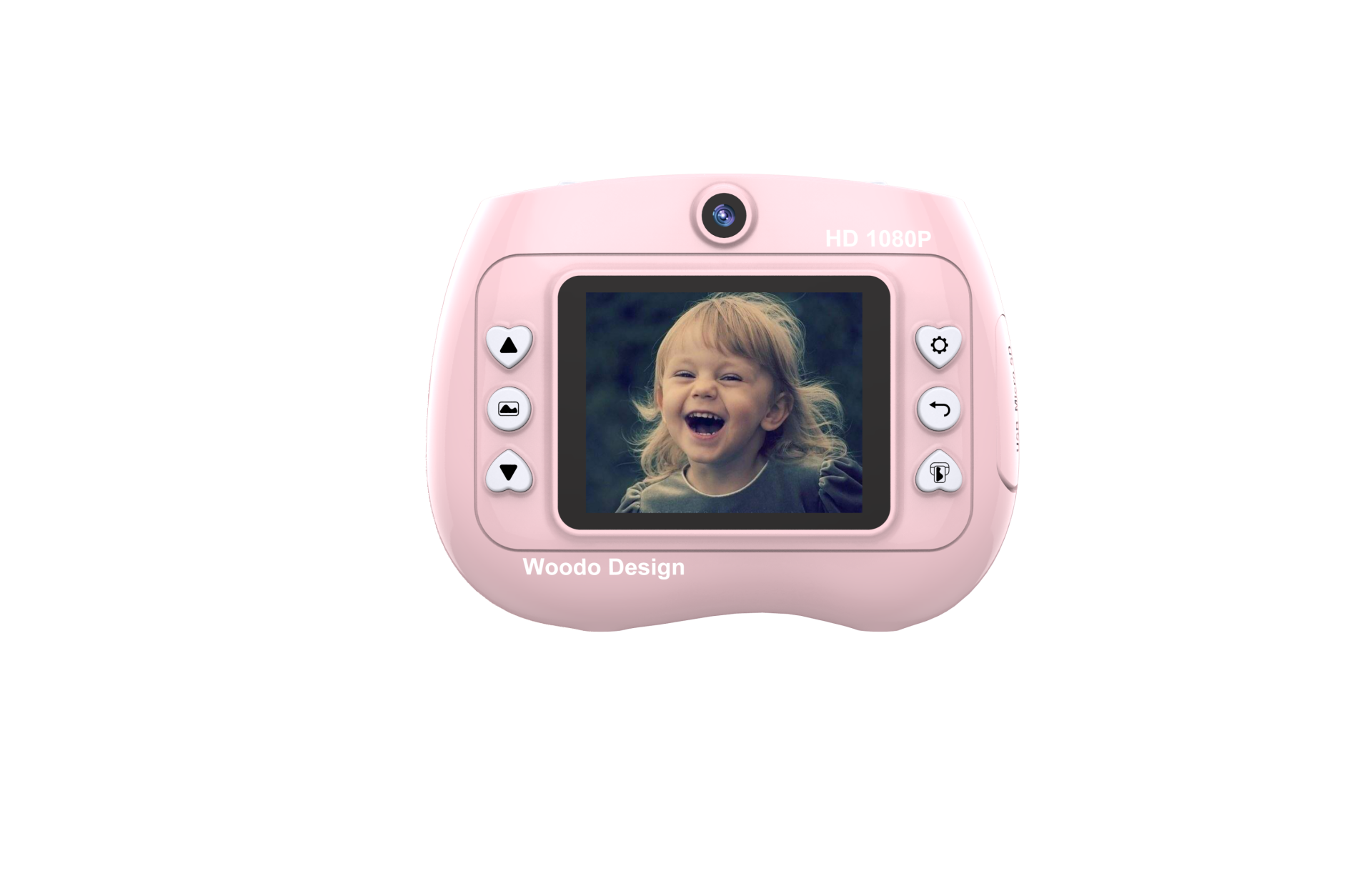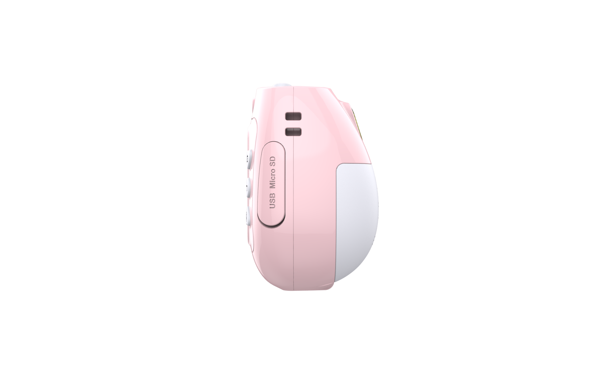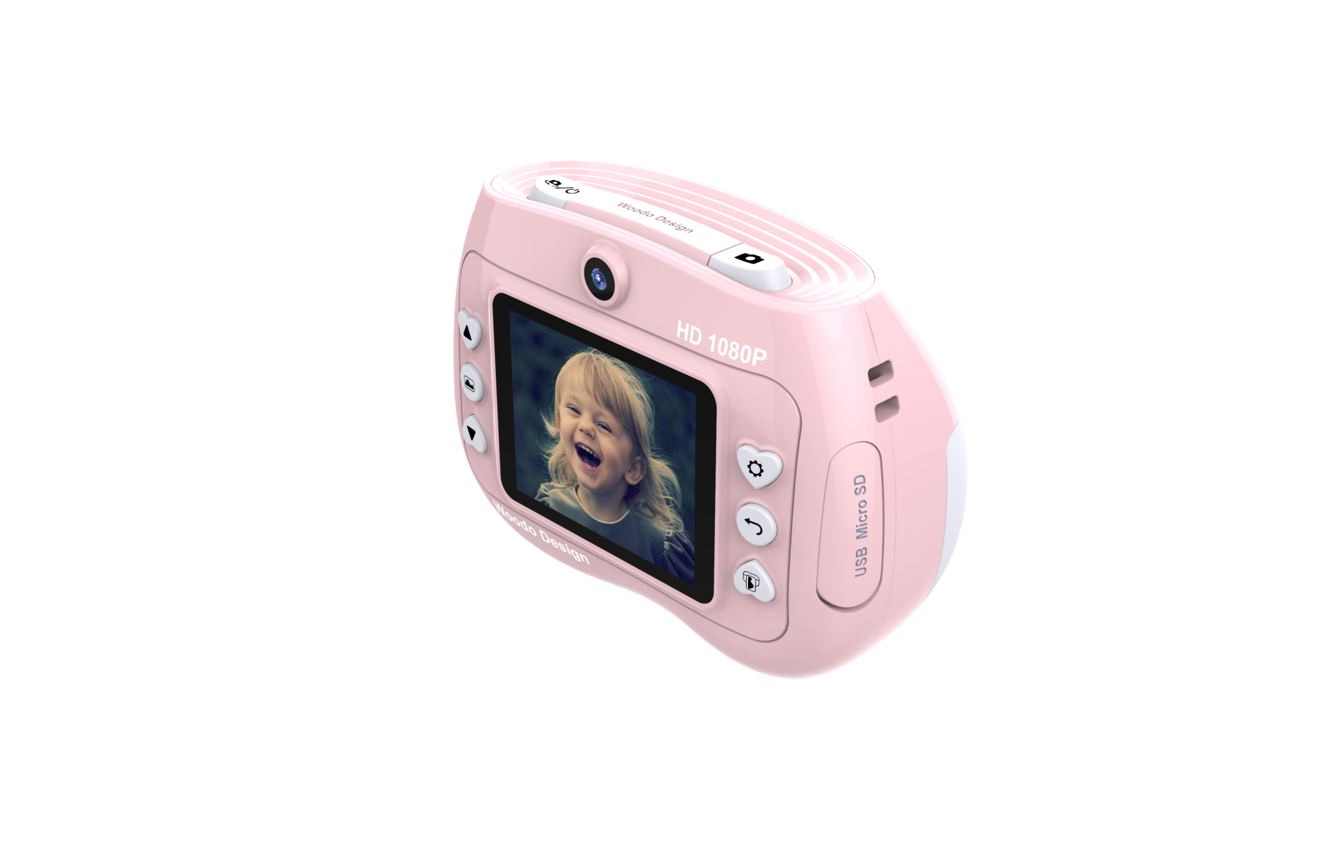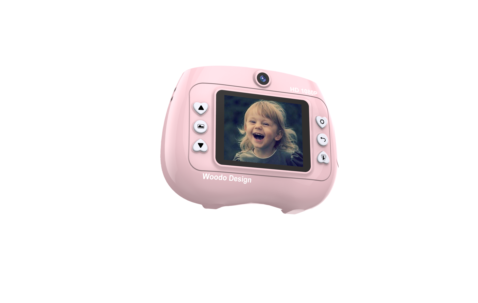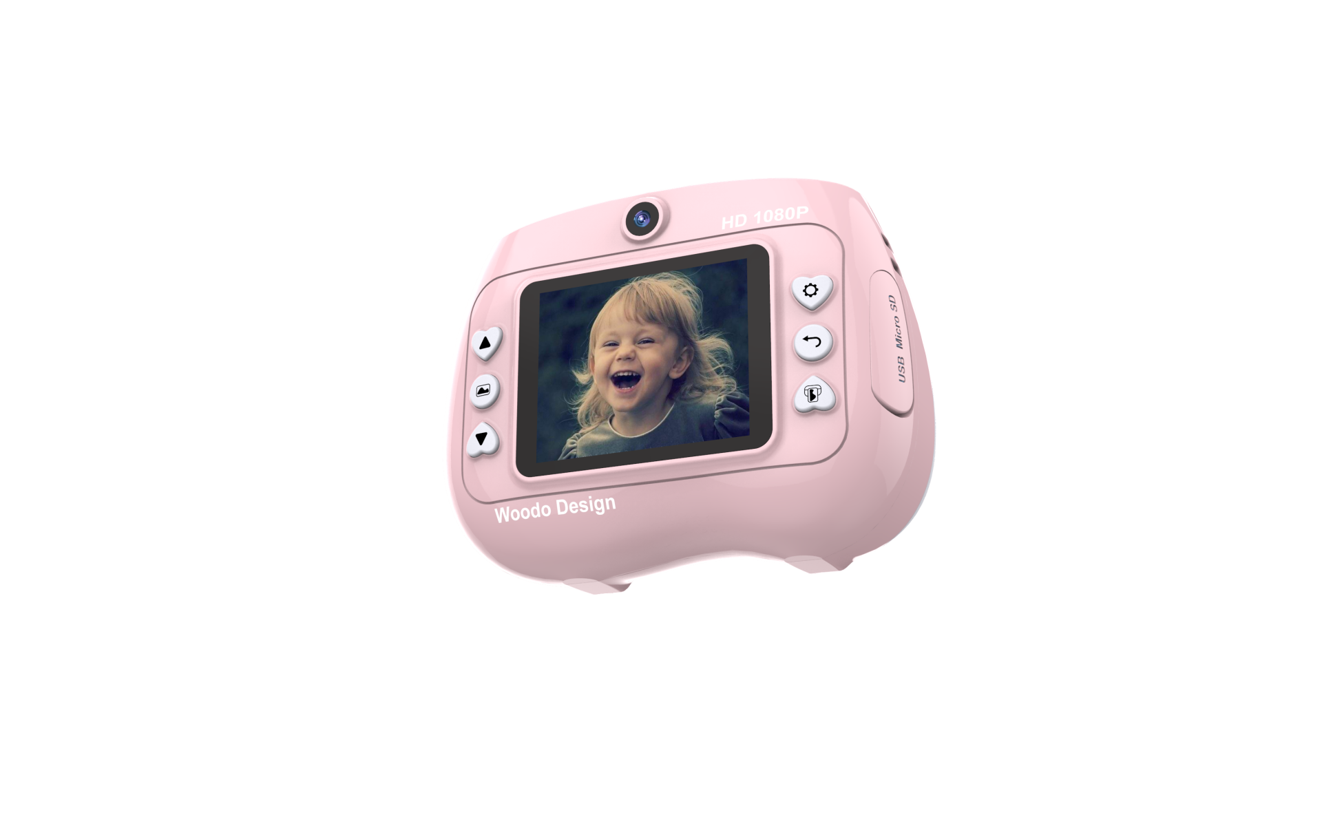 This product draws inspiration from the rounded shape of a hippo, featuring a smooth and natural design with a simple yet attractive color scheme, and a structure that adheres to ergonomic principles, making it ideal for children. The camera sports a soft pink base color, complemented by a white body and pink trim, adding a cute and appealing visual effect. Additionally, it is available in multiple colors, including blue, green, and yellow, catering to the preferences of different children. The front is equipped with a high-definition camera alongside a flash, ensuring clear photos under various lighting conditions. The brand name "Woodo Design" is prominently displayed on the side, highlighting the brand's identity. Designed with child safety and comfort in mind, the camera features an intuitive button layout that is easy to operate, perfect for small hands, and encourages children's creativity and interest in photography.