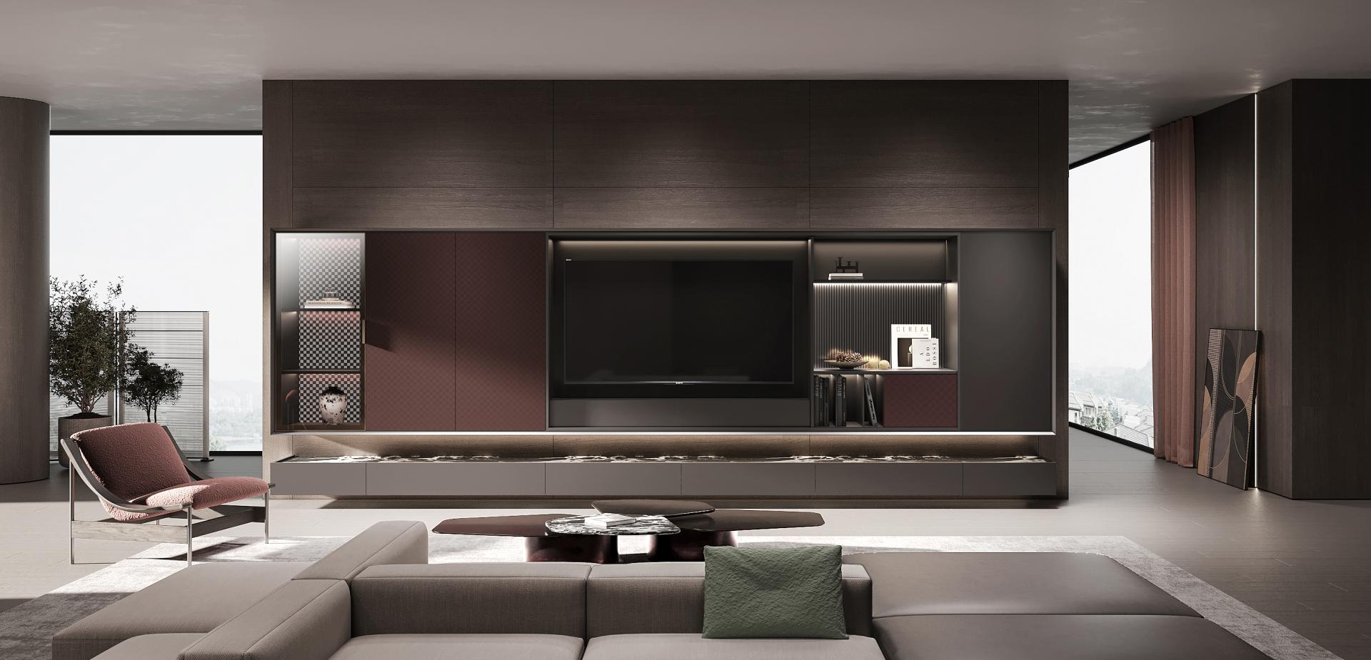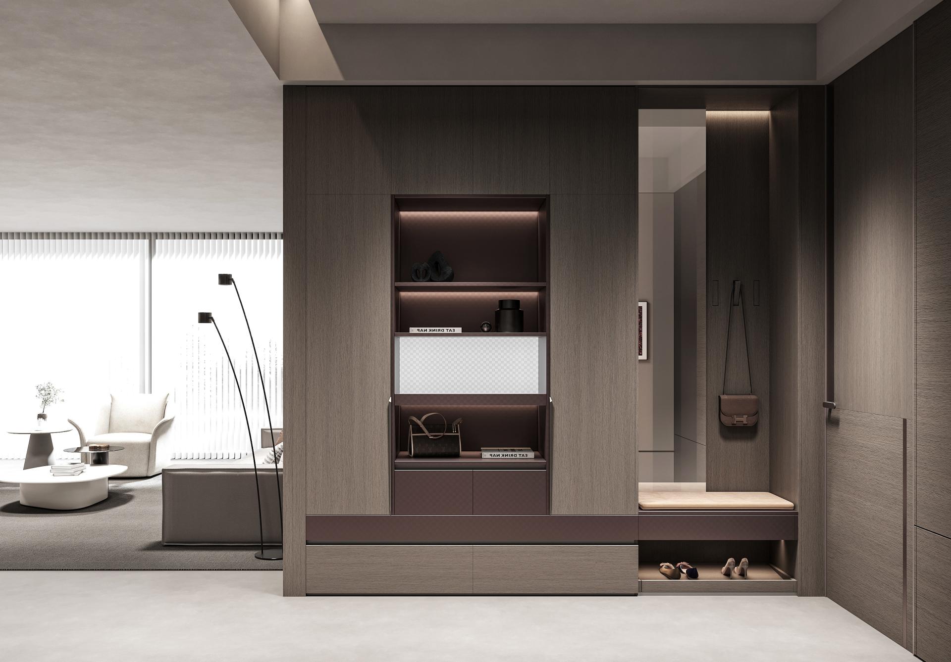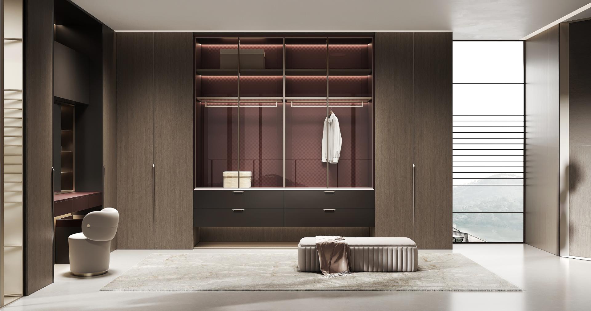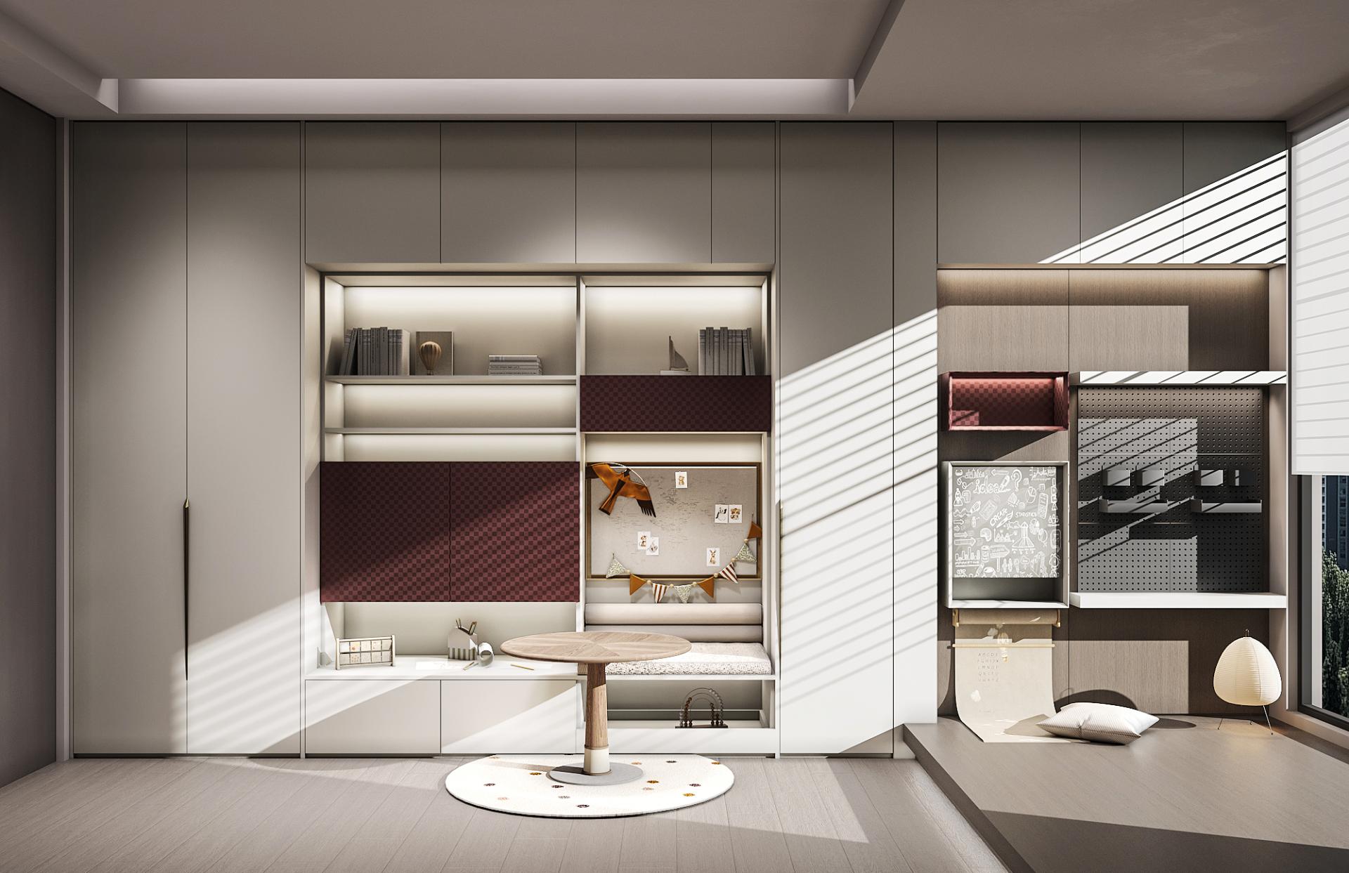The JuYao series is meticulously designed for contemporary urban youth, with inspiration drawn from in-depth research into their living needs. In contrast to the "decluttering" philosophy of traditional minimalist design, this work introduces a new concept of "Inner Minimalism"—imbuing spaces with warmth and personality while maintaining visual order. It achieves a more emotionally nuanced balance through a harmonious combination of deep gray, warm wood, and metallic red. This design distinguishes itself from the starkness and detachment often associated with conventional minimalism, emphasizing instead the psychological comfort and spiritual resonance of the inhabitants. JuYao's formal language is centered on "restraint and contrast." The deep gray primary color provides a sense of stability, wood grain textures add tactile warmth, and metallic "star-pattern" details give the space focal points. The overall structure employs a linear layout with hidden edges, maintaining clean vertical surfaces; simultaneously, controlled gloss levels and refined surface textures create visual depth. This design keeps the space gentle and orderly within a clean geometric framework, offering both modern appeal and compatibility with various home furnishing styles. JuYao places material innovation at the core of its design. Through the "super-matte synchronous wood grain" process, co-developed with equipment manufacturers, traditional double-sided decorative panels achieve a visual and tactile performance closely approaching high-end PET finishes—offering both a soft matte texture and a delicate skin-like feel. This technology effectively elevates the perceived quality and expressive power of conventional materials, striking a balance between cost control and aesthetic experience, and giving the space a higher degree of recognition and modernity. The entire JuYao series uses ENF-grade environmentally friendly particleboard and OSB substrates, ensuring low formaldehyde emissions and safeguarding residential health. Its innovative, highly durable finishes offer properties such as wear resistance, scratch resistance, and anti-fingerprint, significantly extending product lifespan and reducing replacement and maintenance frequency. The production process utilizes pressed laminates instead of traditional spray painting, effectively avoiding VOC emissions and achieving a more energy-efficient and environmentally friendly manufacturing process. Through scientific material selection and refined process control, JuYao is committed to creating healthy, safe, and environmentally friendly sustainable living spaces.