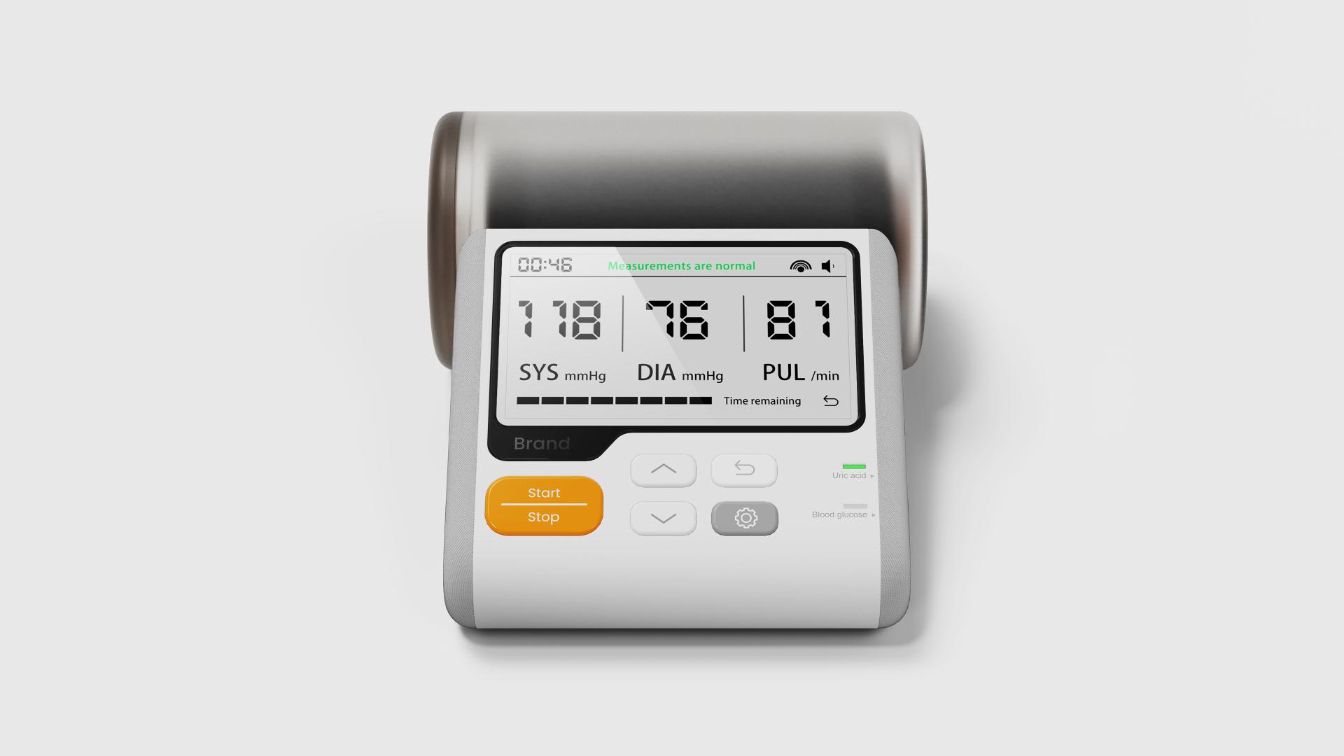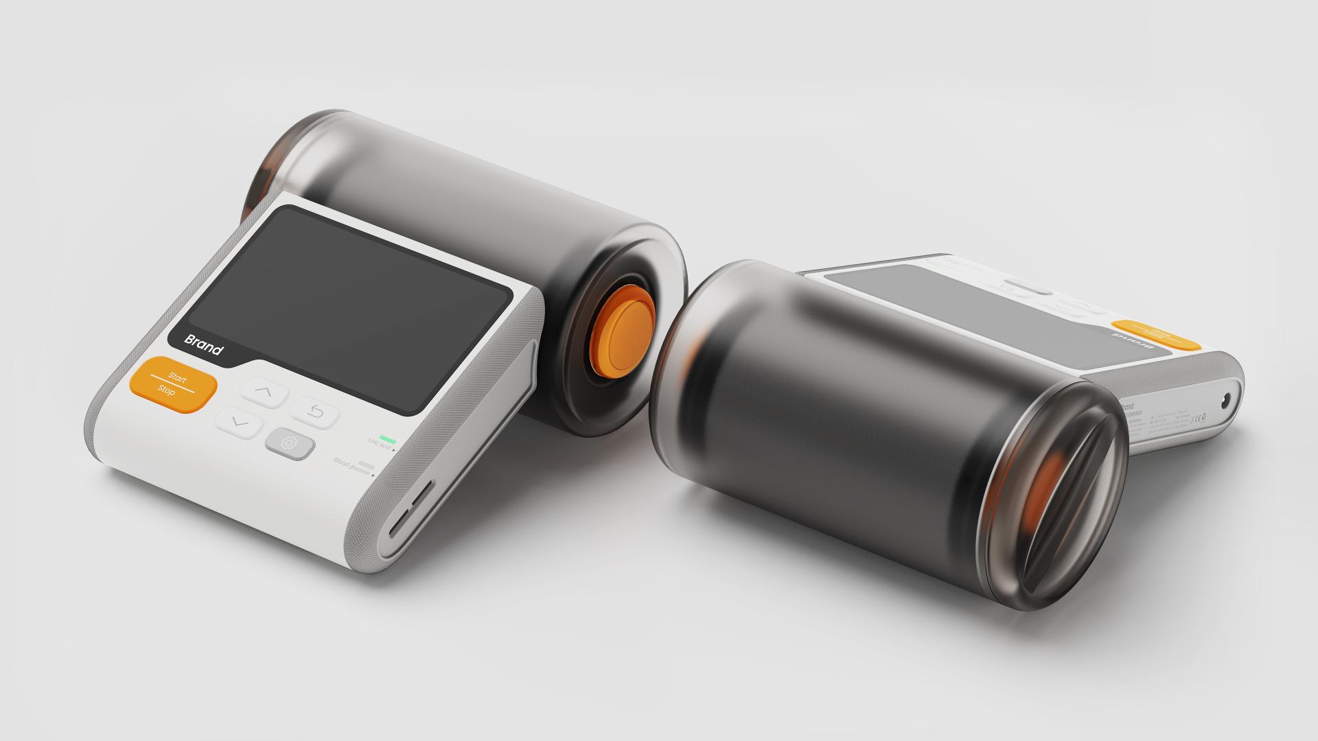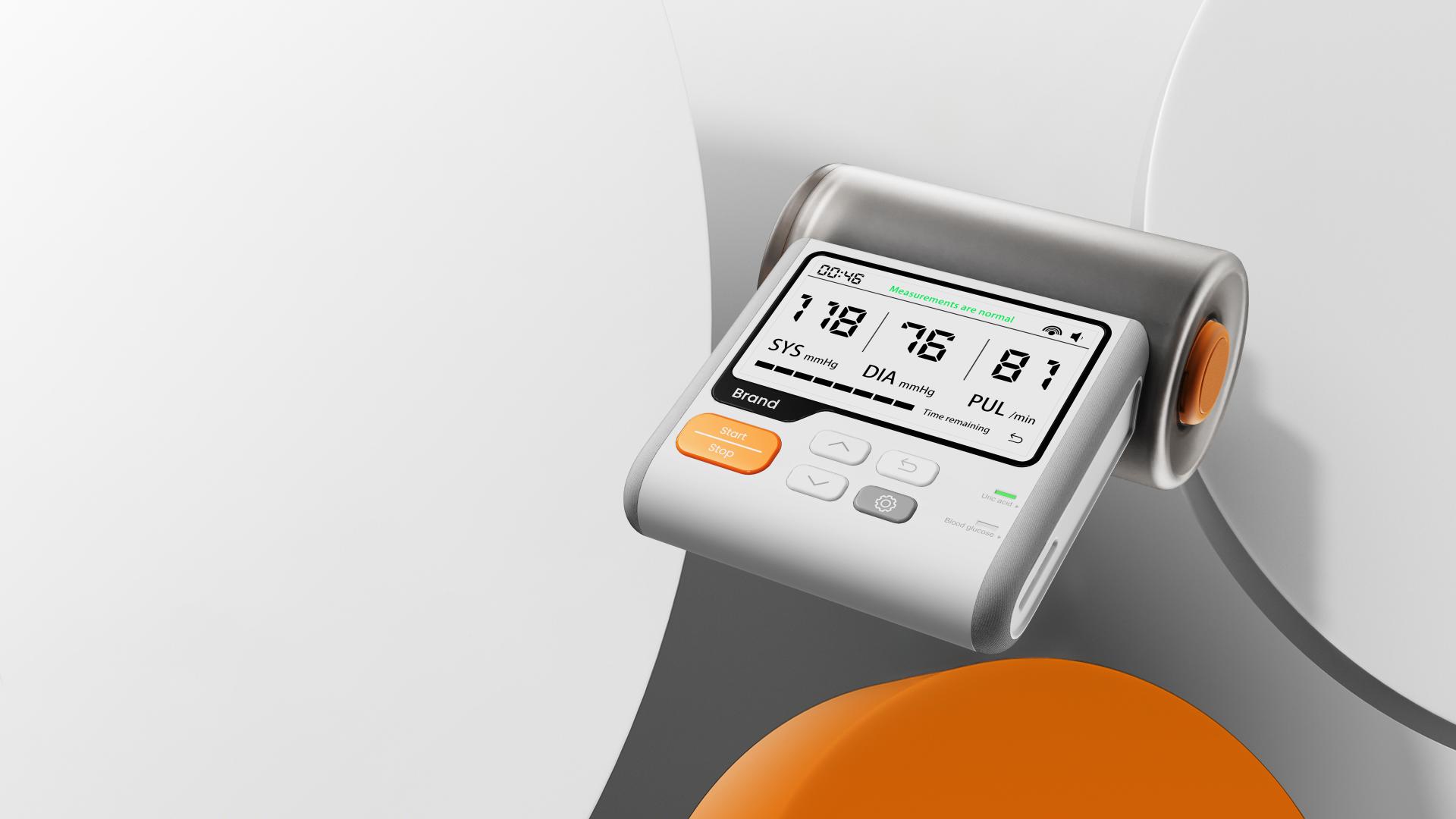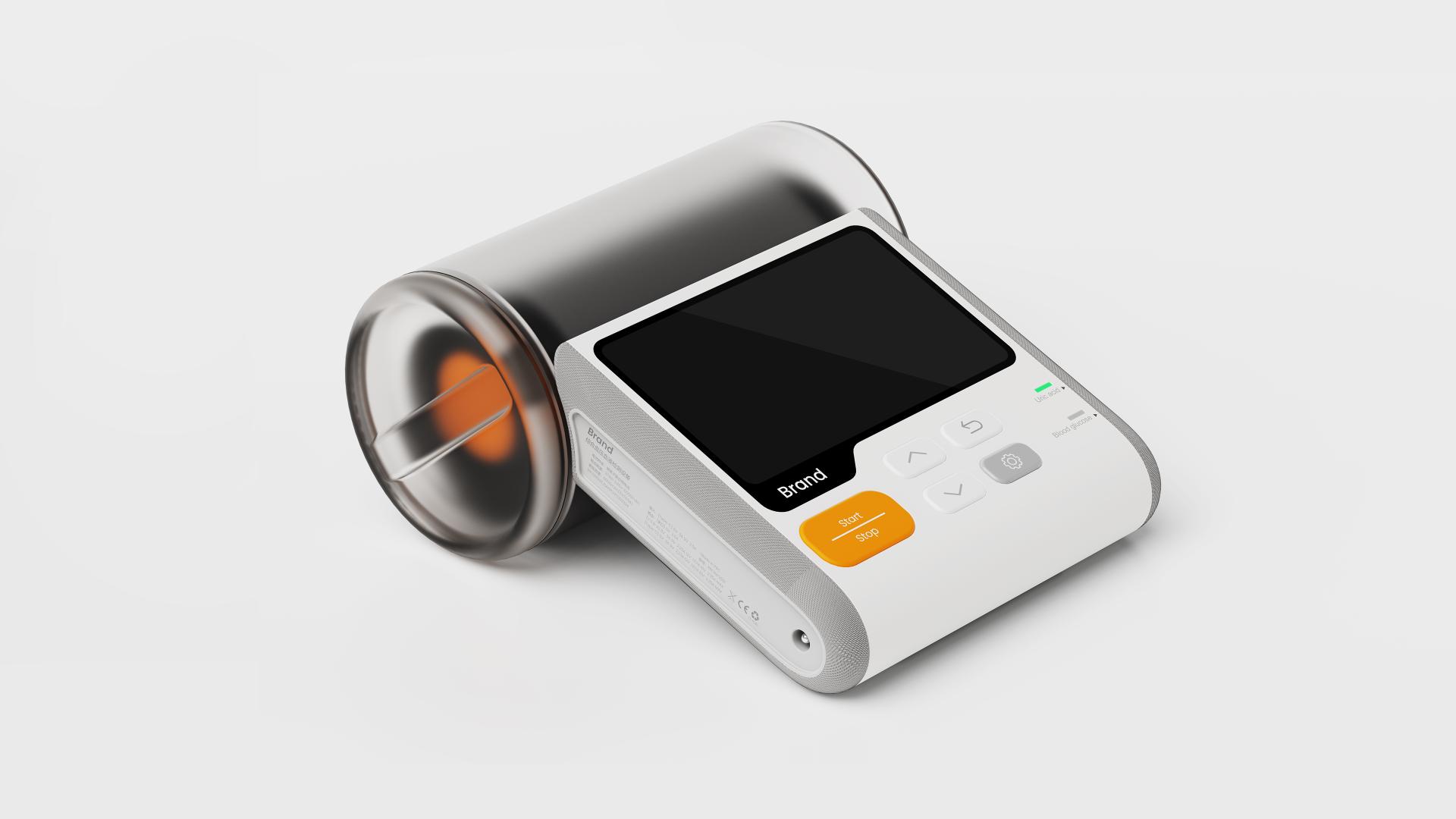 Breaking away from the conventional blue or green color schemes of medical devices, this health monitor features a soft white base with vibrant orange accents, softening the clinical feel of traditional medical equipment. Its sleek streamlined design with carefully proportioned curves ensures comfortable handling. The combination of fabric, frosted PCB, and transparent frosted PC materials, paired with meticulous craftsmanship, creates a refined aesthetic and premium tactile experience. Designed for both professional and everyday use, it seamlessly fits into medical settings and diverse home environments.