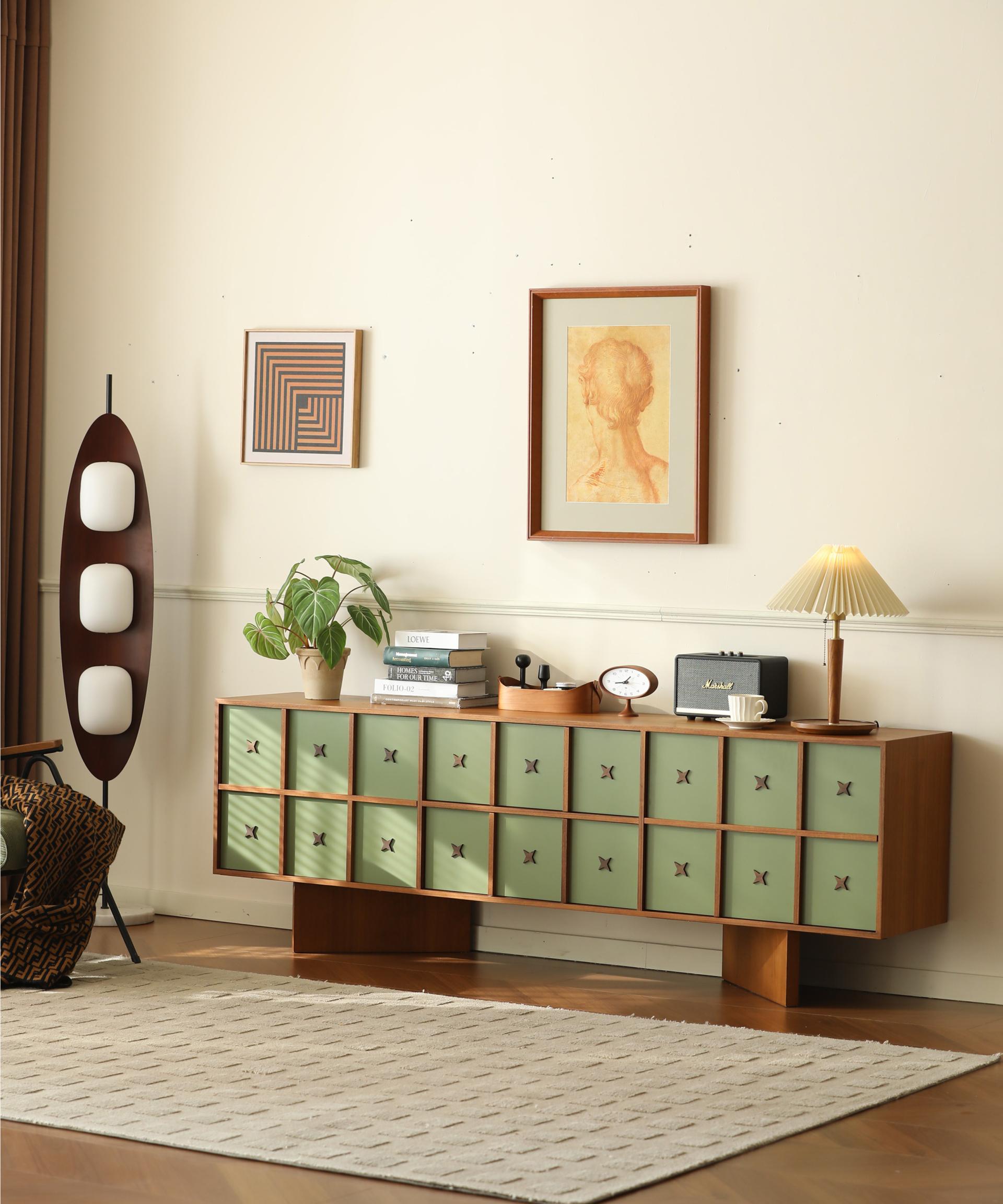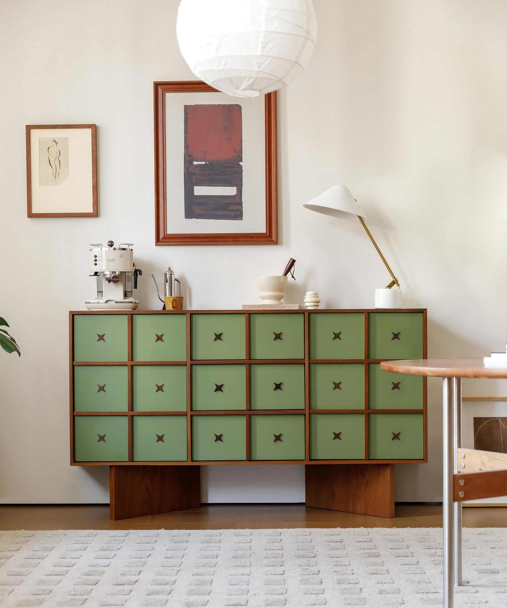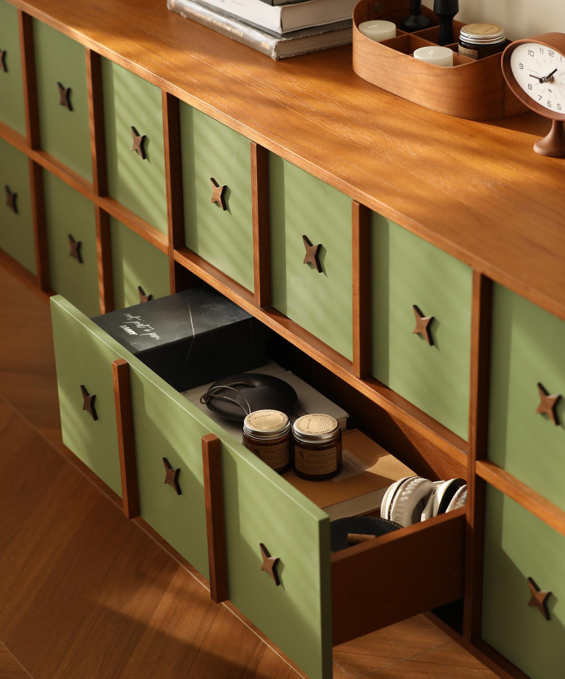 Using “stars” as a central visual motif, the Fanxin Series features a solid walnut drawer front carved in star patterns. The combination of vintage green and golden-brown Burmese teak creates a striking color contrast that seamlessly blends different styles.