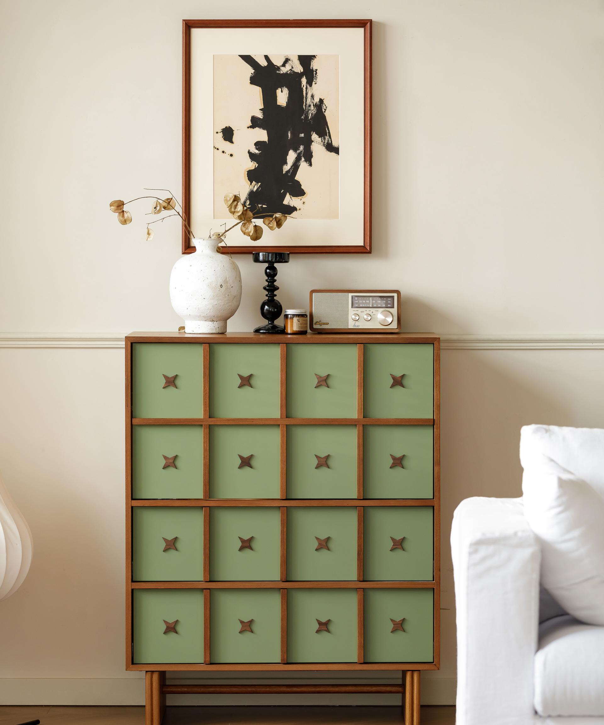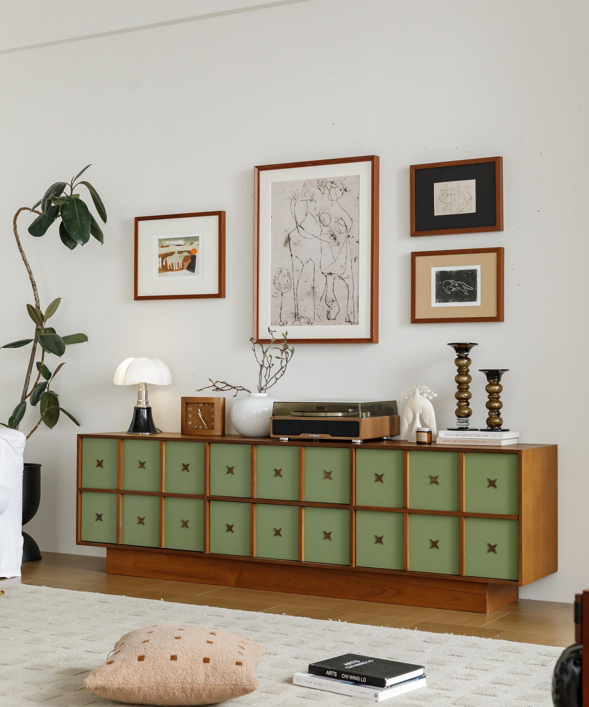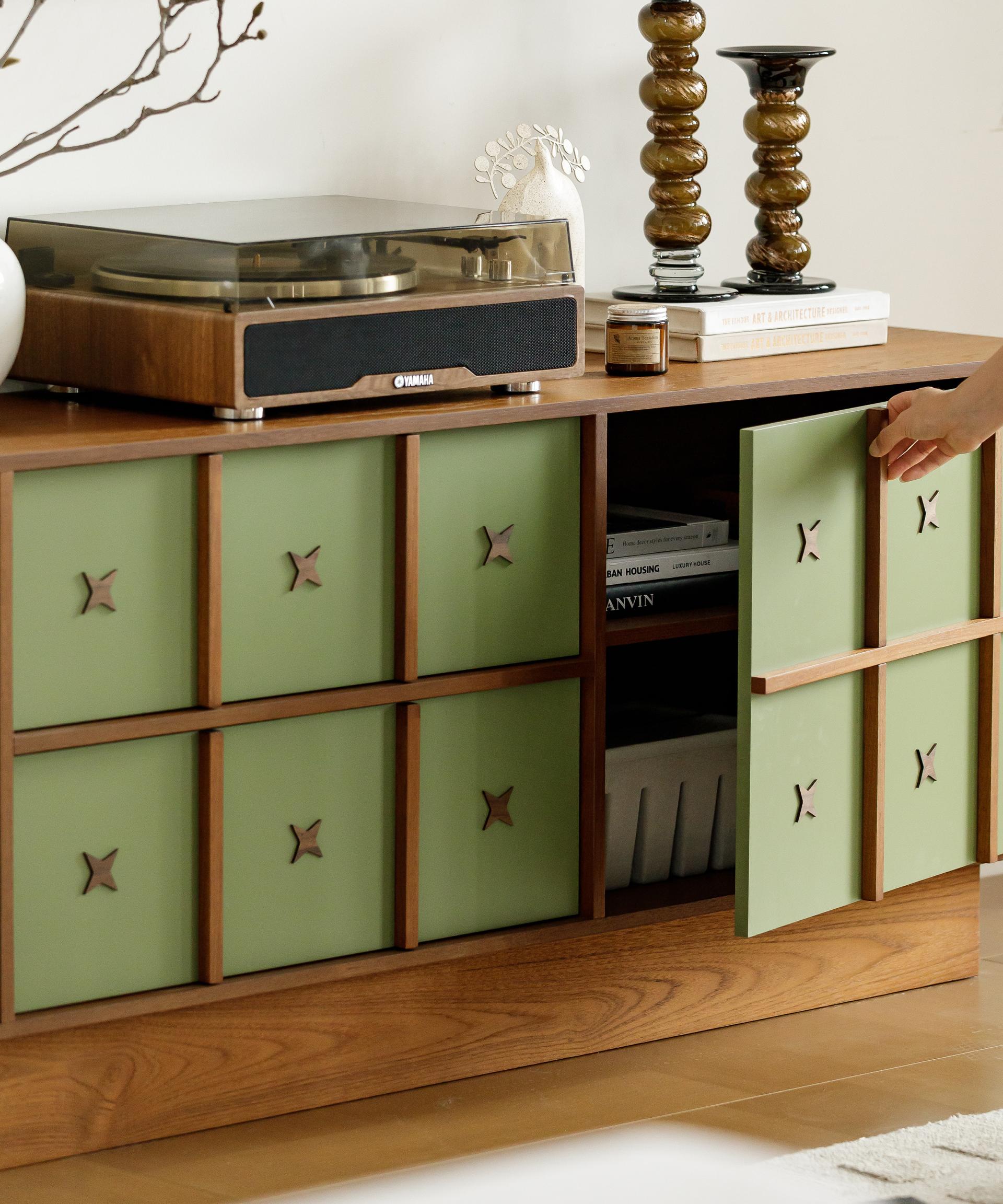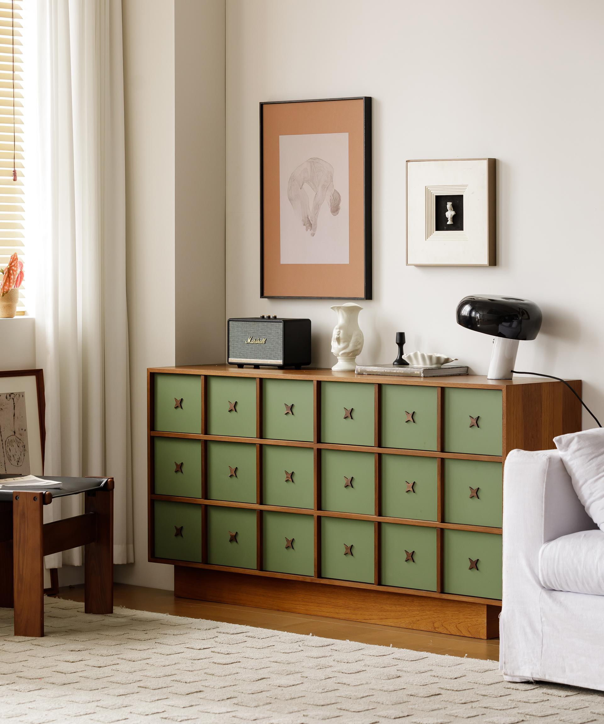 Using “stars” as a central visual motif, the Fanxin Series features a solid walnut drawer front carved in star patterns. The combination of vintage green and golden-brown Burmese teak creates a striking color contrast that seamlessly blends different styles.