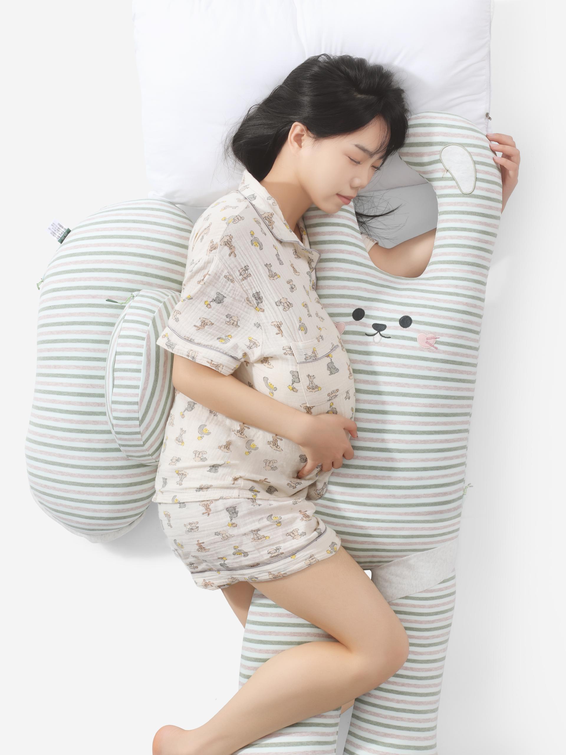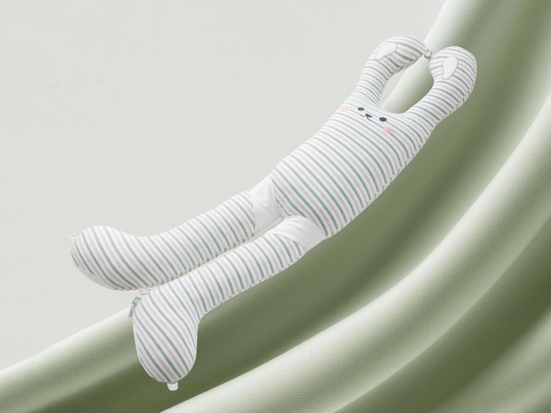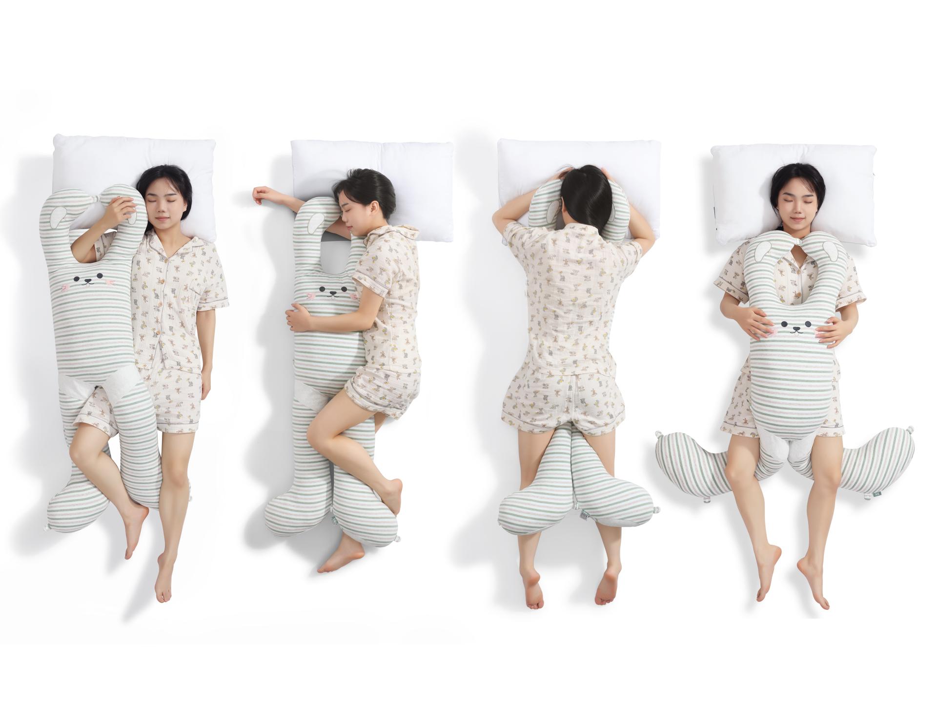 This sleeping body pillow seamlessly integrates innovative structure and premium materials to deliver comprehensive, health-focused sleep support across all scenarios and sleep postures. Designed as an adorable, elongated bunny, it features snap-button connectors on the paws and feet, enabling effortless transformation into various forms—such as a body pillow, hugging cushion, backrest, or prone-sleeping aid—offering versatile functionality in a single, intuitive design. Optional small and large support cushions provide targeted, anatomically precise support for specific needs, such as stabilizing the lower back for pregnant women during side-sleeping or cradling the head and neck for children napping on the stomach. Beyond physical support, the bunny’s soft and endearing appearance adds emotional comfort, creating a holistic companion that nurtures both body and mind.