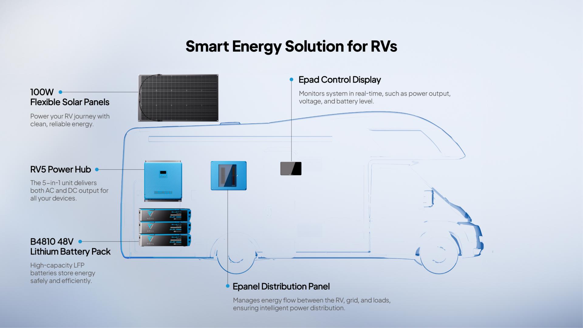 Built on a 48V high-voltage architecture, the RVSolar delivers 30% higher efficiency than traditional 12V systems and provides up to 6kW (AC + DC) of reliable output—enough to power essential appliances such as air conditioners, cooktops, pumps, and lighting. Achieving a full recharge in as fast as 90 minutes, the system supports multiple charging sources, including solar, generator, shore power, and vehicle alternator. Its modular design is expandable up to 122 kWh, supporting long-term energy independence.