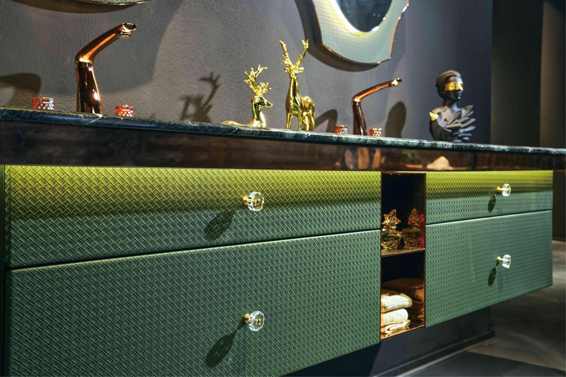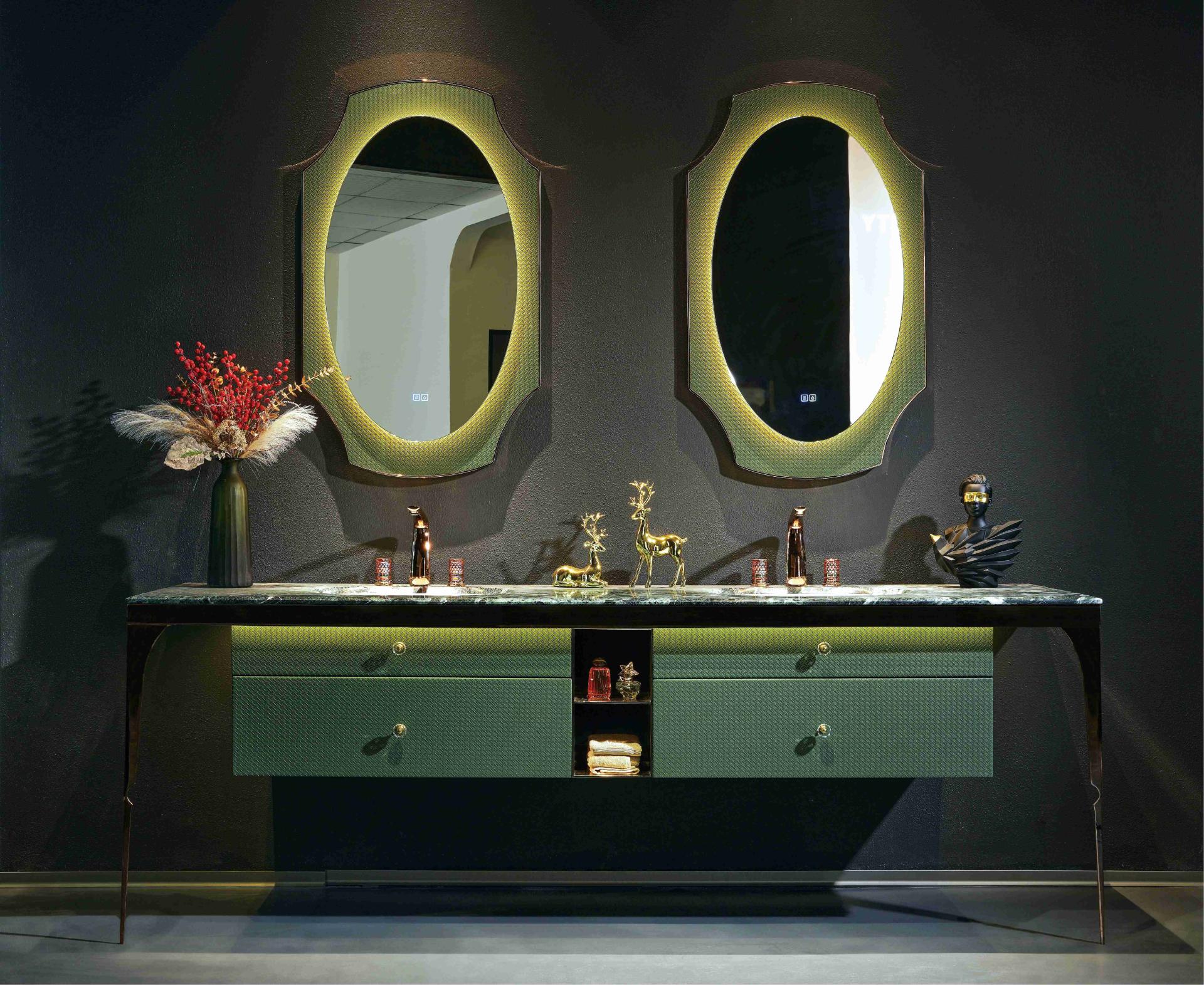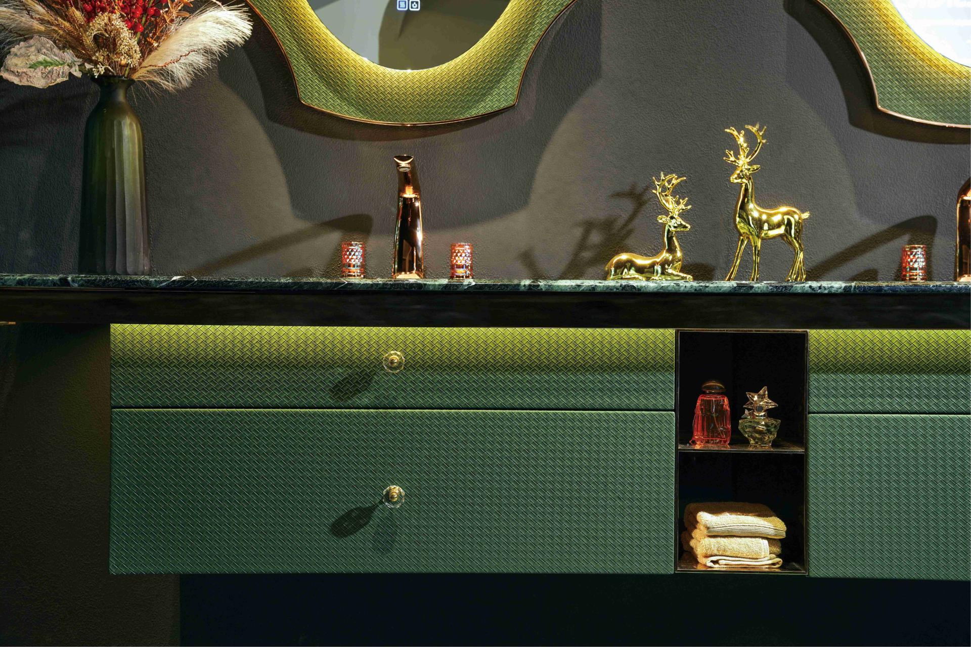 Aesthetically, the design breaks away from the prevailing muted minimalist style. Instead, it combines a high-saturation deep green with elegant rose-gold metal to create a distinctive natural yet lightly luxurious visual language. This bold color contrast makes the cabinet the visual anchor of the bathroom, meeting contemporary users’ pursuit of personal expression and a refined lifestyle. Structurally, it abandons the conventional bulky, rectangular form. By separating the cabinet from its slender metal base, it is visually lightened. Additionally, the balanced proportions bring visual order to the bathroom.