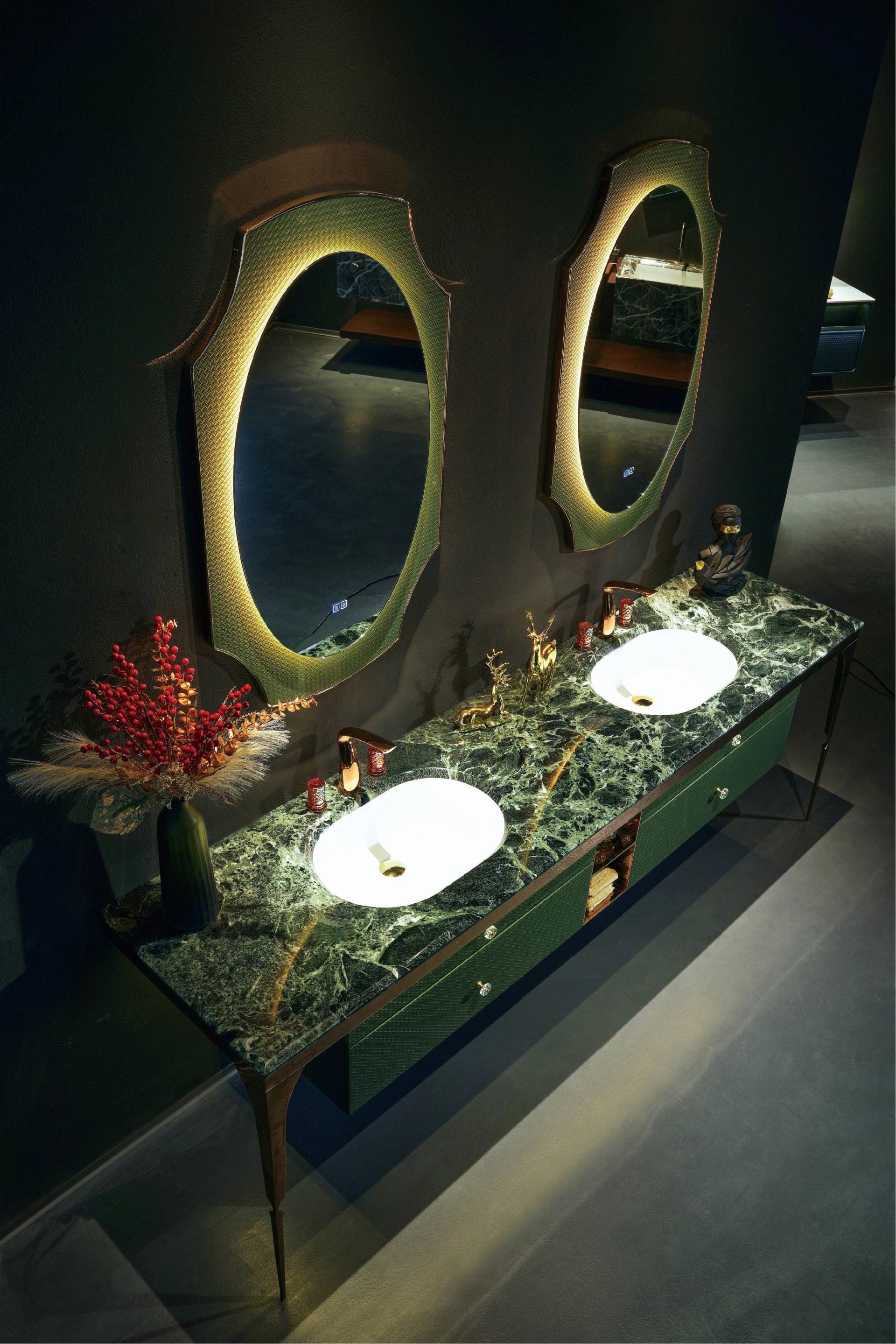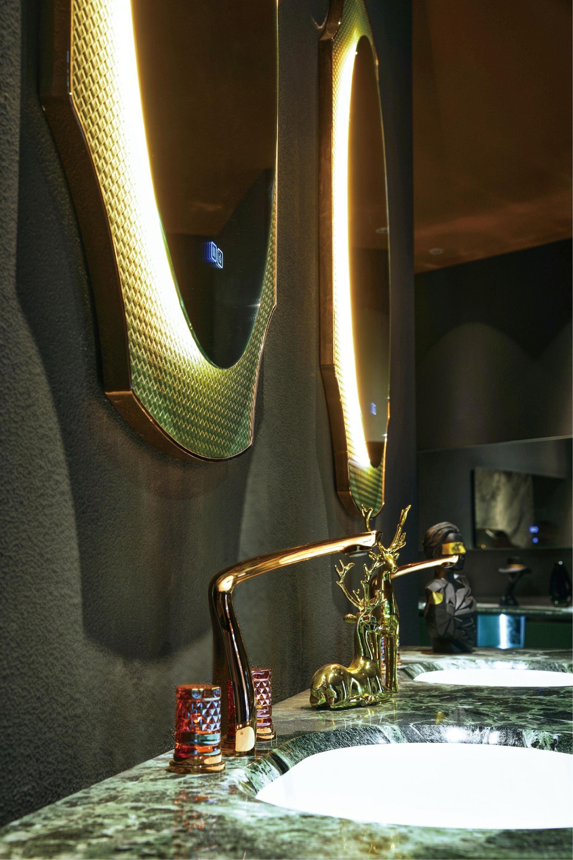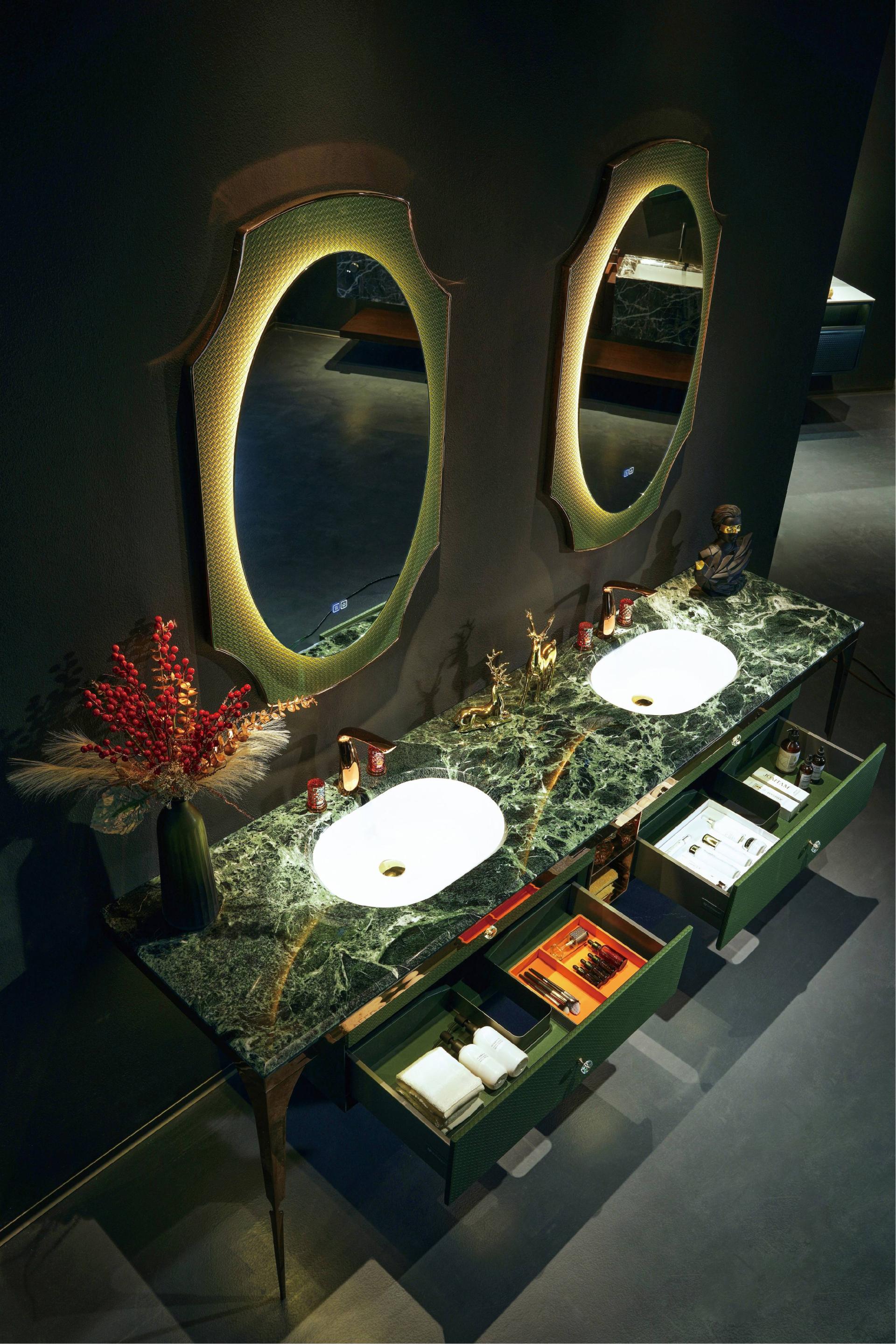 Aesthetically, the design breaks away from the prevailing muted minimalist style. Instead, it combines a high-saturation deep green with elegant rose-gold metal to create a distinctive natural yet lightly luxurious visual language. This bold color contrast makes the cabinet the visual anchor of the bathroom, meeting contemporary users’ pursuit of personal expression and a refined lifestyle. Structurally, it abandons the conventional bulky, rectangular form. By separating the cabinet from its slender metal base, it is visually lightened. Additionally, the balanced proportions bring visual order to the bathroom.