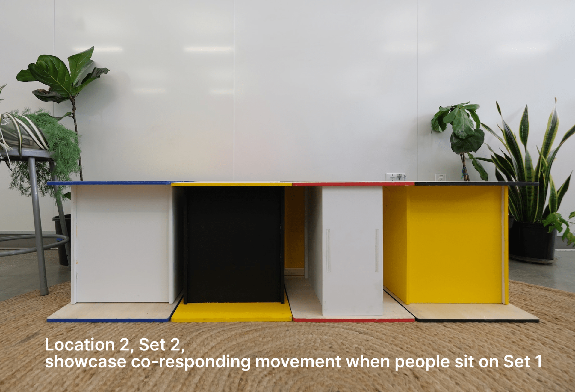 The design consists of two identical modular block chairs, each composed of independent, pressure-sensitive cubes. Every movement—sitting, leaning, shifting—triggers a corresponding physical response. The cubes in the distant chair rise and fall in synchrony, creating a mirrored interaction: an evolved seesaw that transmits presence and touch between remote participants.