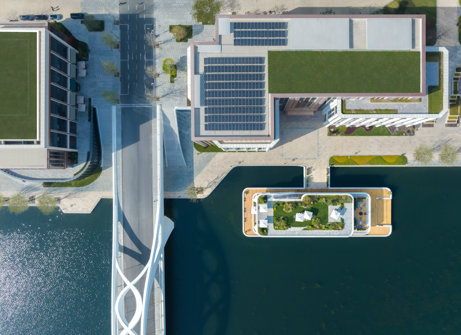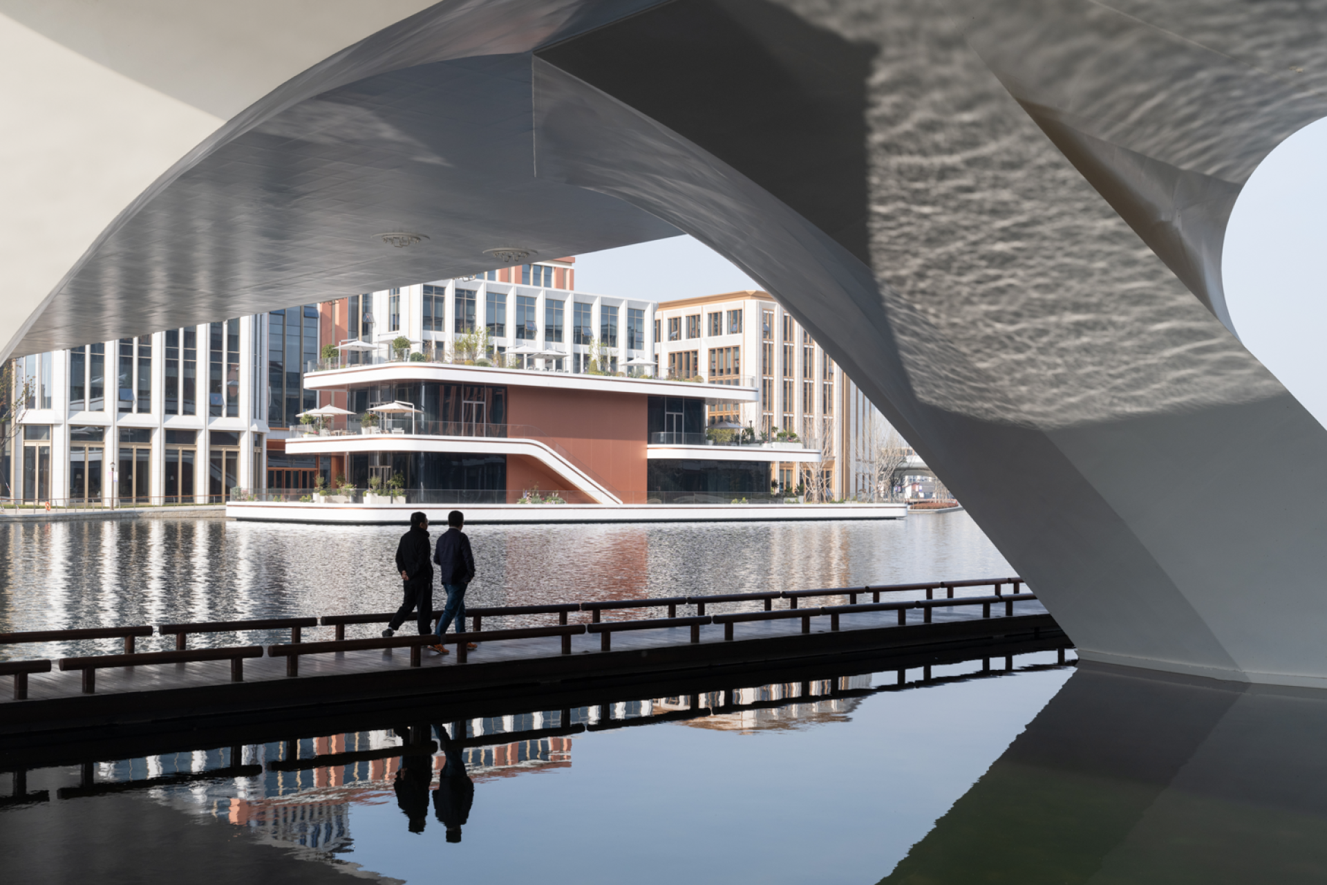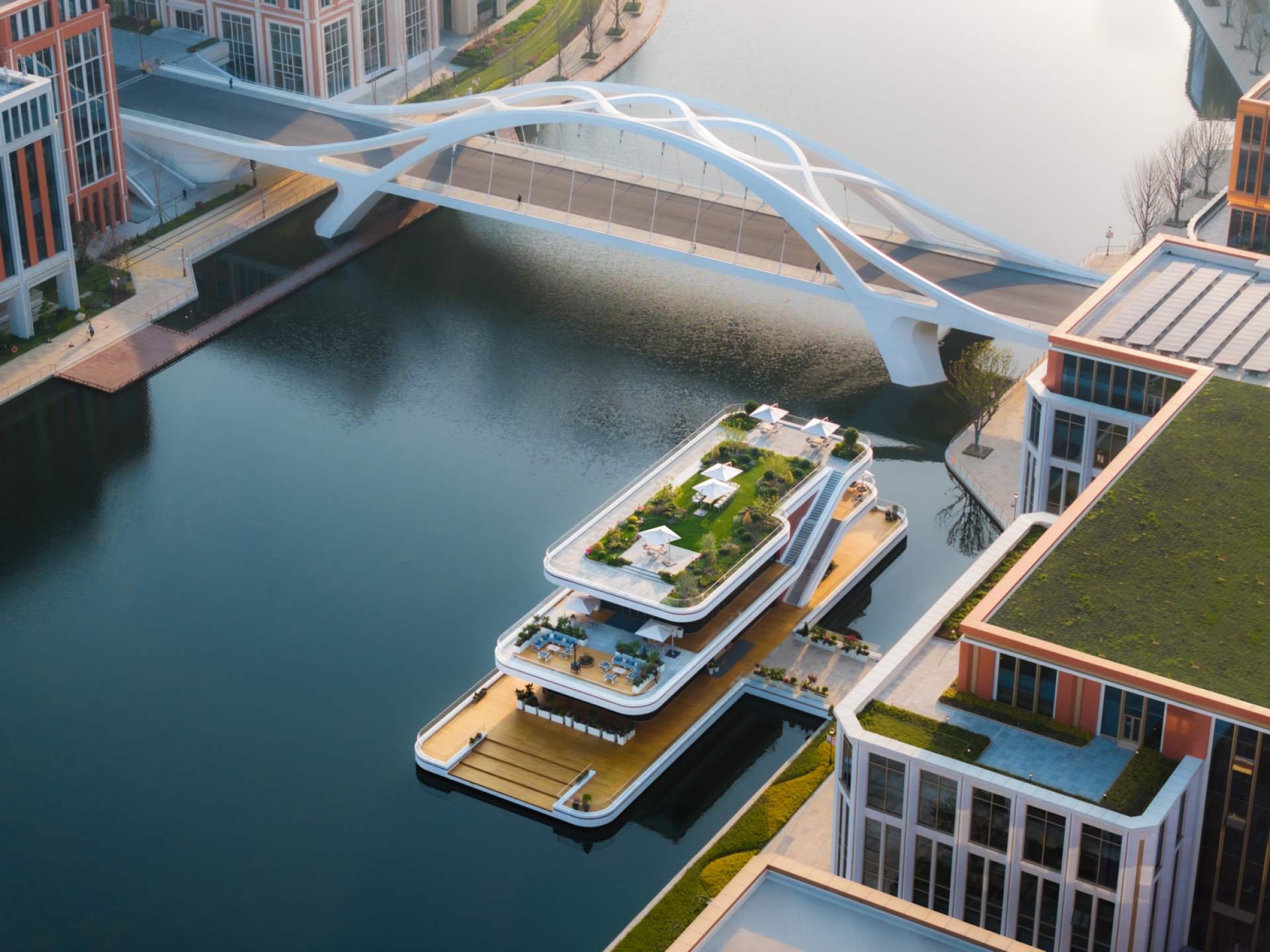 The Huawei Qingpu Industrial Park Ship-Shaped Roof and Terrace project is envisioned with the themes of “Connection, Transformation, and Creation.” By integrating the boathouse with the waterfront revetment, bridges, and office axis, the design establishes a landmark focal point within the campus. The first and second floors house restaurant spaces with waterfront terraces, enhancing social and leisure functions, while the rooftop garden creates an aerial public hub that blends dining, recreation, and landscape. Through spatial layering and immersive waterside experiences, the project redefines conventional design to provide a distinctive and shared destination for employees and visitors.