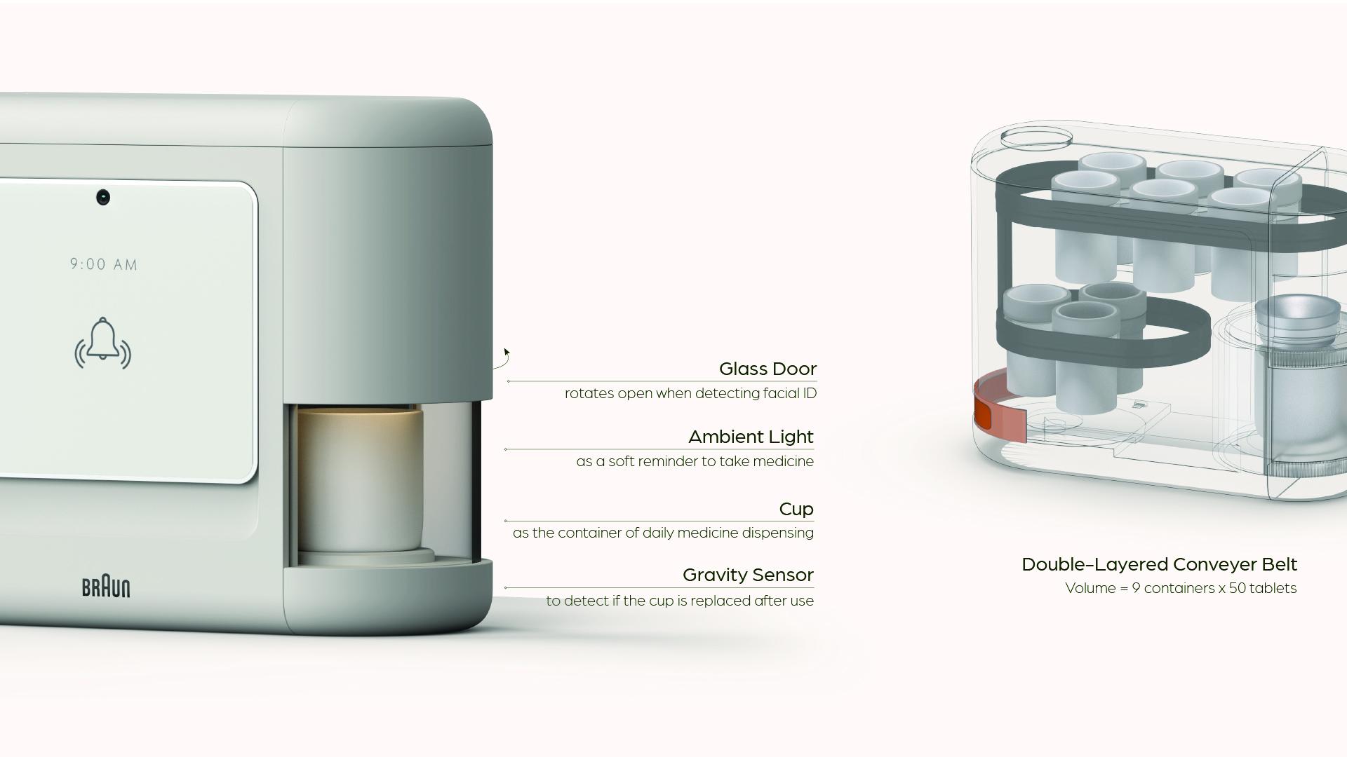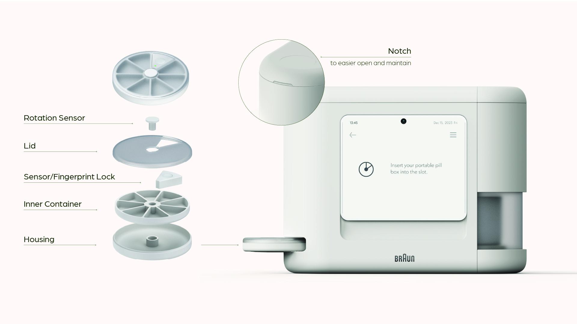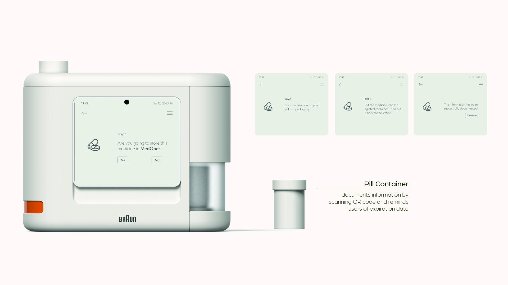 MedOne is an all-in-one home healthcare system with a medication station and portable pillbox. It streamlines storage, dispensing, and tracking, reducing errors and stress while reflecting Braun’s timeless minimalism and user-centered design.