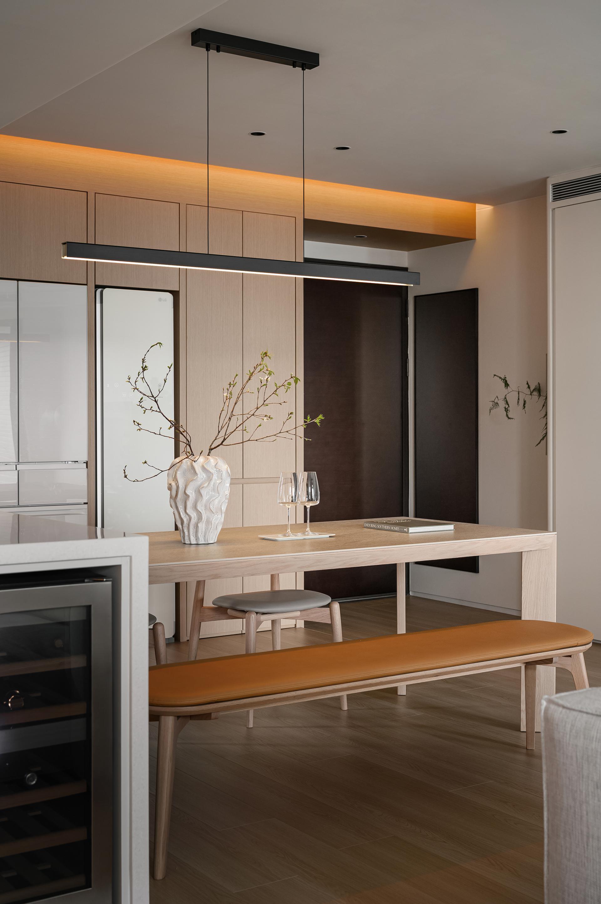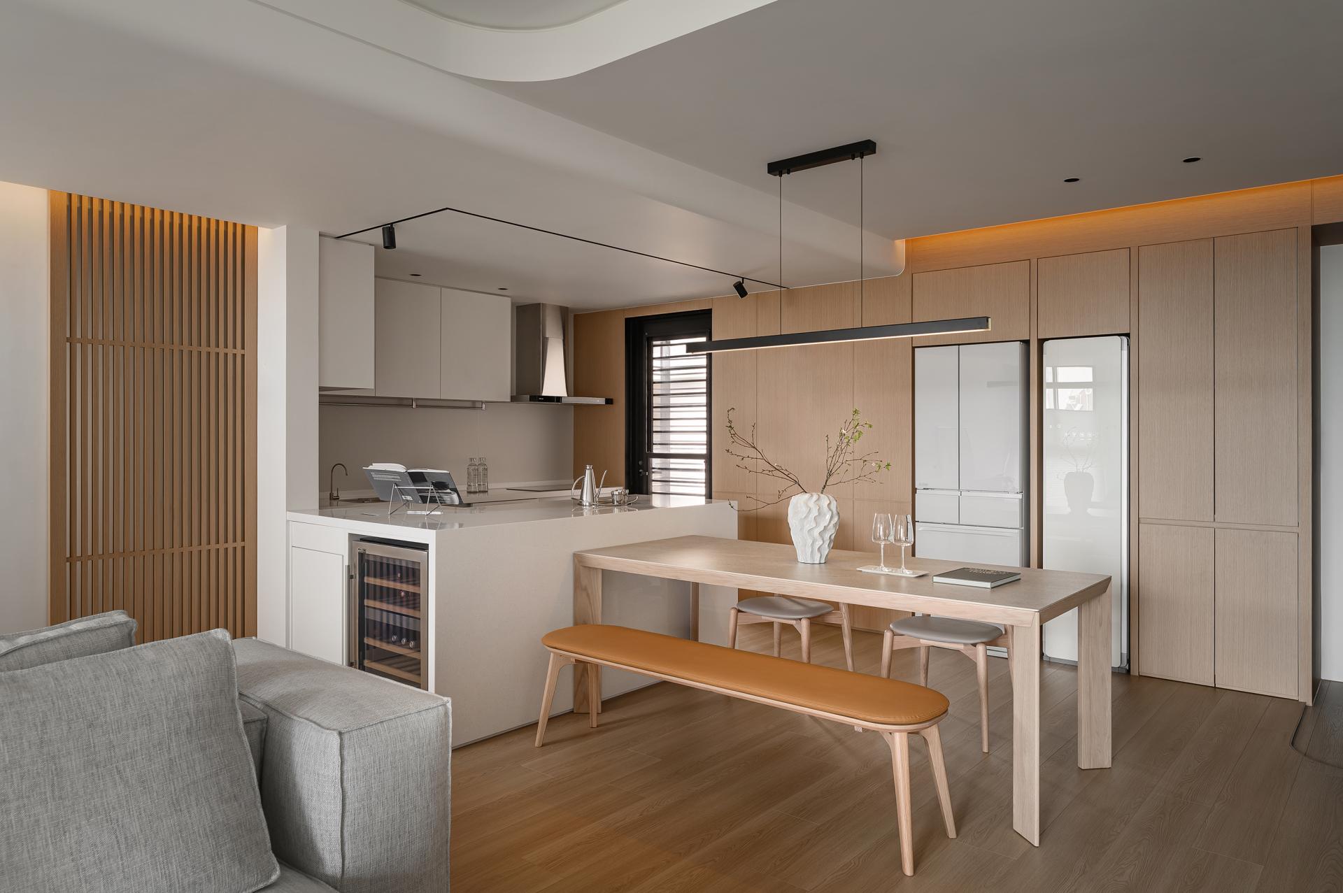 At the heart of the residence, the kitchen island becomes the core of both interaction and visual balance. Beyond integrating storage and food preparation, it links the living and dining areas, evolving into the household’s central node of connection. Circulation flows clearly and naturally, while textures and light weave together layers of perception—bridging the “visible ties of daily life” with the “invisible warmth of emotion.” In this way, the home transcends its role as a vessel for living, becoming instead a gentle archive of family stories, quietly recording moments of growth, companionship, and a sense of belonging.