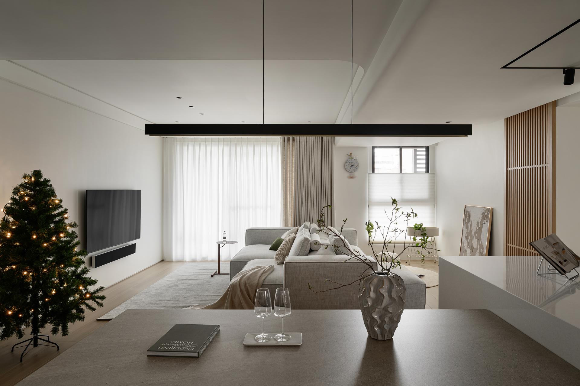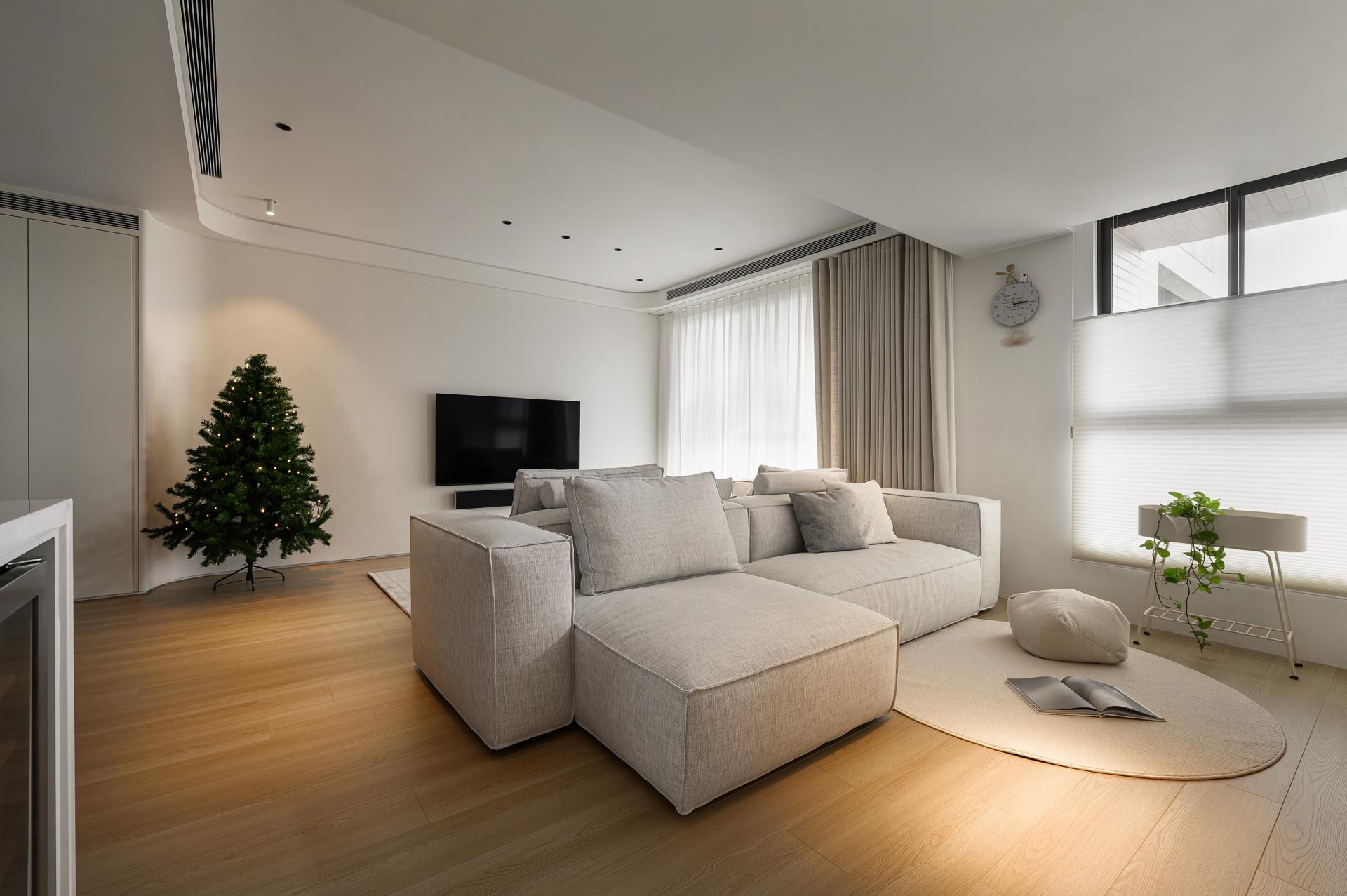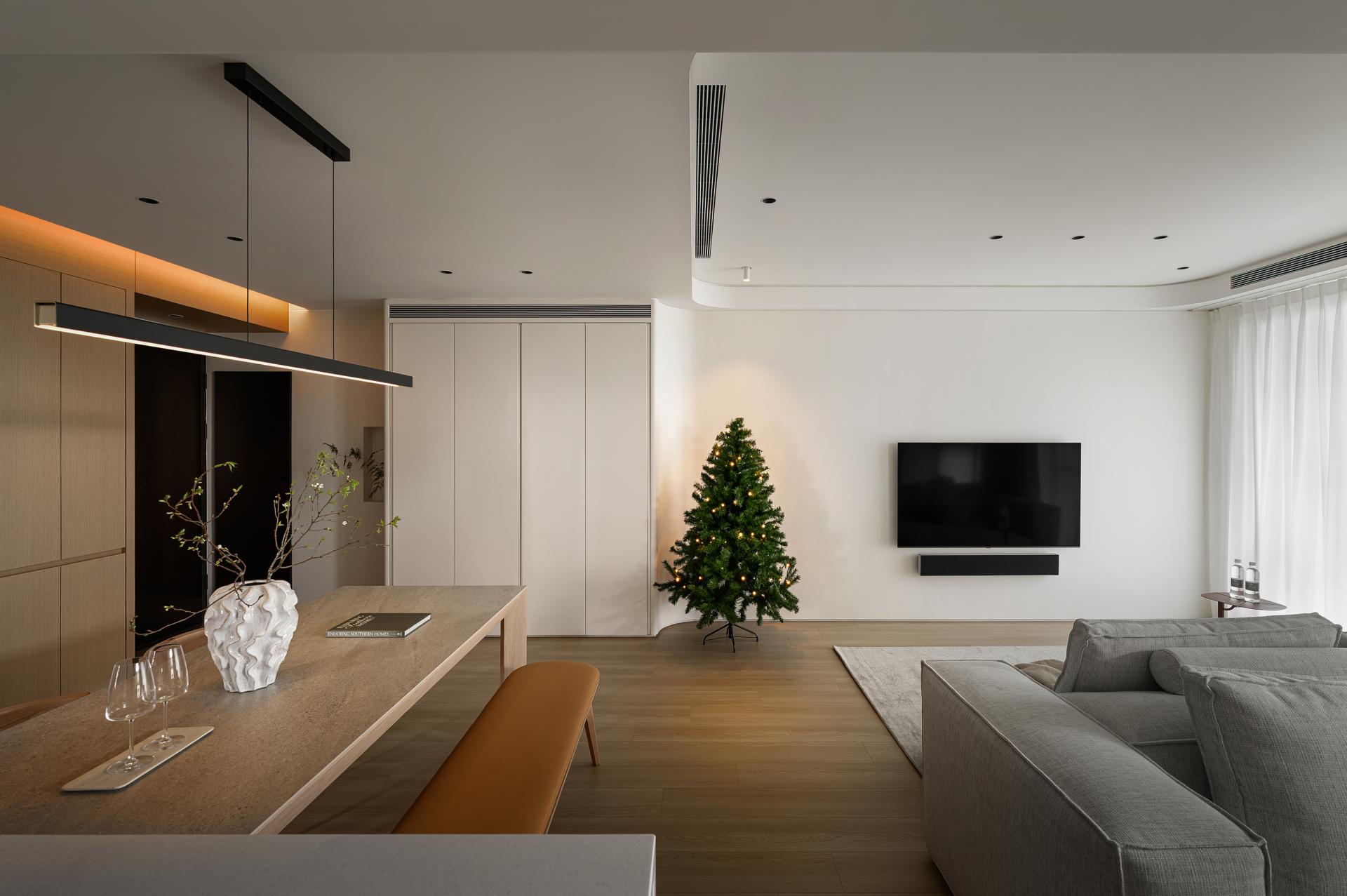 To achieve the homeowner’s custom of decorating a Christmas tree each year, the design reserves a dedicated 70 cm diameter spot at one side of the TV wall, complete with its own downlight, creating a festive display corner. The living room seating features a dual-facing arrangement: the front zone is designed for viewing entertainment, while the rear serves as an open play area, allowing homeowners to watch movies while accompanying their children.