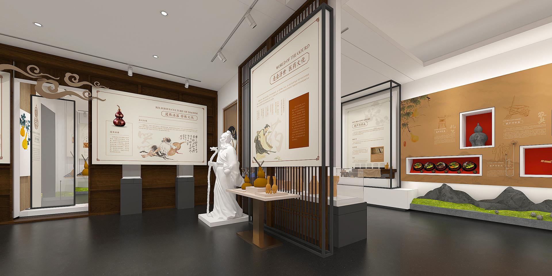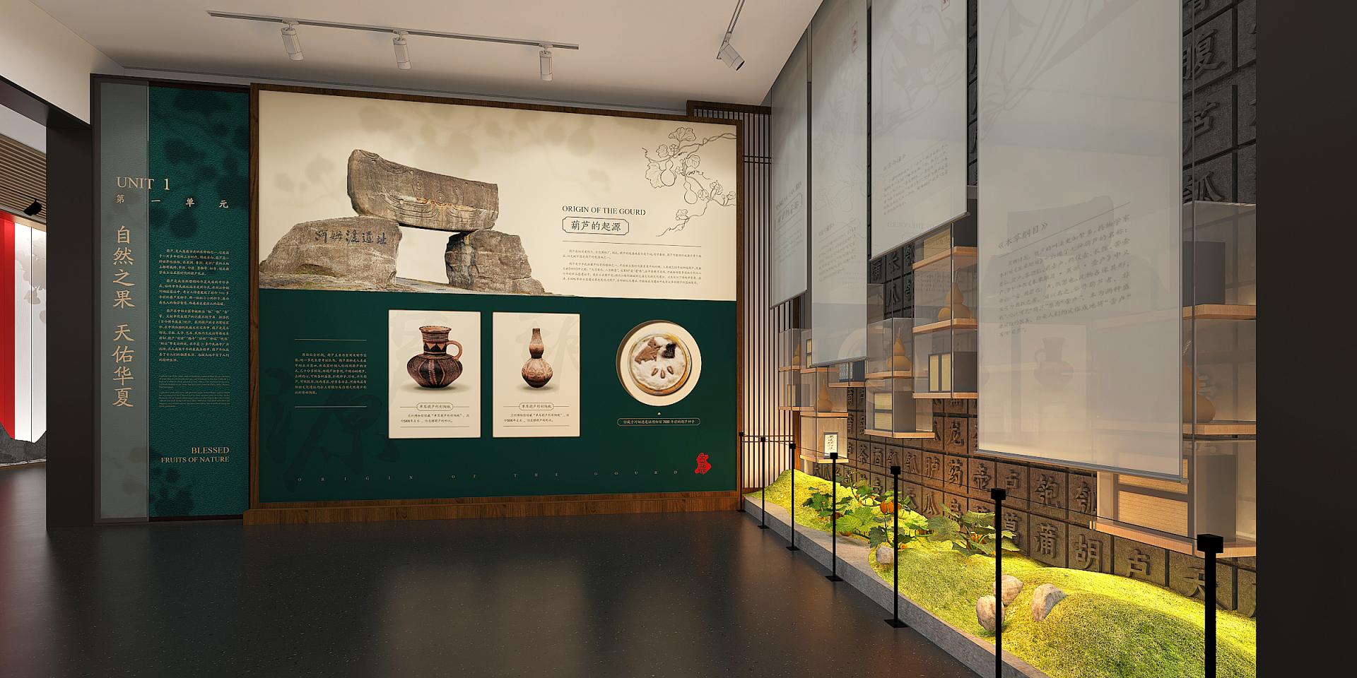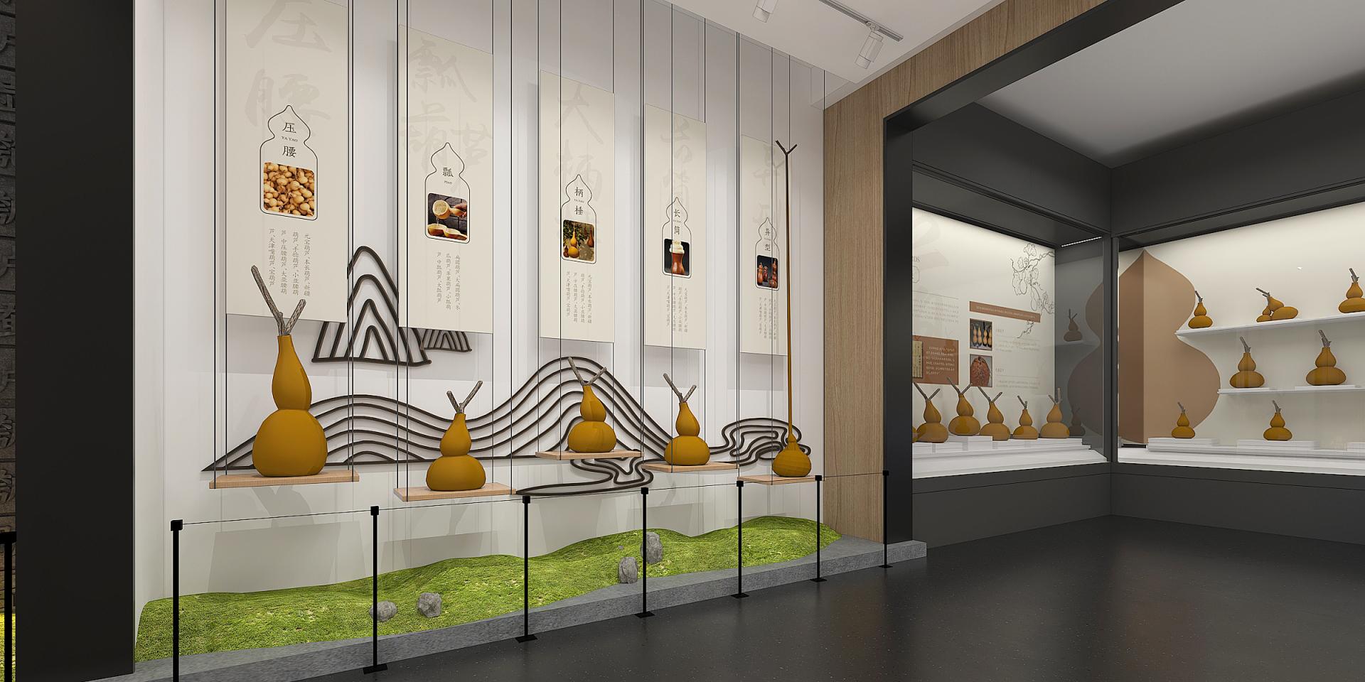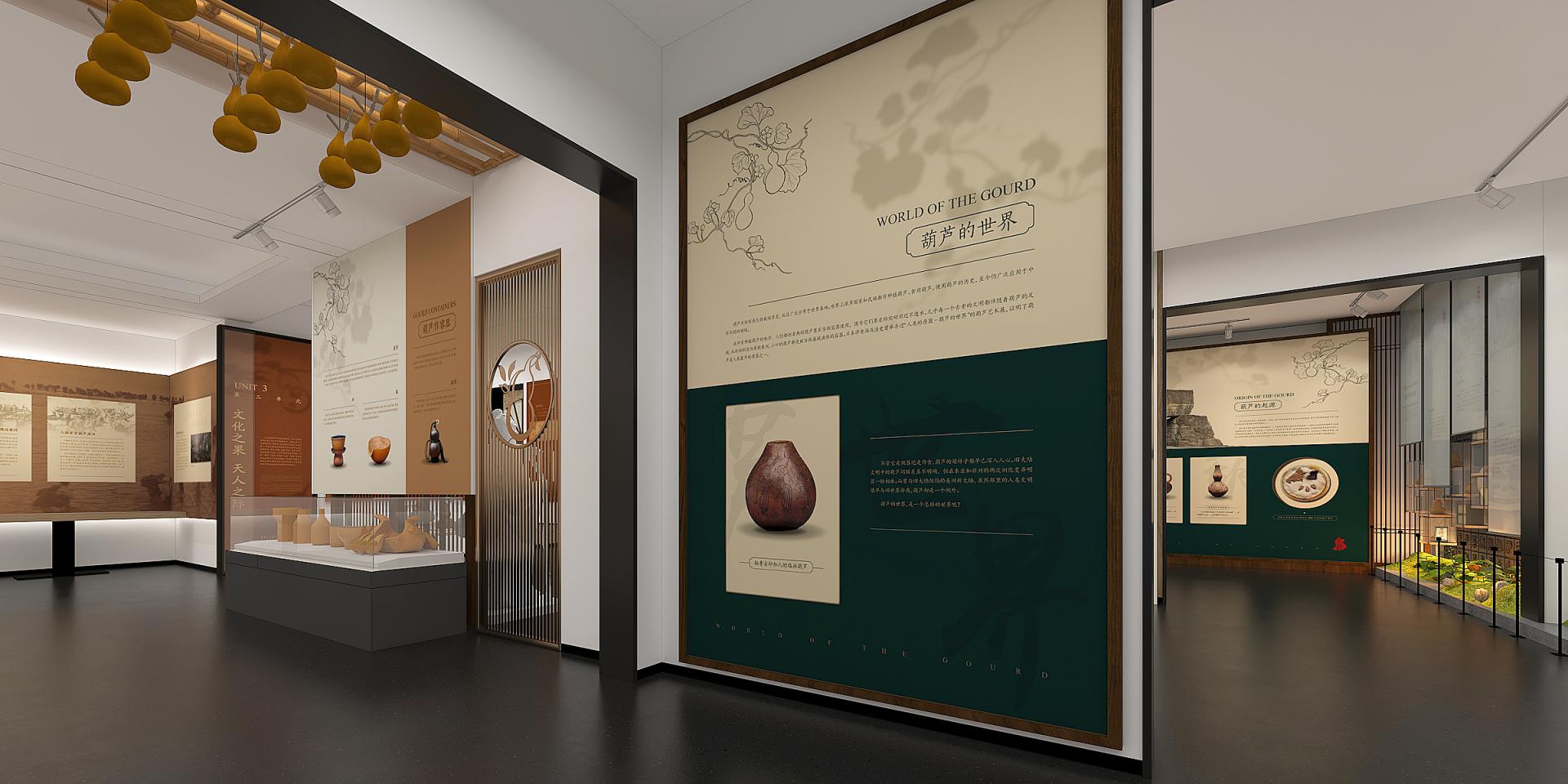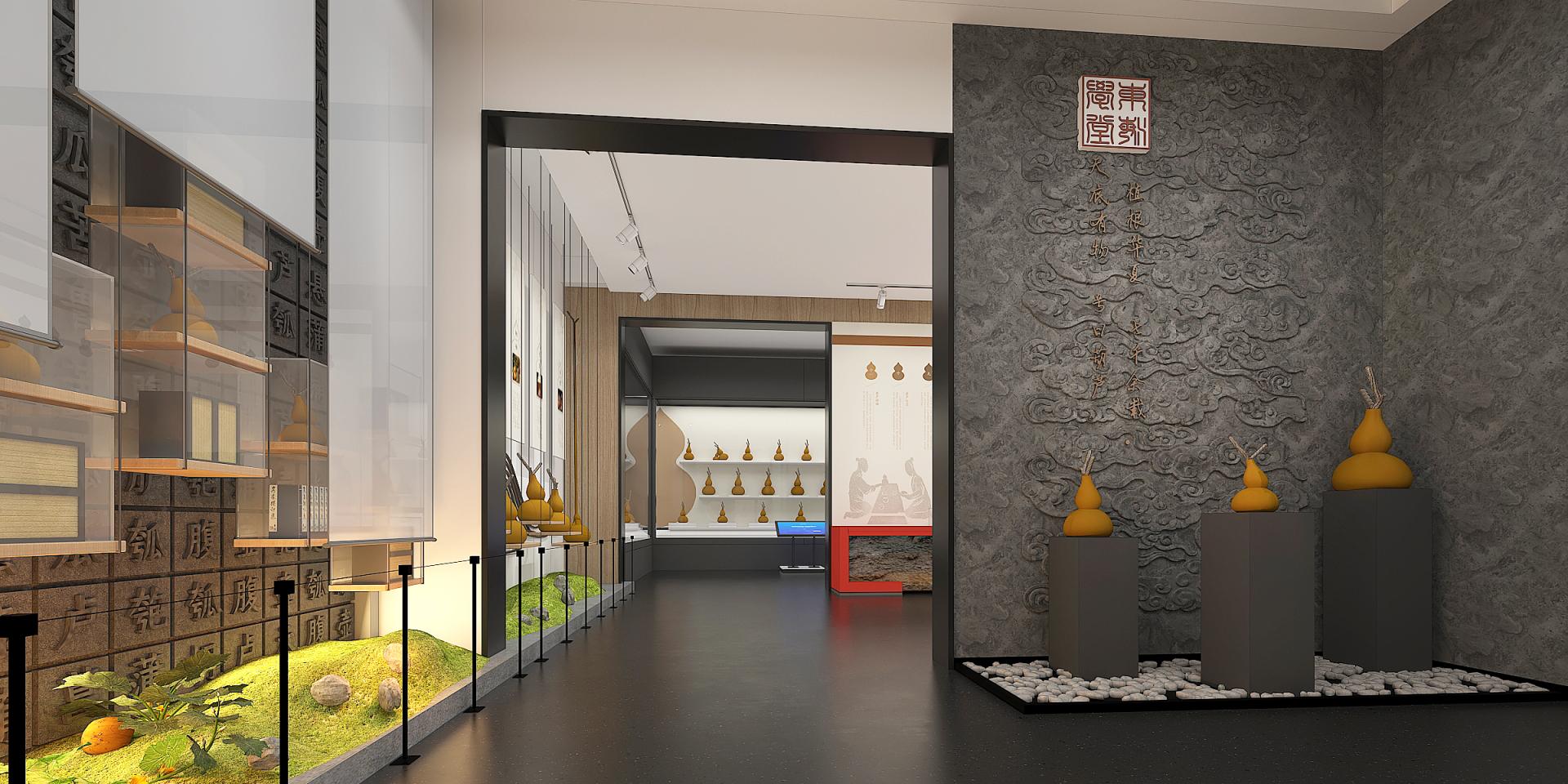 设计中,满墙葫芦艺术装置、木质格栅、祥云浮雕等传统元素与透明展柜、现代灯光相得益彰,苔藓山石、葫芦藤蔓等自然意象穿插其间,让传统葫芦文化在沉浸式体验中焕发新生,实现文化传承与当代审美、空间艺术与叙事功能的有机统一。既还原葫芦生长的本真意趣,又通过当代艺术化表达,让葫芦从实用器物到文化载体的蜕变清晰可感。