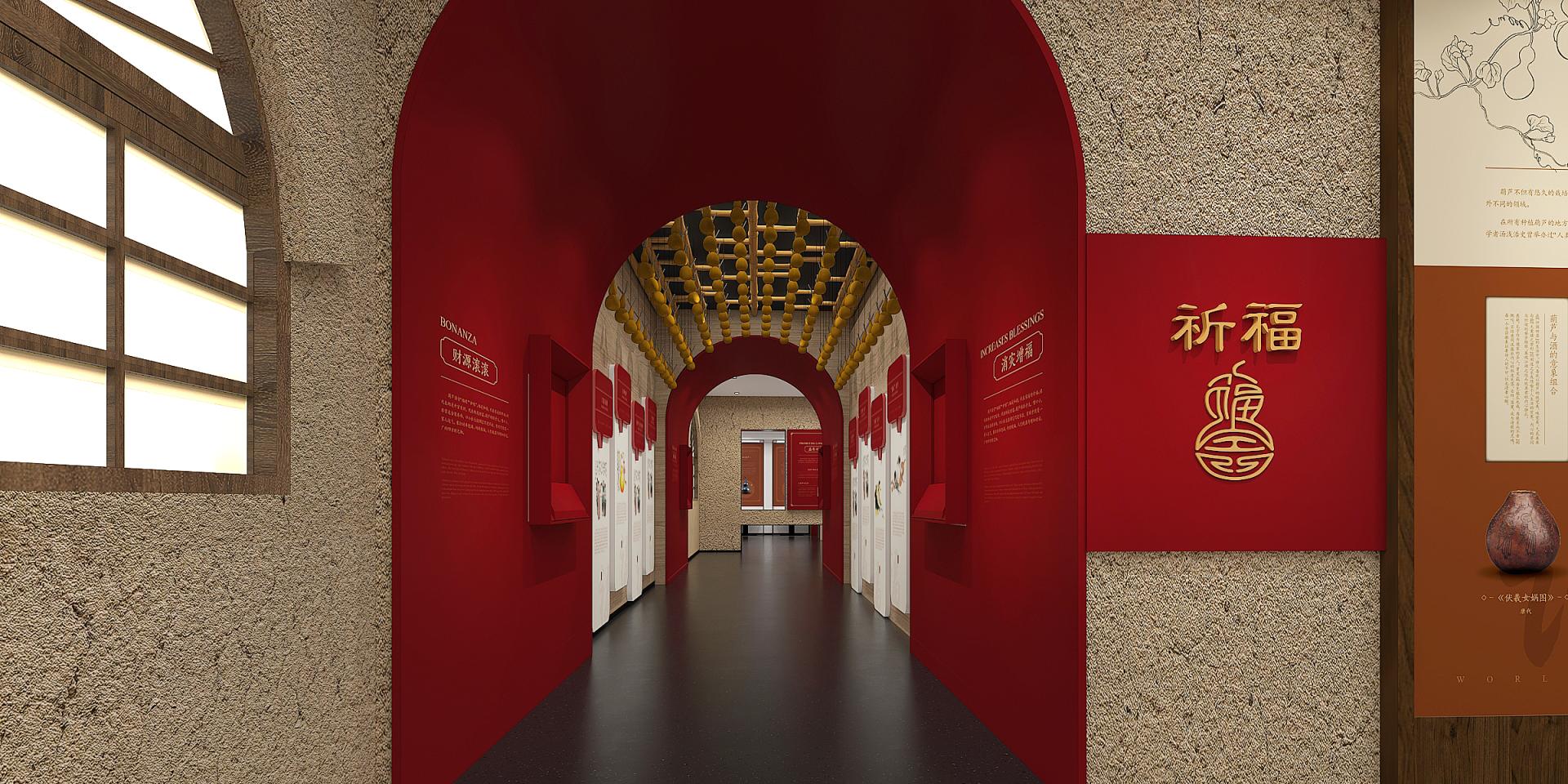 展陈以葫芦文化演进为脉络,从起源展区的古器陈列,到容器、医药等功能展区的场景化呈现,再到祈福长廊的红色艺术拱廊,层层解构其从实用器物到精神符号的蜕变。