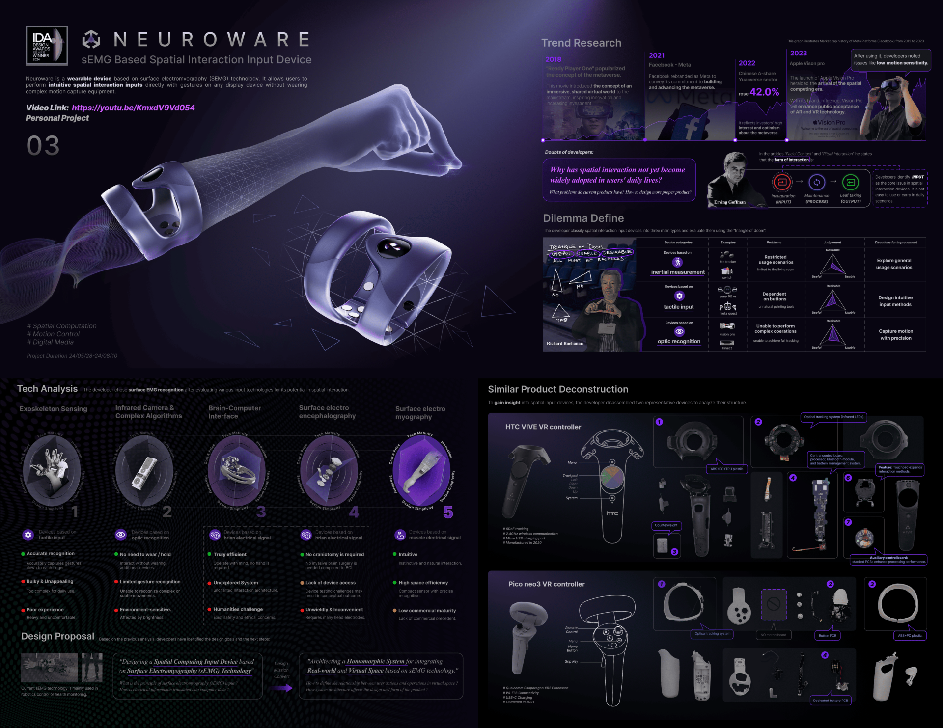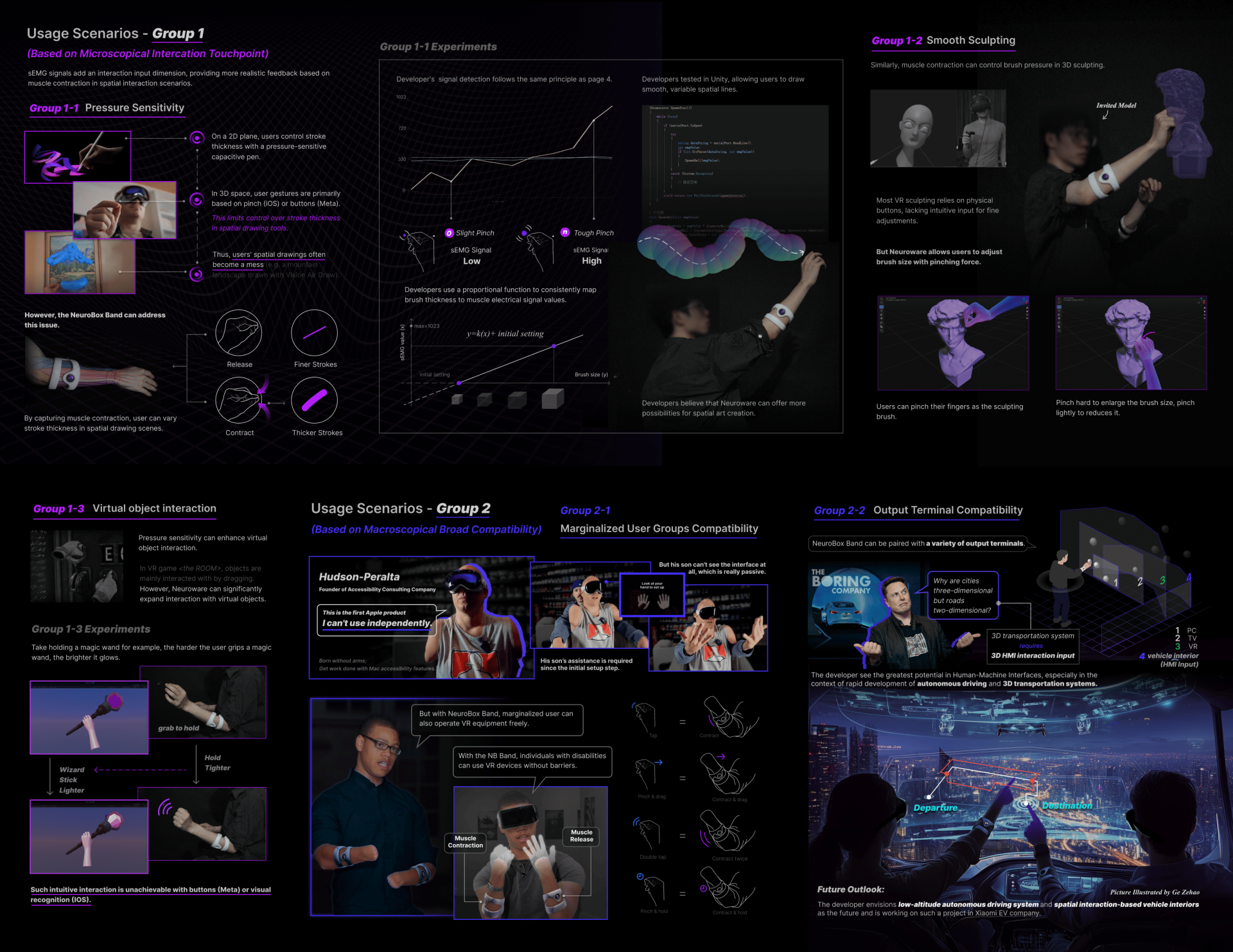 Neuroware is a wearable device based on surface electromyography (SEMG) technology. It allows users to perform intuitive spatial interaction inputs directly with gestures on any display device without wearing complex motion capture equipment.