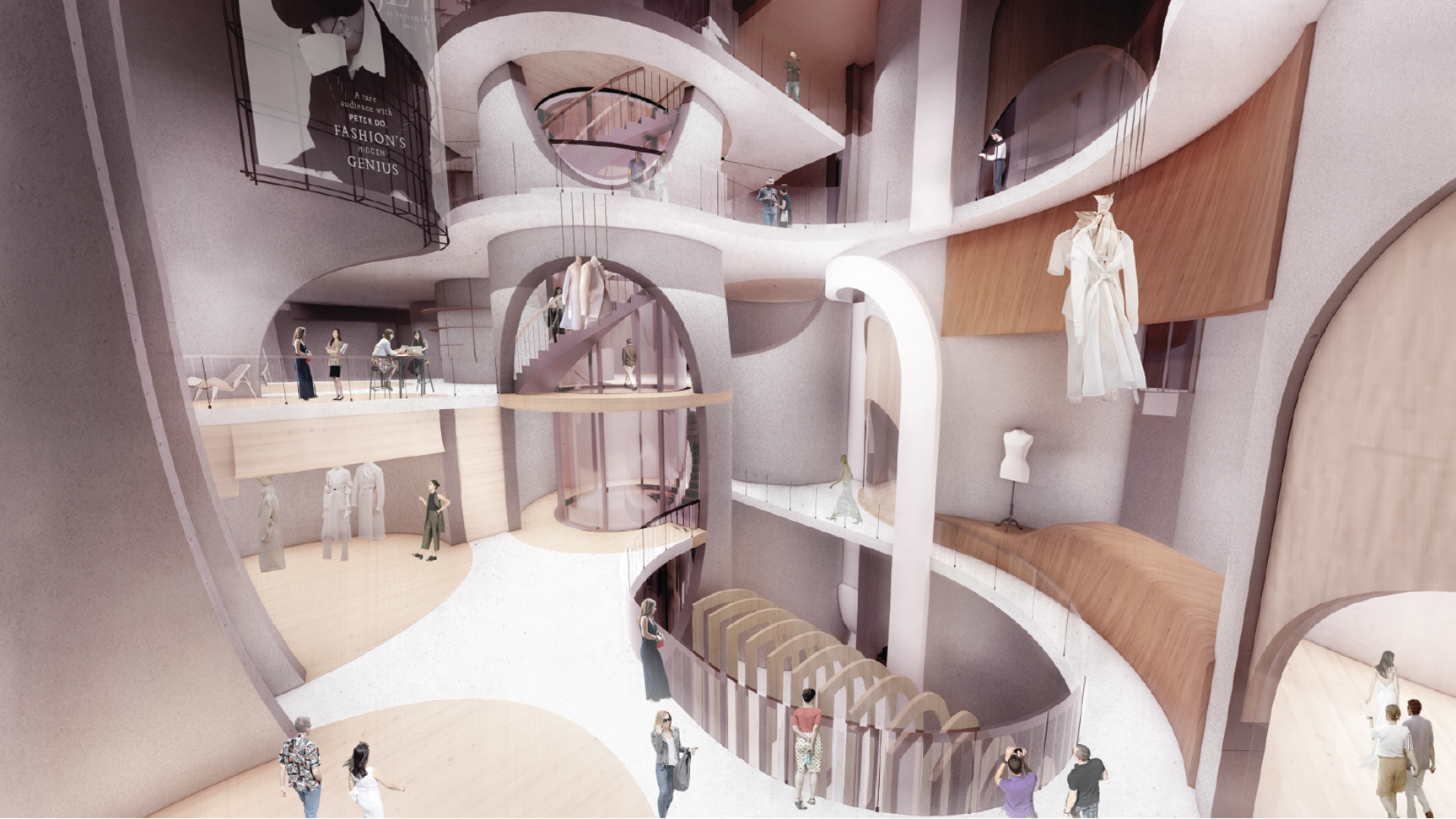 Drawing inspiration from Peter Do’s deconstructivist garments, the façade transforms the concrete frame into a system of folds and layers. Each curved glass opening and platform mimics the rhythm of fabric pleats, creating both structural depth and visual softness. The façade is no longer a static skin; it breathes, shades, grows, and performs as an ecological membrane that connects people, plants, and light.