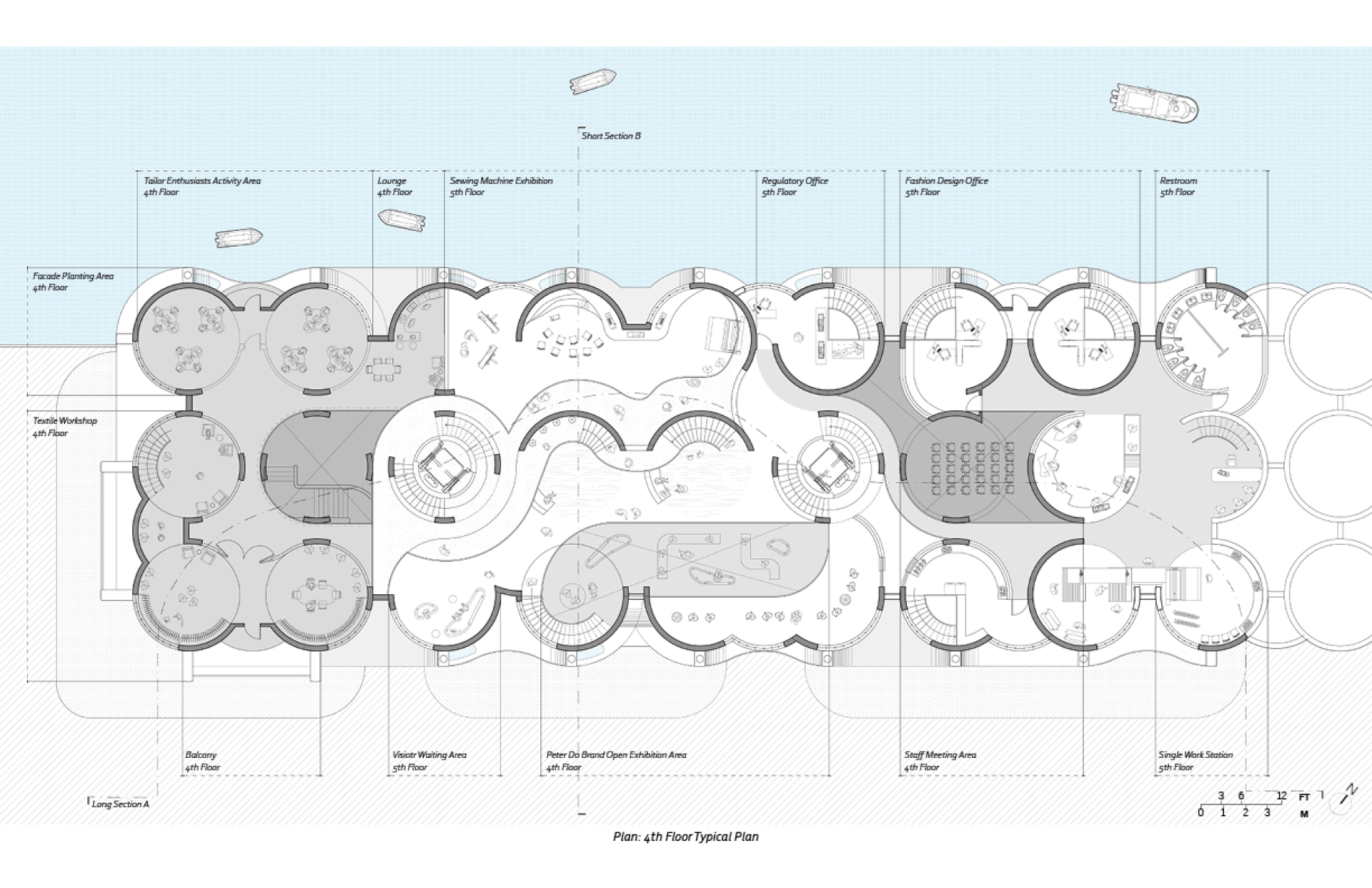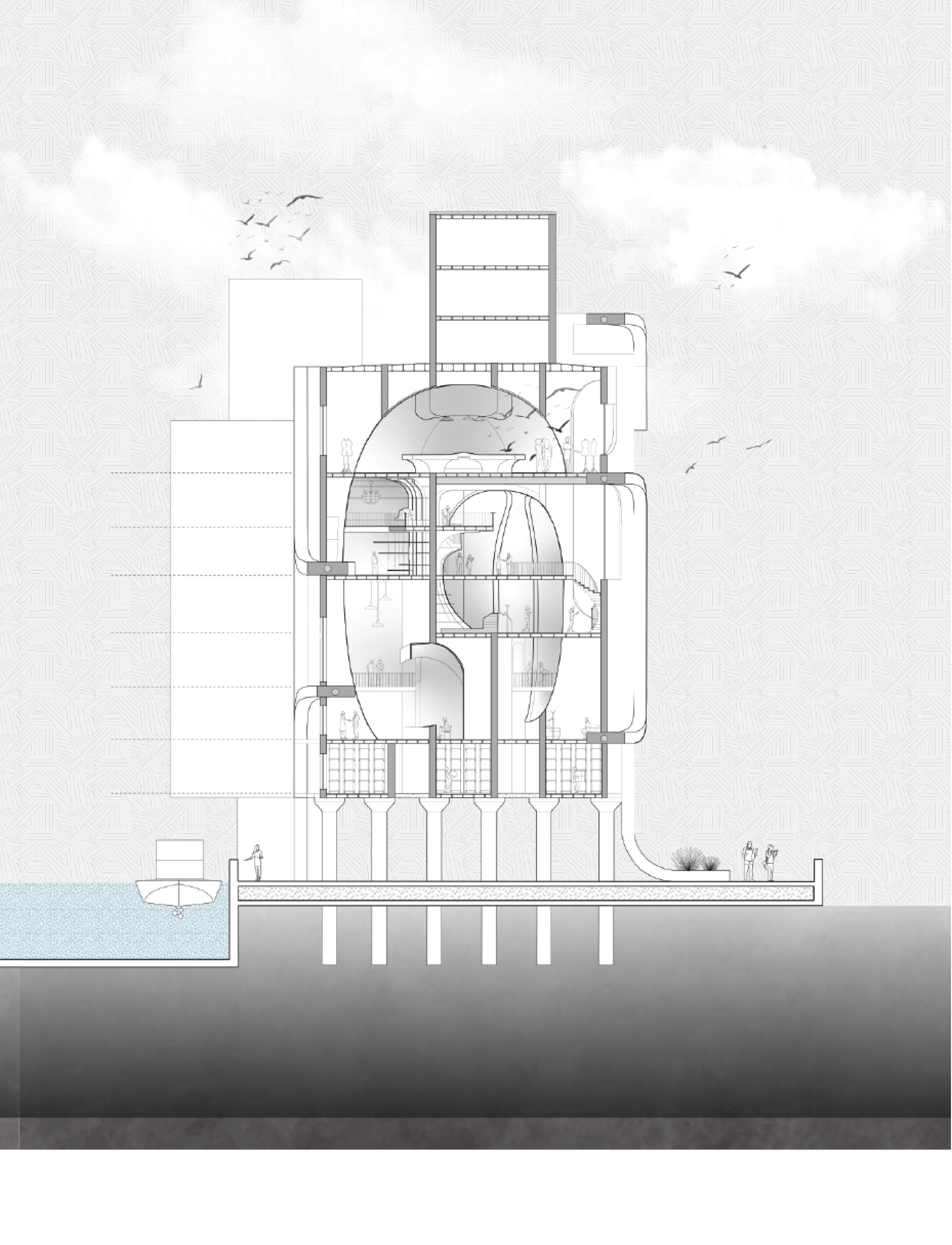 The project rebuilds community identity around the heritage of Red Hook’s tailoring and textile industries. Three intersecting circulation systems for visitors, tailors, and production facilitate encounters between artisans, students, and the public. The architecture becomes a social factory that transforms production into education and exhibition. By merging labor, learning, and leisure, the building embodies inclusivity and resilience.