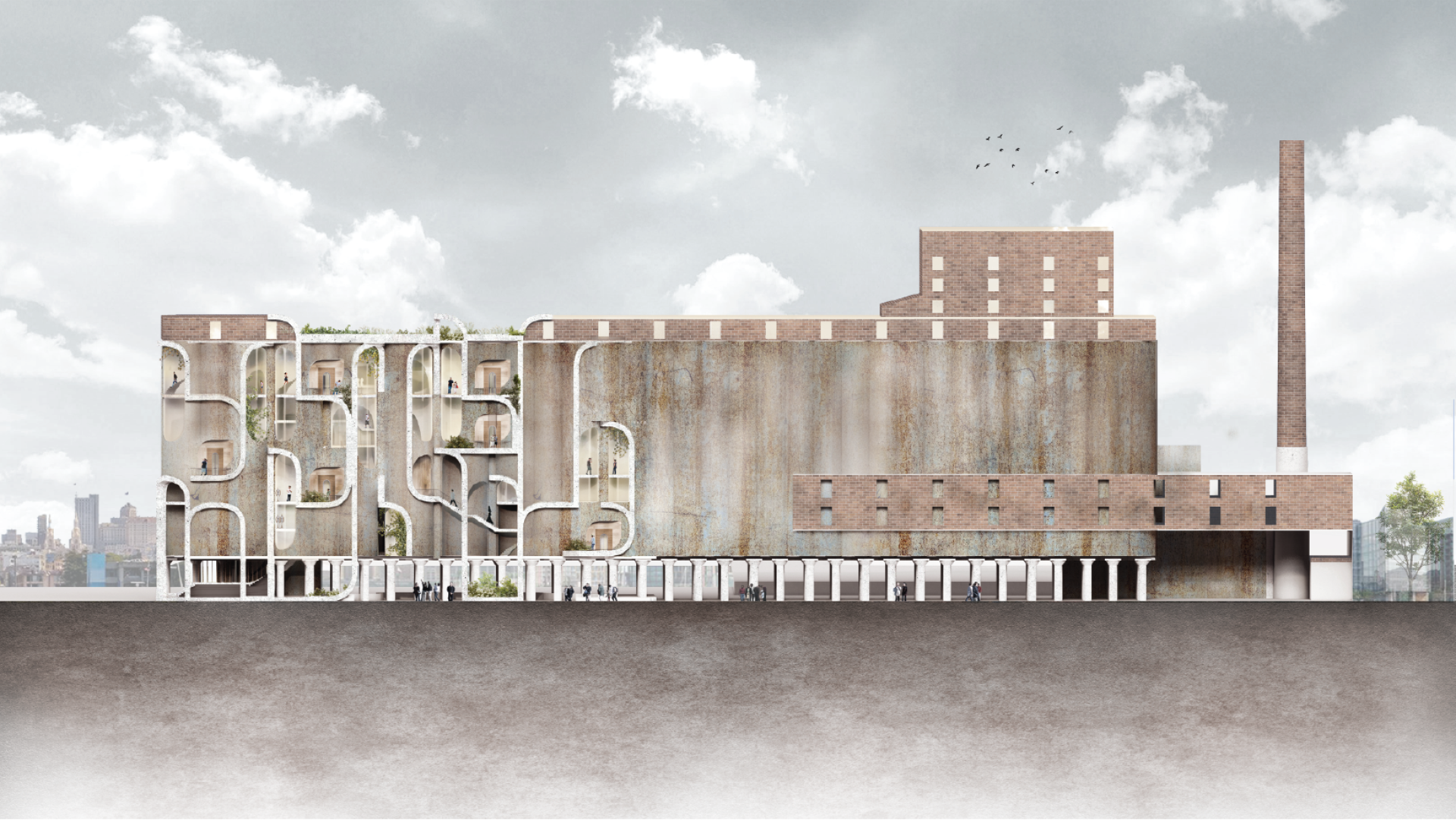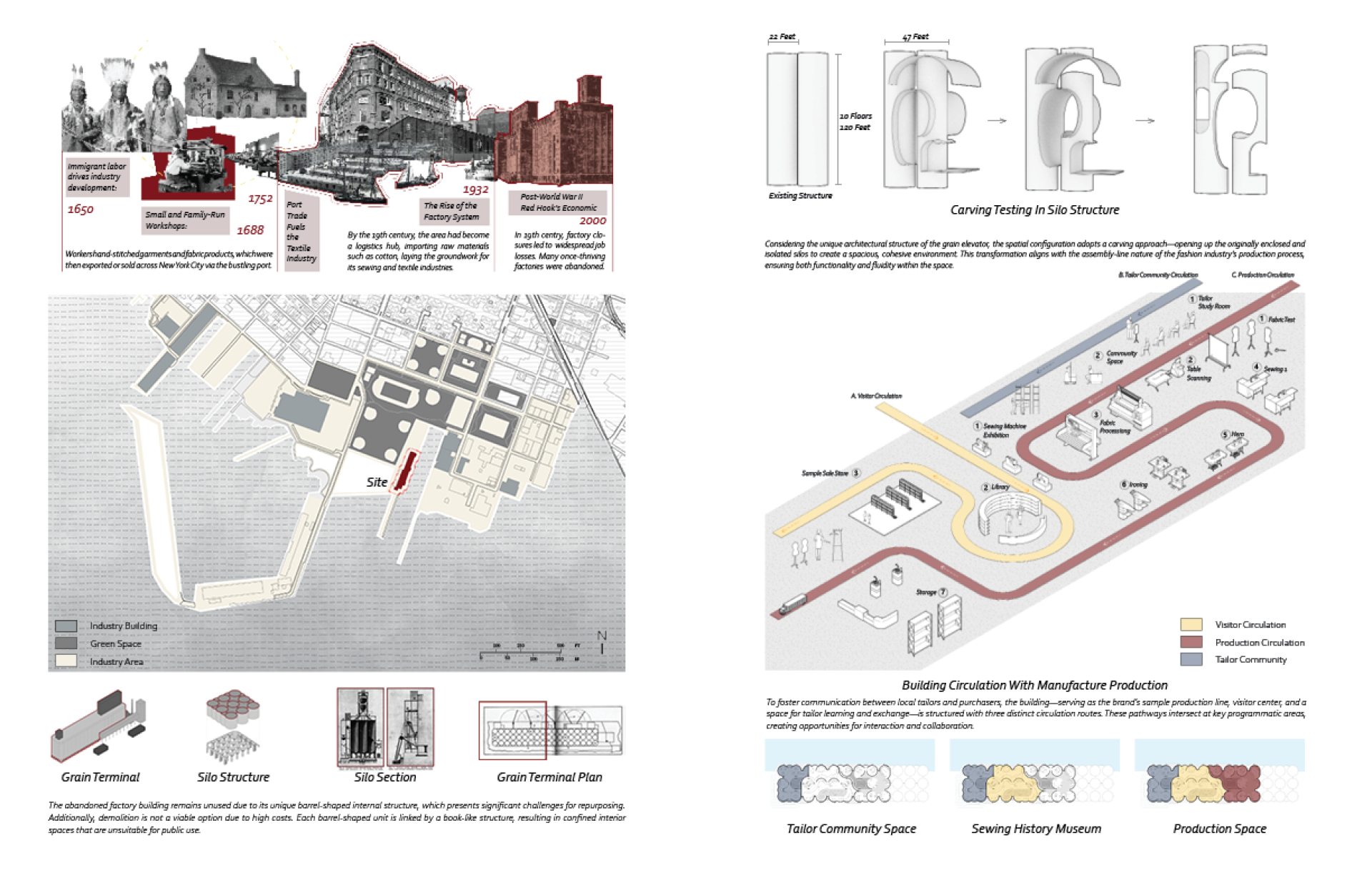 Located in the historic port district of Red Hook, Brooklyn, the project reimagines an abandoned grain elevator as a hybrid of fashion production line, community education hub, and public exhibition space. The design is founded on the belief that sustainability is both environmental and social, and that the reuse of material structures must coincide with the revival of collective memory and craftsmanship.