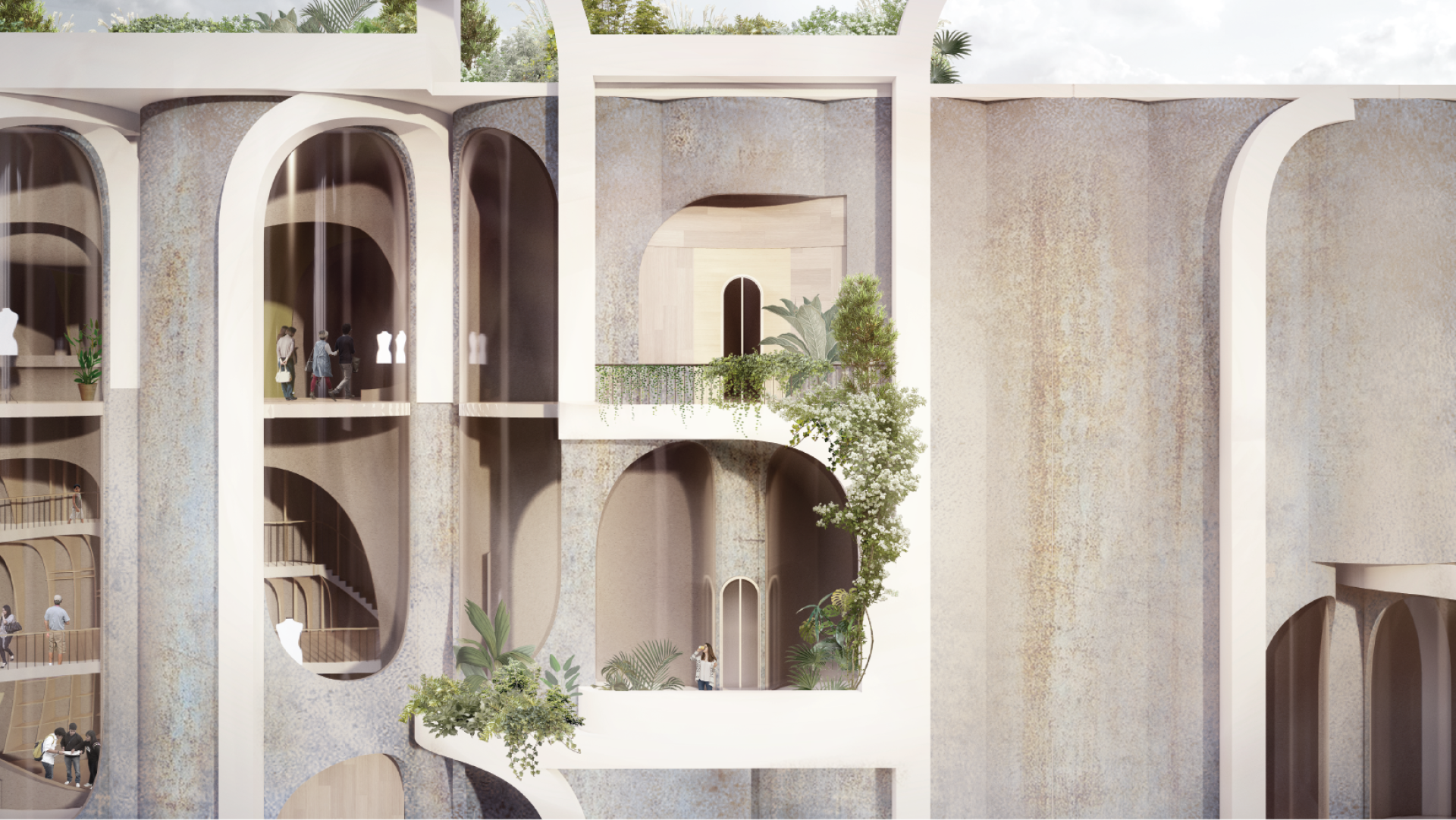 A network of green platforms and catwalks along the façade acts as an environmental filter. Vegetation mitigates heat gain, captures dust, and provides passive shading. Rainwater is harvested and reused through an integrated irrigation system, and interior finishes employ reclaimed wood from local workshops.