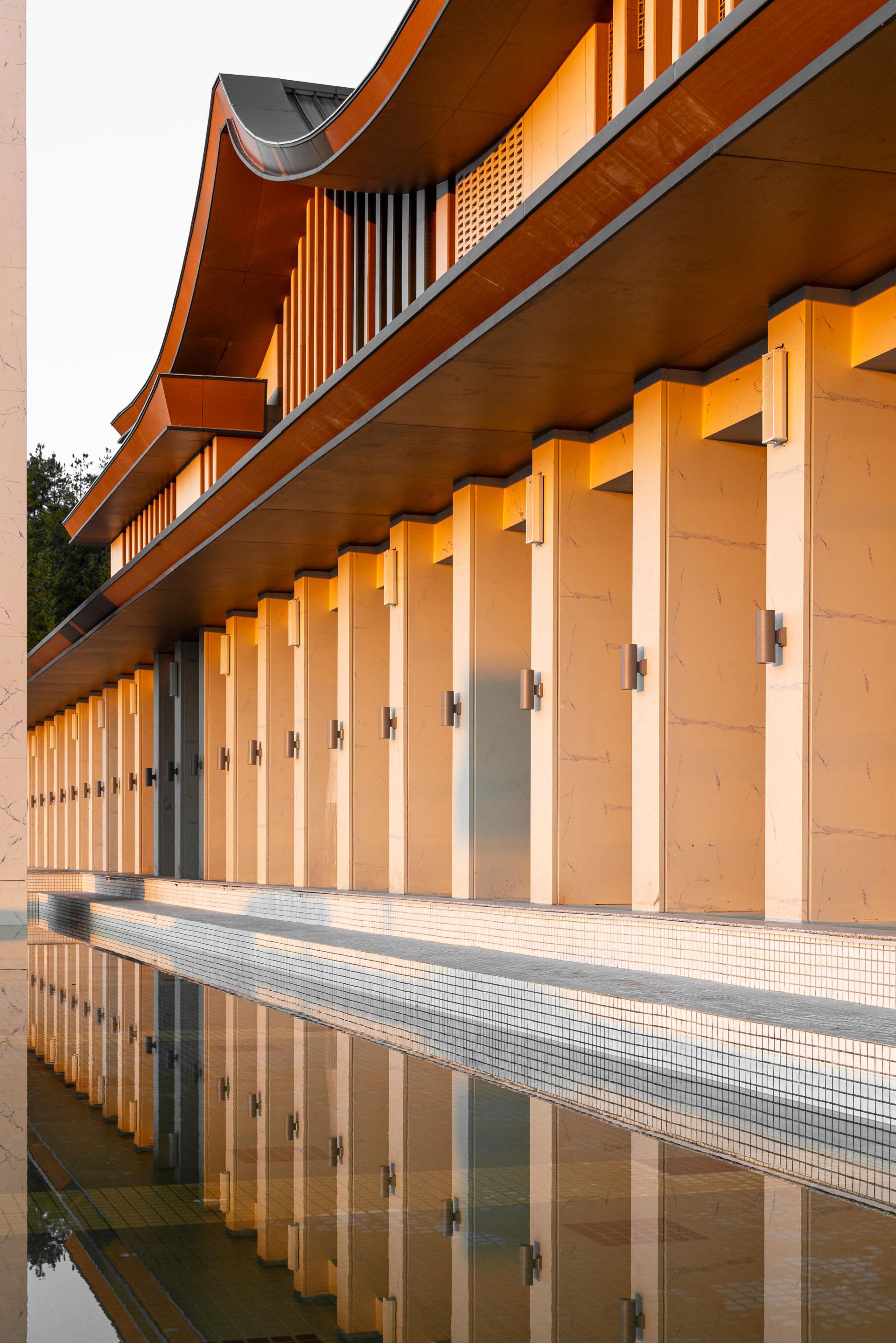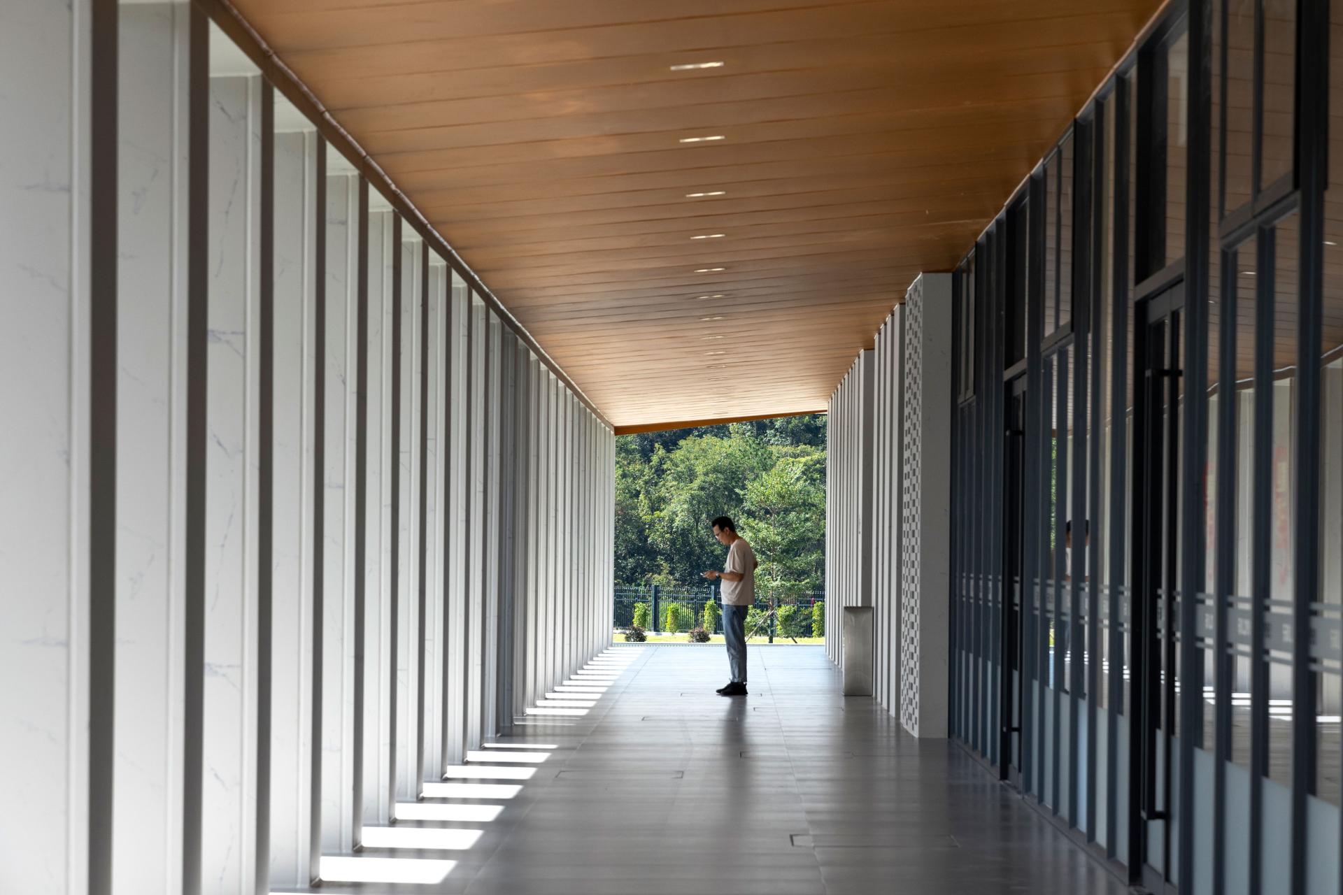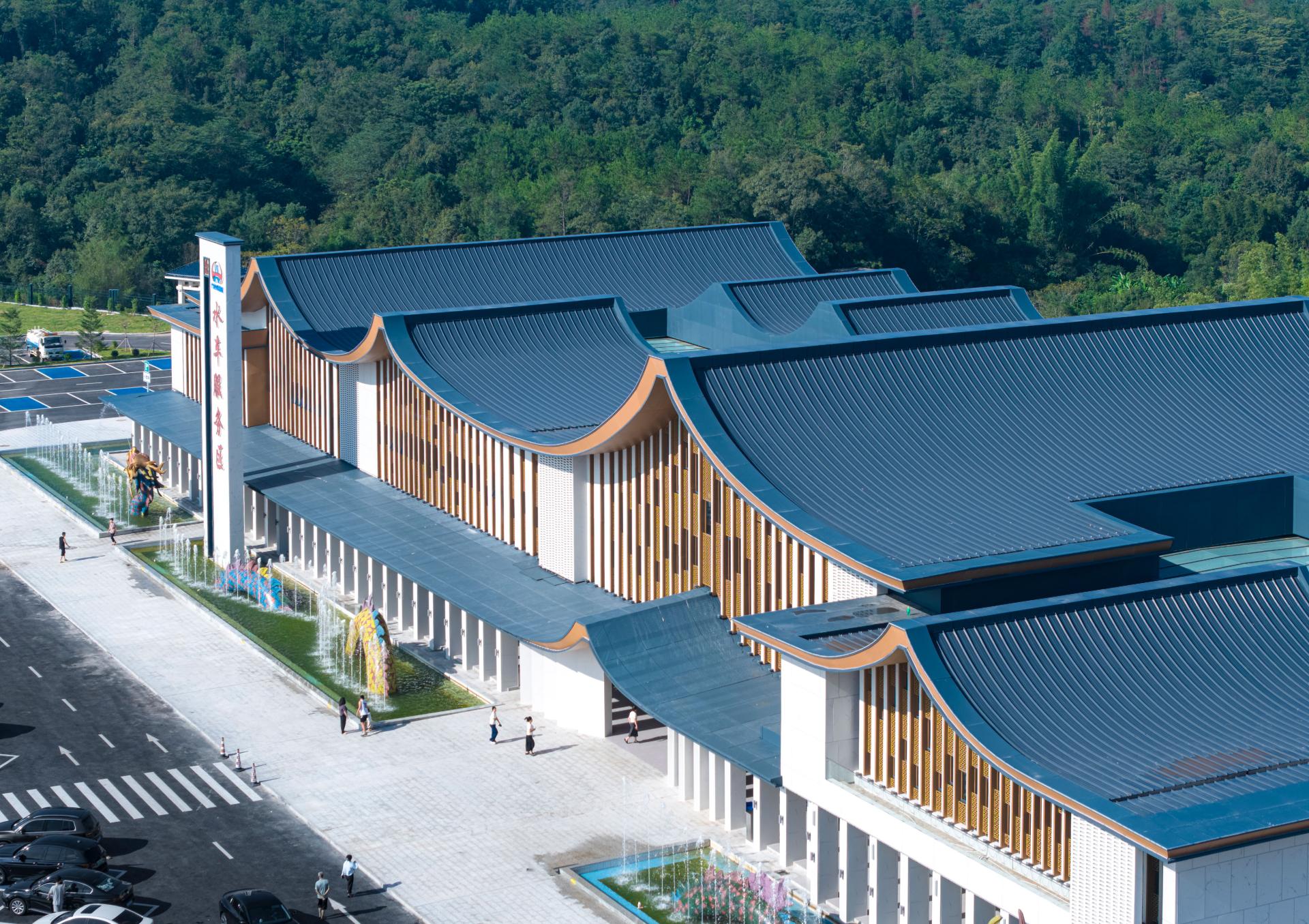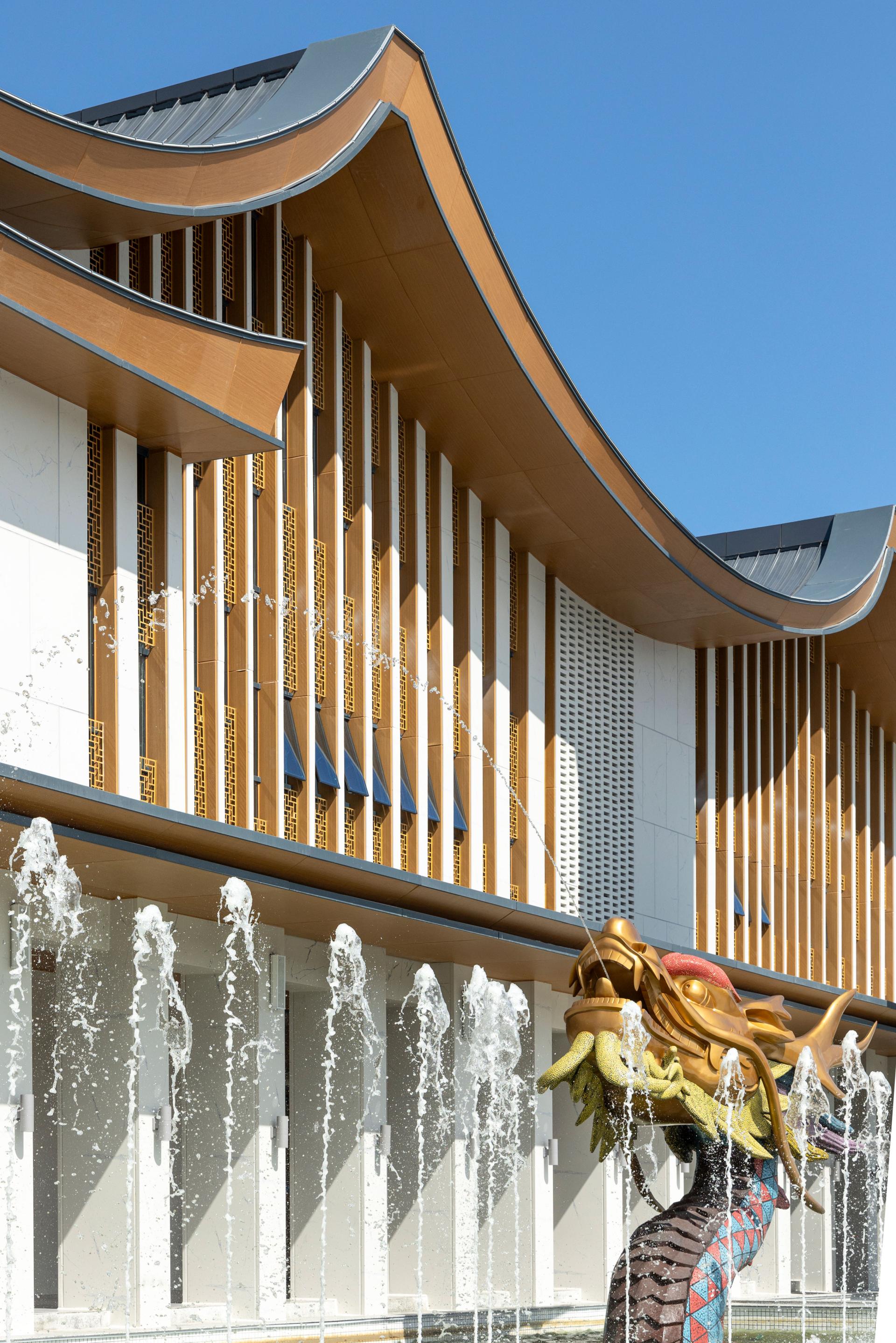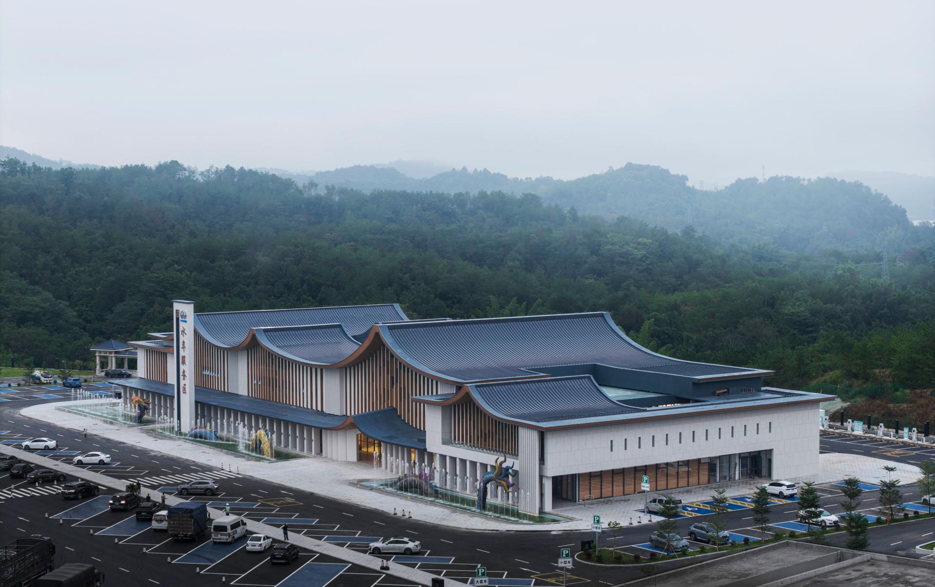 The overall design harmonizes with the surrounding landscape: the building massing is broken down into smaller units that undulate in response to the hilly terrain, while the light and fluid skyline reflects the graceful rhythm of the nearby Meijiang River. The roofline draws inspiration from the overlapping gables of Hakka settlements, abstractly merging them with the distinctive “cuo jiao tou” elements of Chaoshan architecture.