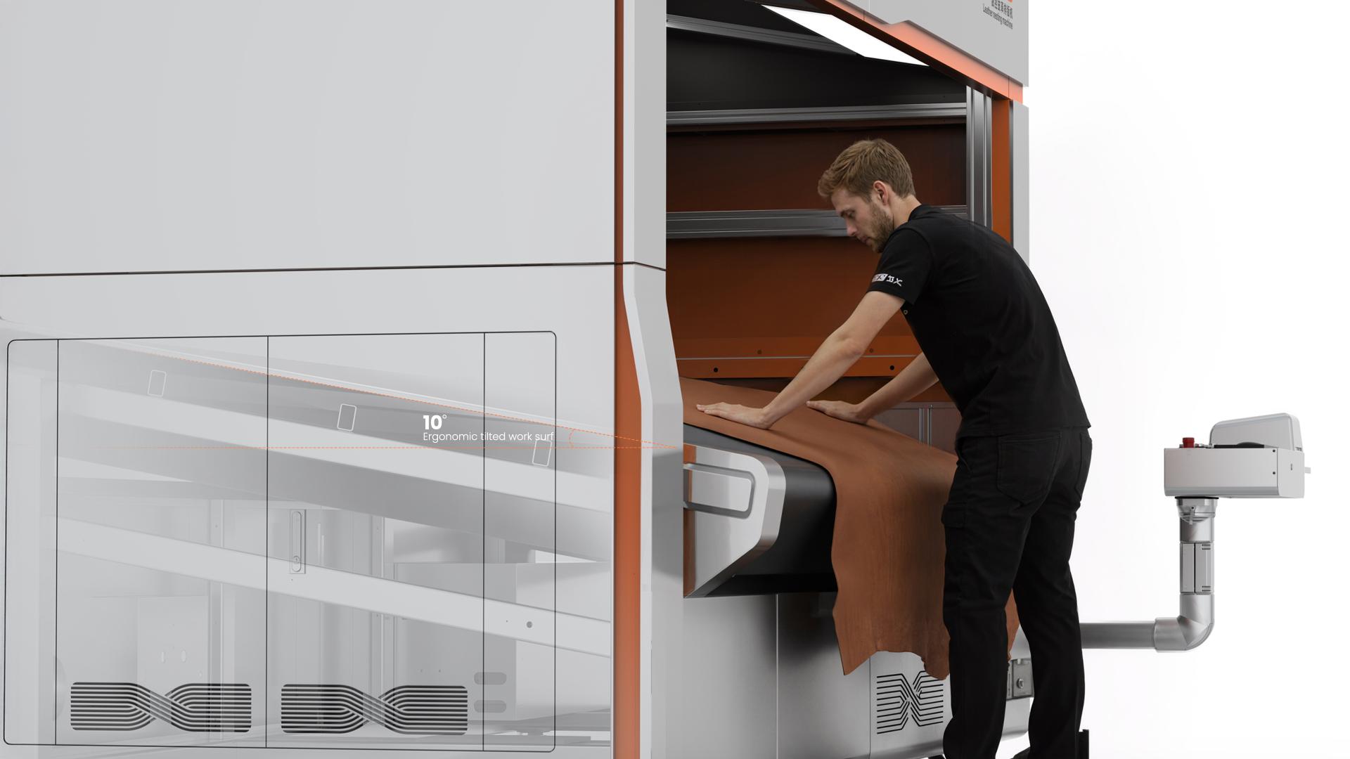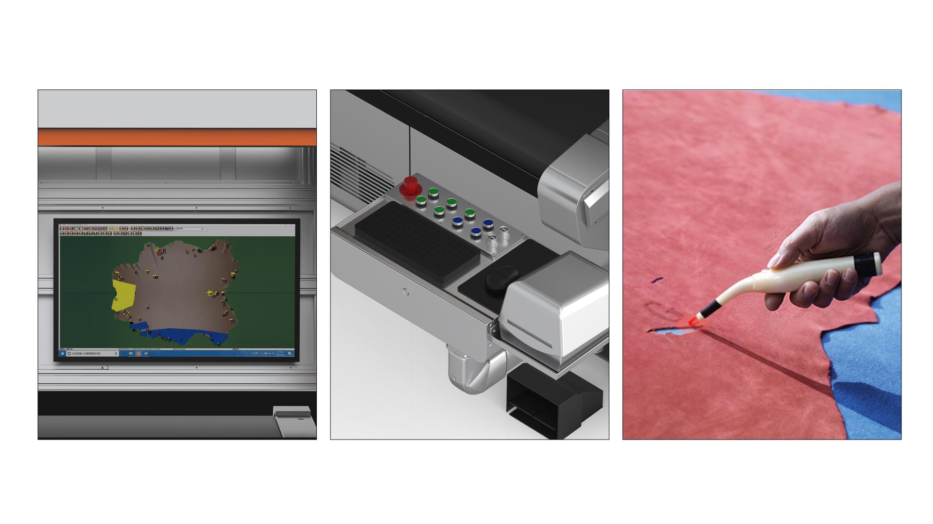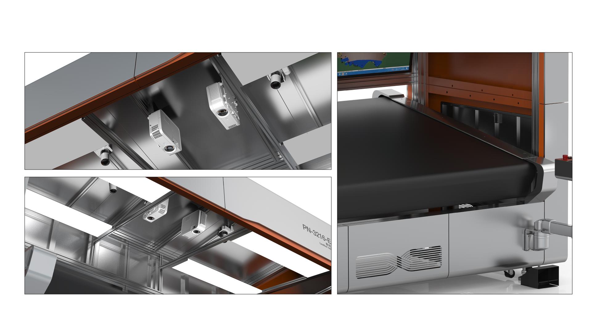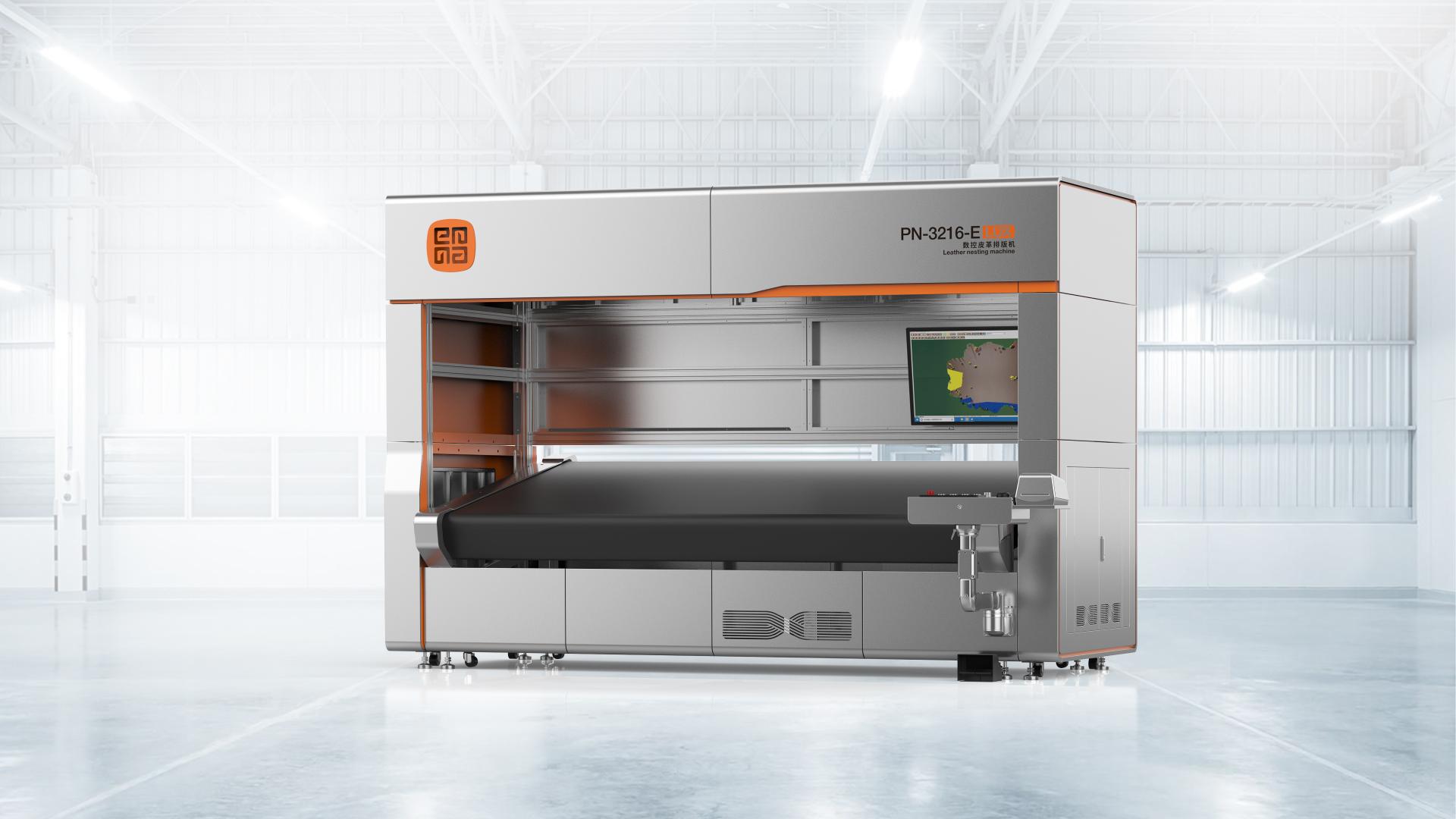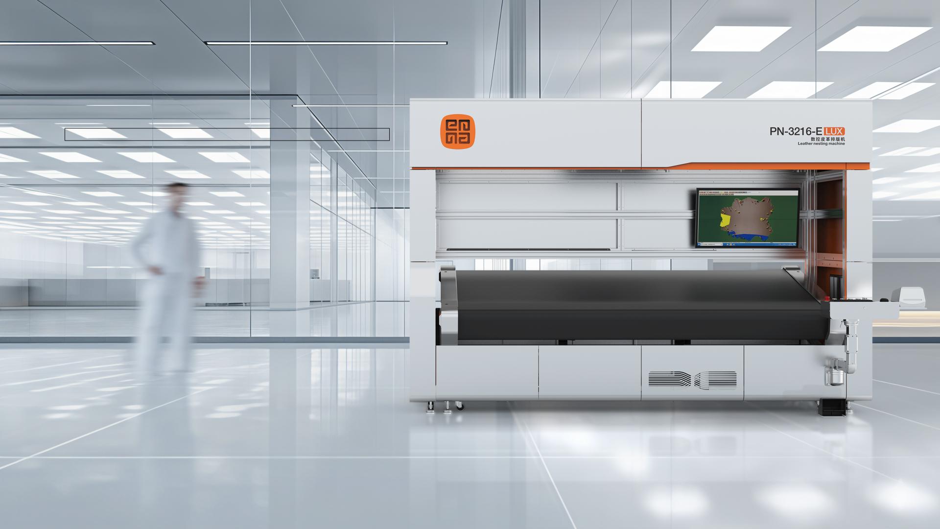 The PN-3216-E (LUX) CNC Leather Nesting Machine represents a new generation of intelligent production equipment. By integrating dual-zone industrial cameras with E-pen technology, it digitizes leather quickly and efficiently. The system accurately identifies the size, grade, and utilization rate of each hide, transforming processes once reliant on operator experience into standardized, data-driven operations. It has become an indispensable solution for large-scale production and flexible customization in the leather goods industry. This machine combines dual-zone cameras, multi-angle adjustable lighting, and E-pen defect grading with unlimited continuous conveying to process hides of all sizes. Enhanced by an AI-powered nesting server, it can complete automatic nesting of a single hide or multiple hides within 2–3 minutes, typically achieving a utilization rate of 75%–85%. Compared with traditional methods, it reduces dependence on manual labor while ensuring higher efficiency, greater accuracy, and stable nesting outcomes. The product is founded on the core concept of intelligent craftsmanship, reshaping traditional leather processing through digital technology. The system precisely identifies the dimensions, grades, and utilization rates of leather, transforming processes that once relied on manual experience into visualized and data-driven operations. The design philosophy emphasizes efficiency and refinement, while honoring the intrinsic value of materials, breathing new vitality and productivity into traditional craftsmanship. The overall design presents a clean and modern aesthetic, continuing the design philosophy of refined quality beneath a sleek appearance. The ergonomically tilted work surface enhances operating comfort, while the clear and intuitive interface layout reinforces the industrial sense of precision and technological sophistication. The color composition is harmonious, the lines are smooth, and the modular connections are seamless, conveying a sense of stability and reliability expected of professional equipment. The non-contact marking design of the electronic pen prevents leather contamination, underscoring the precision and meticulous craftsmanship of the design.