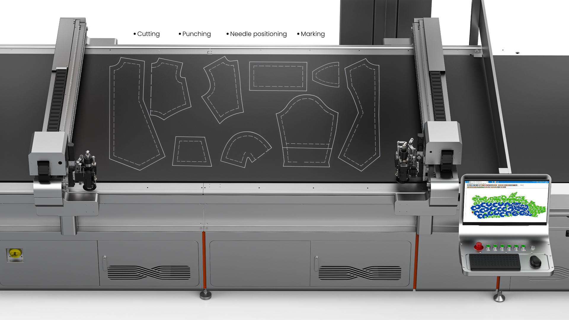 This machine breaks away from traditional hydraulic presses and steel dies, adopting a fully digital cutting process that eliminates die-making, storage, and replacement. This not only reduces production costs but also avoids delays and material waste. The proprietary 7-in-1 tool head supports cutting, punching, needle positioning, and marking in a single unit. Its dual-zone HD projection system ensures precise alignment, prevents material waste, and uses color-coded projections for easy size identification and faster sorting.