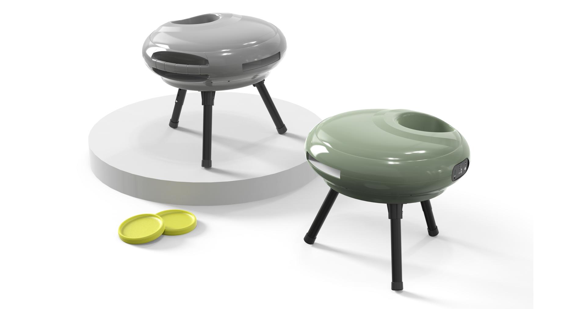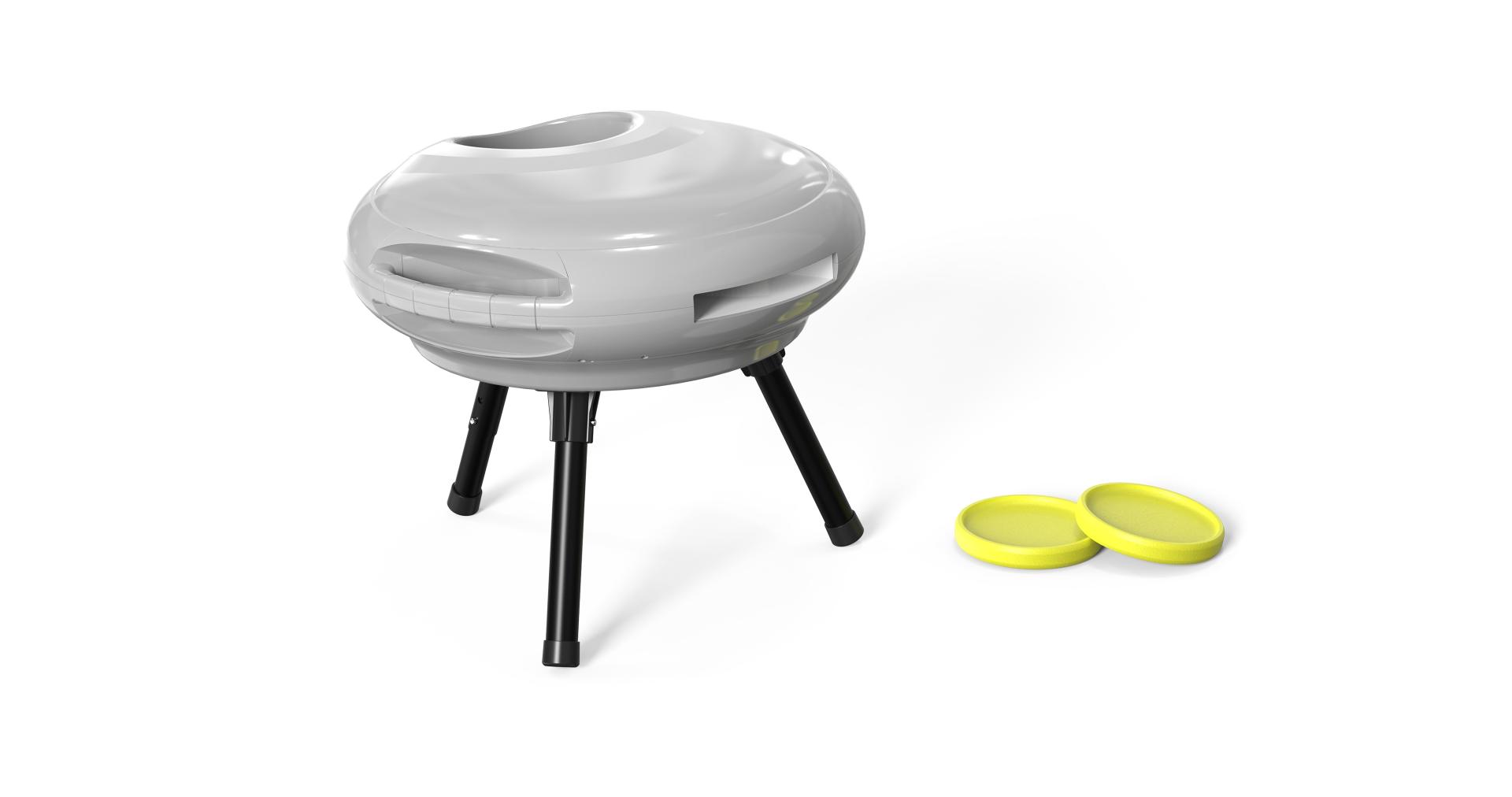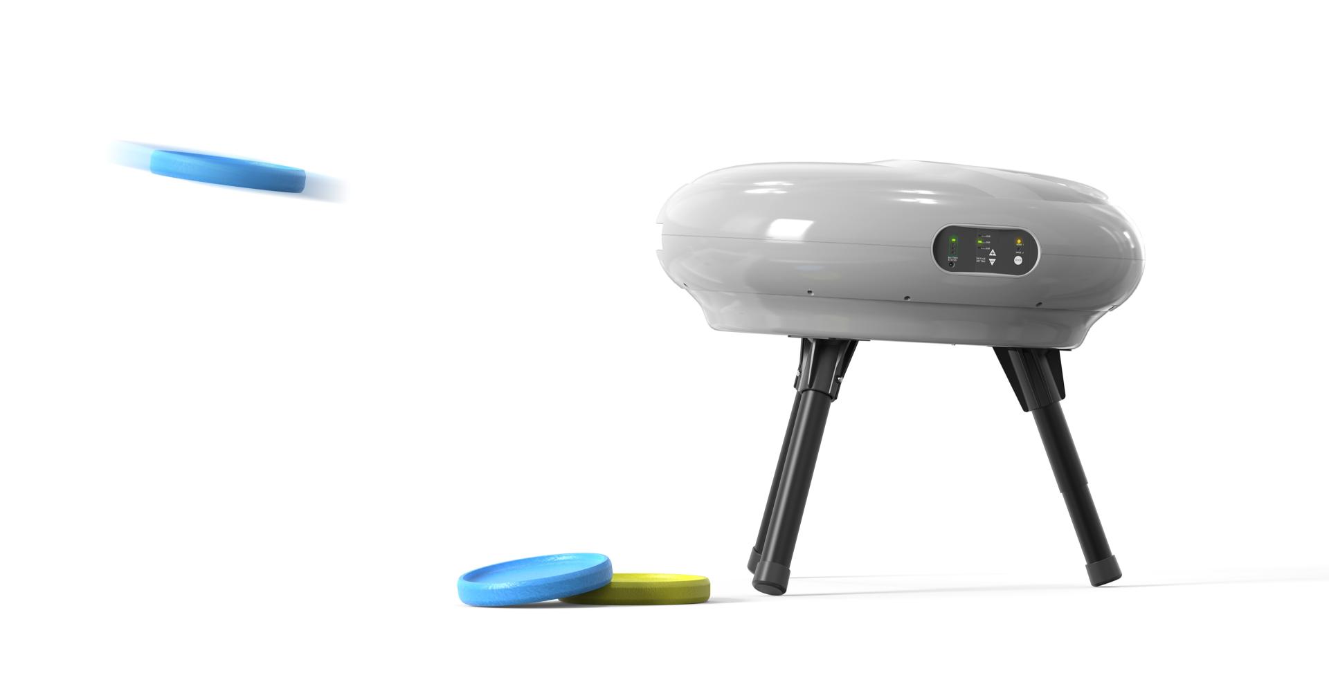 The design is simple and rounded, inspired by streamlined aerodynamic forms that balance style with technology. Multiple color options are available, paired with black foldable legs that ensure stability and easy storage. The frisbee loading port and control panel are arranged for both practicality and aesthetics. With lightweight EPP frisbees combined with an ABS shell, the overall appearance is light and dynamic.