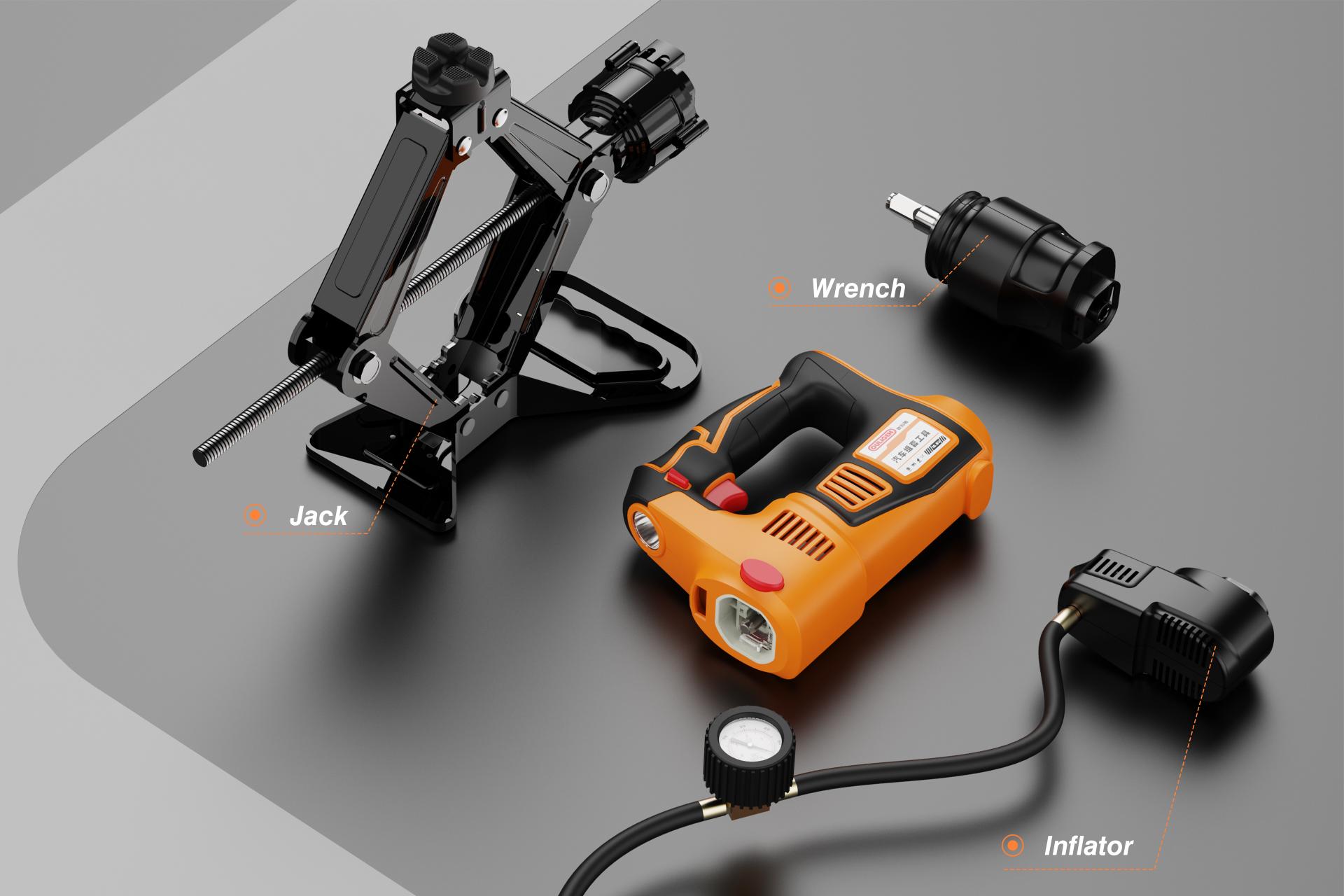 Its core lies in the "one main unit, multiple heads" design concept: only one main unit is needed, combined with replaceable attachments such as a jack, wrench, and inflator, to handle different tasks. The modular structure ensures convenient connection and detachment, reduces redundant tool configurations, and optimizes storage and portability. An integrated high-brightness flashlight provides illumination and can also switch to a warning strobe light, enhancing safety during nighttime operations or roadside assistance.