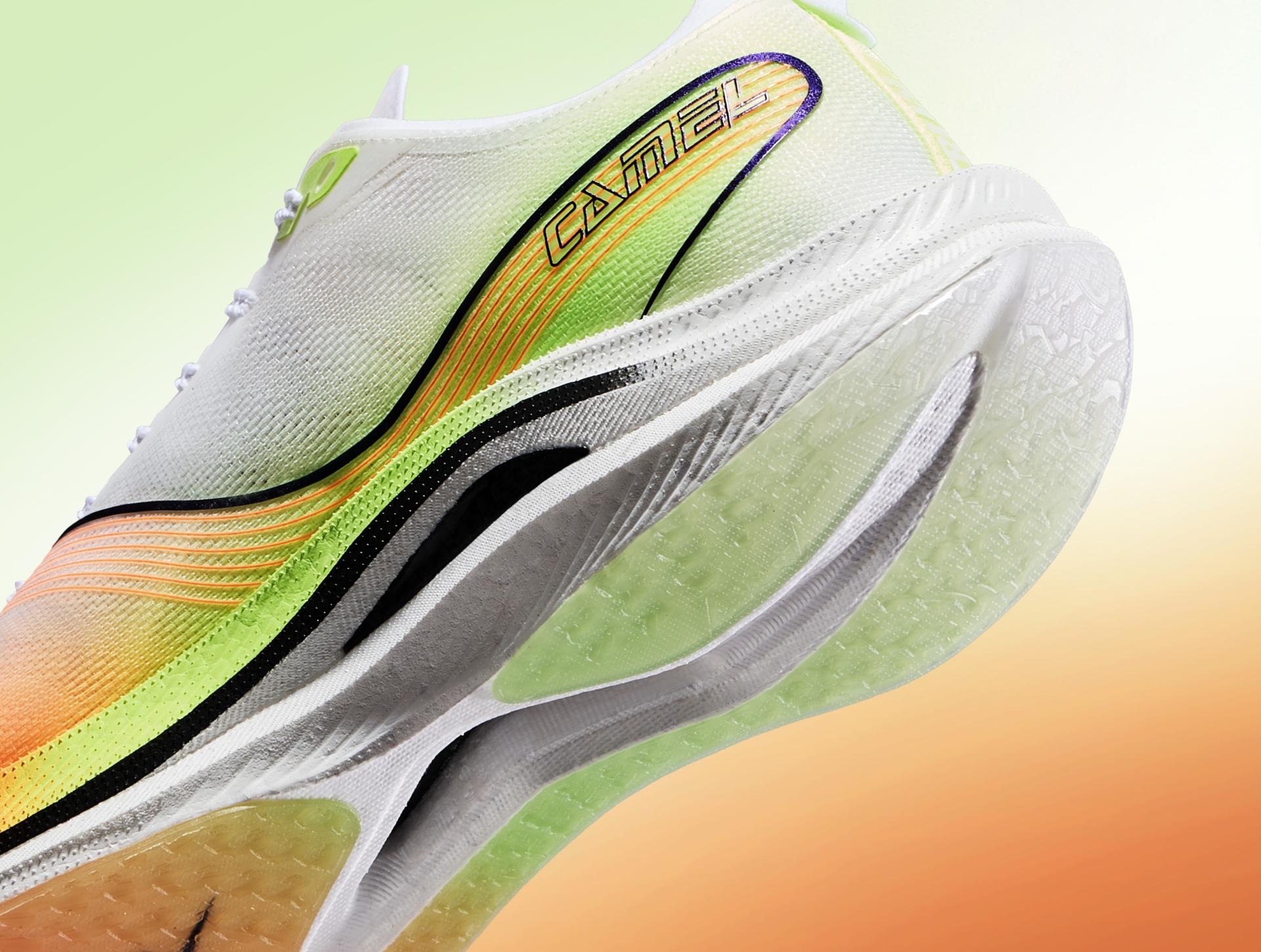 Visually, the “M” motif—inspired by the silhouettes of camel humps and mountain peaks—serves as both a signature brand emblem and a reinforcement feature for structural integrity. The overall aesthetic balances minimalist elegance with stylish color contrasts: a clean white base is accented by the vibrant “M” motif, adding just the right amount of visual pop without overwhelming the design. Rubber granule placement on the sole is optimized through AI-driven parametric modeling and informed by sports biomechanics to precisely enhance pressure distribution with every step. Additionally, the semi-gusseted, one-piece tongue features thickened cushioning to prevent shifting and ensure lasting comfort—so you can stay focused on your run, not your gear.