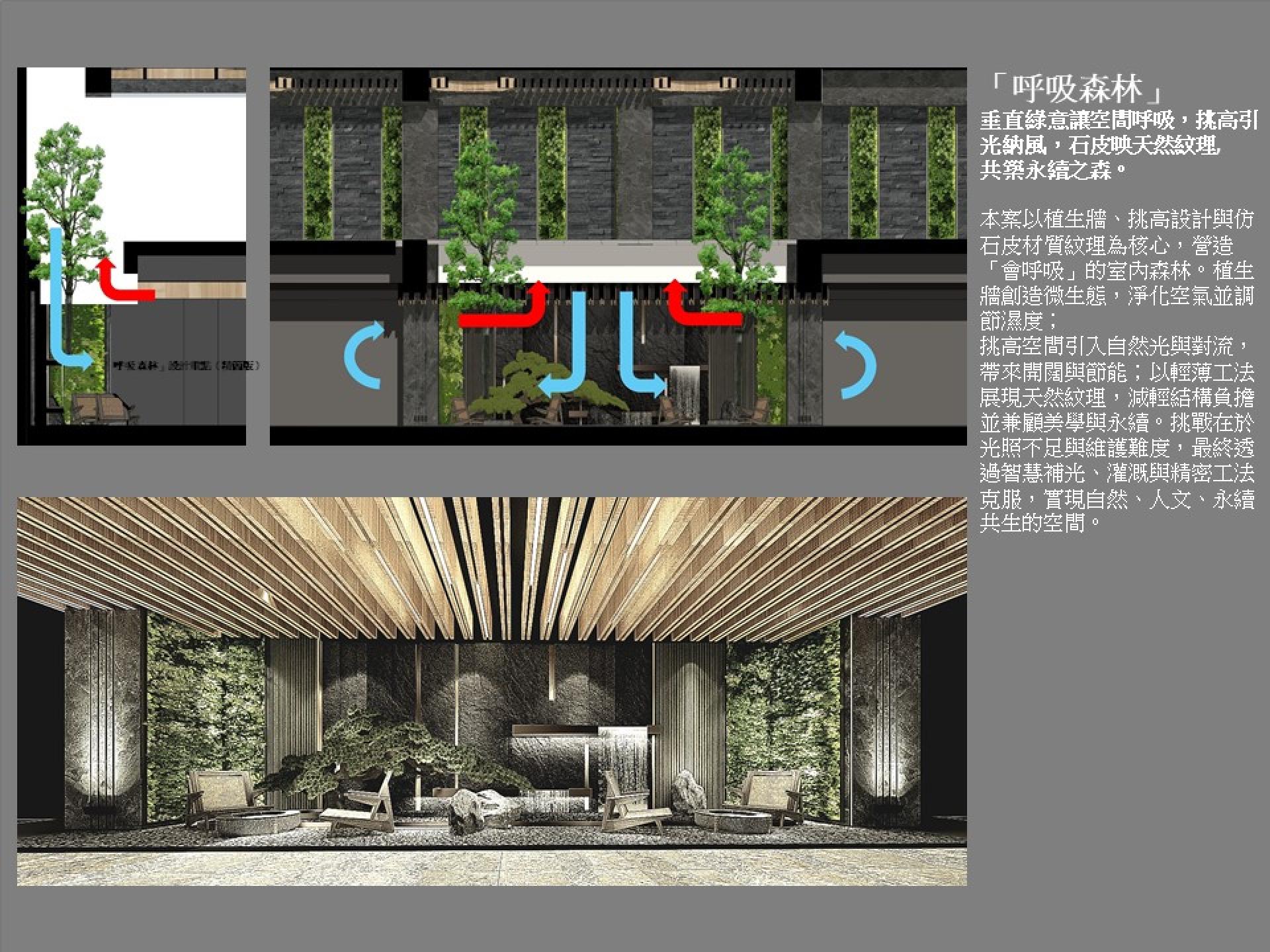 The inspiration stems from the fusion of Eastern Zen philosophy and contemporary aesthetics. The designer envisioned the space as a breathing indoor forest: the upright pine symbolizes a spiritual pillar, greenery acts as a “green lung” that regulates air, while water features reflect the fluidity of nature. The brushwork of calligraphy is transformed into spatial languages of walls and light. Materials include dark wood-grain metal, solid wood furniture, matte gray stone, and tinted glass, balancing natural warmth with modern refinement. The motivation was to create a poetic sanctuary that integrates Zen, art, humanity, and sustainability, turning the space into a natural refuge within the city.