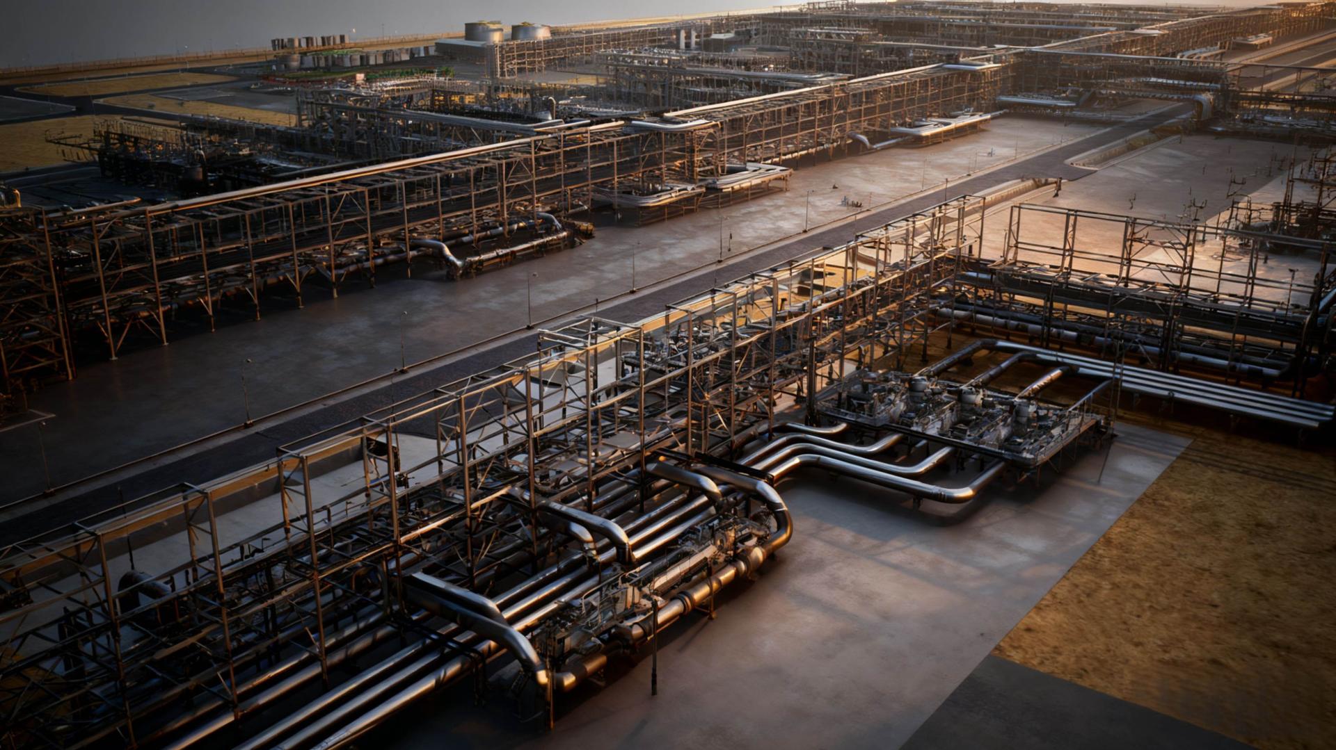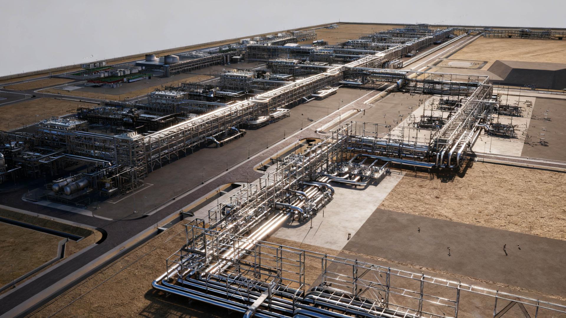 The project design draws inspiration from Diriyah, the historic birthplace of Saudi Arabia. From above, its layout mirrors ancient city walls—symbols of strength and heritage. Interwoven steel pipelines evoke the vibrant streets of old, representing progress and connection. Turbine zones resemble bustling marketplaces, while towering flare stacks echo mosque minarets—symbols of guidance and resilience.