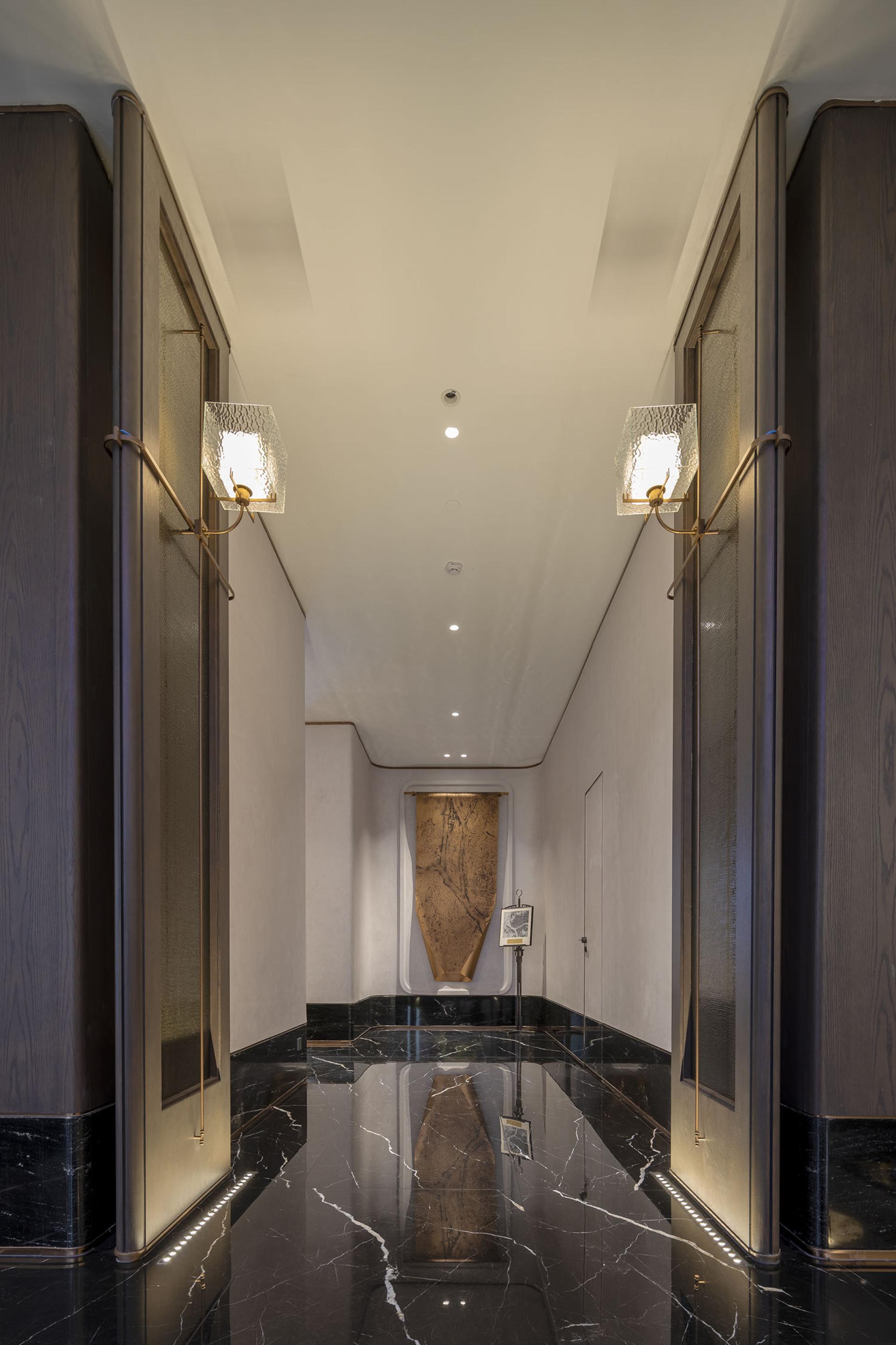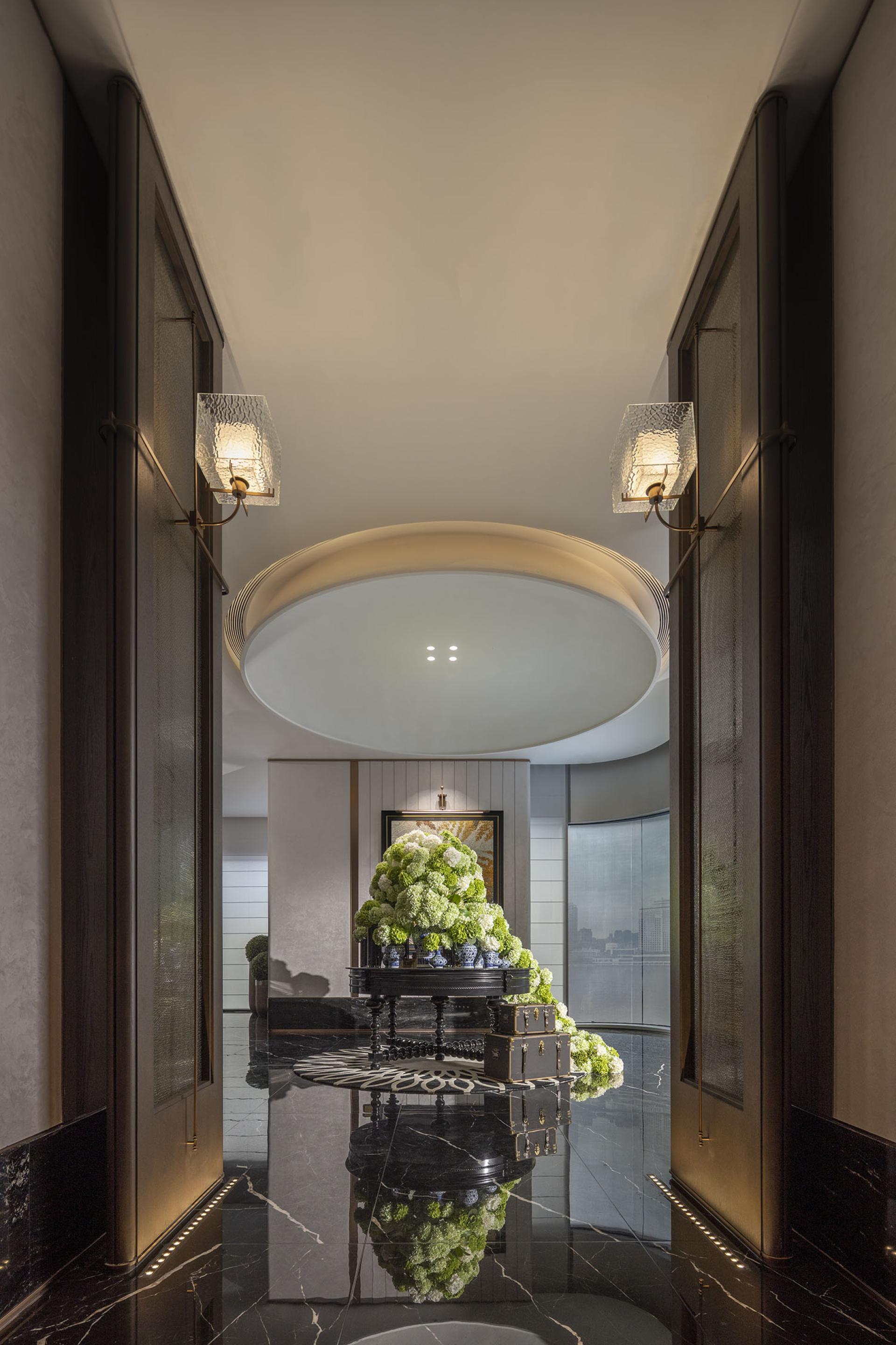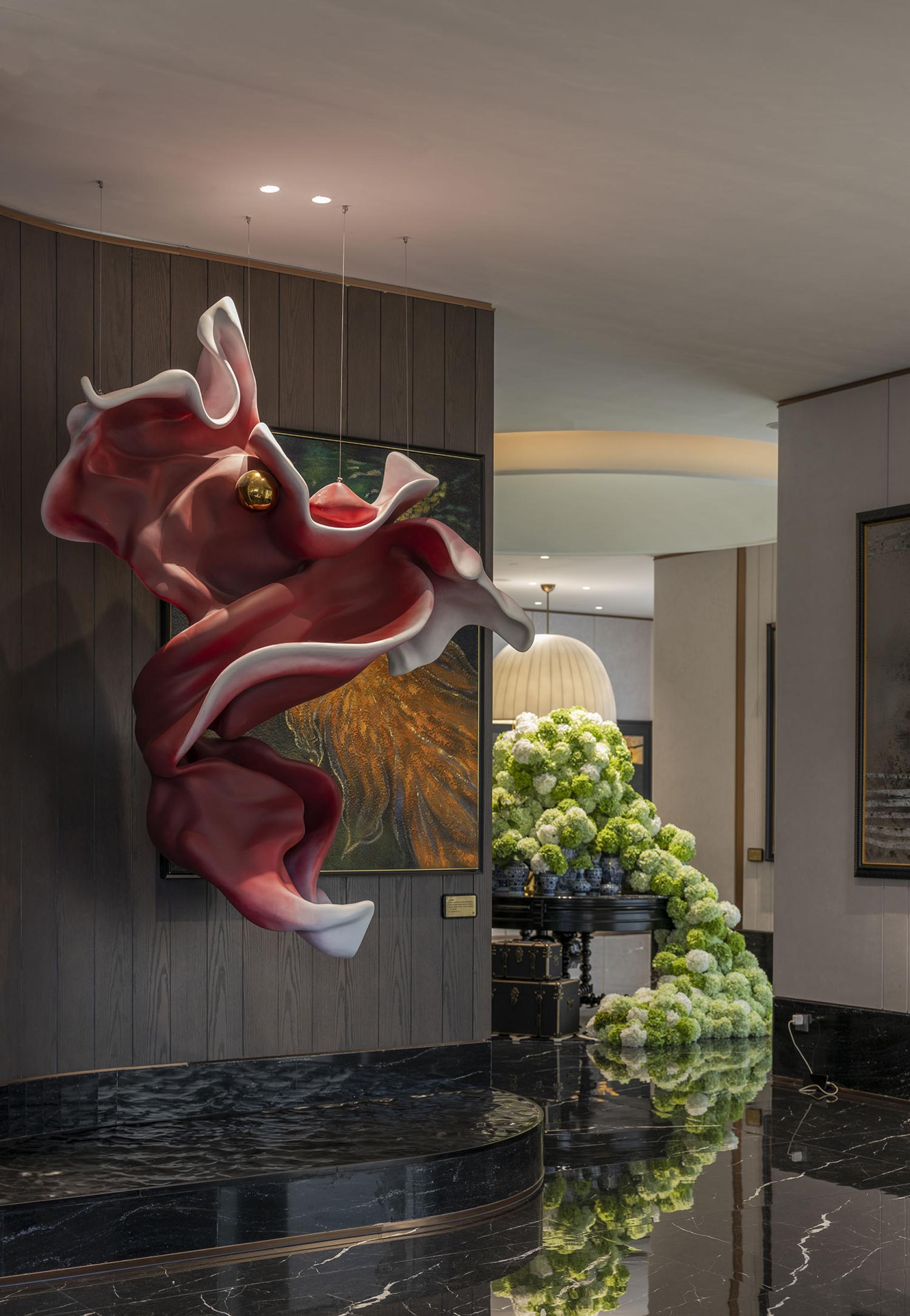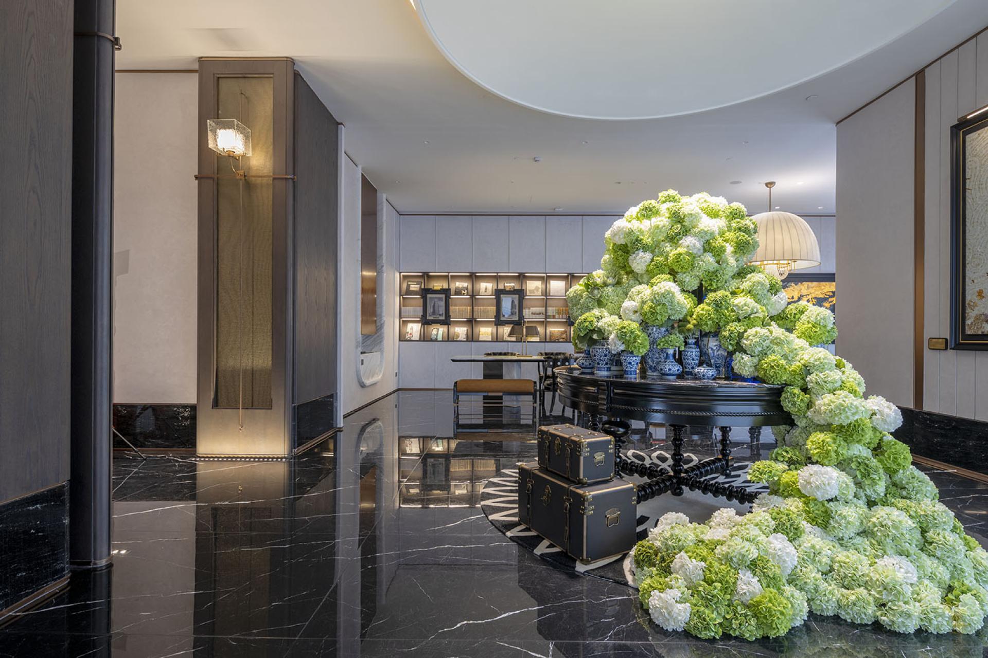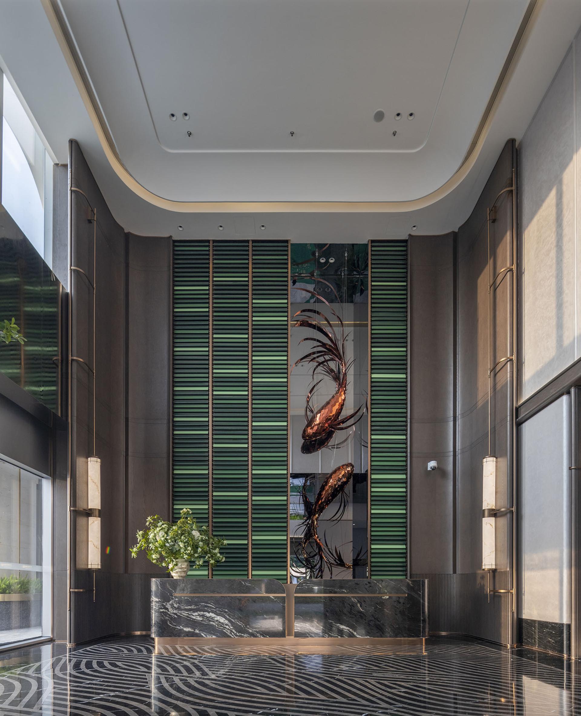 The window grilles, blue tile roofs, fish and other design elements are integrated into the interior, while creating a sense of luxury in the hotel, cleverly combining tradition with the building