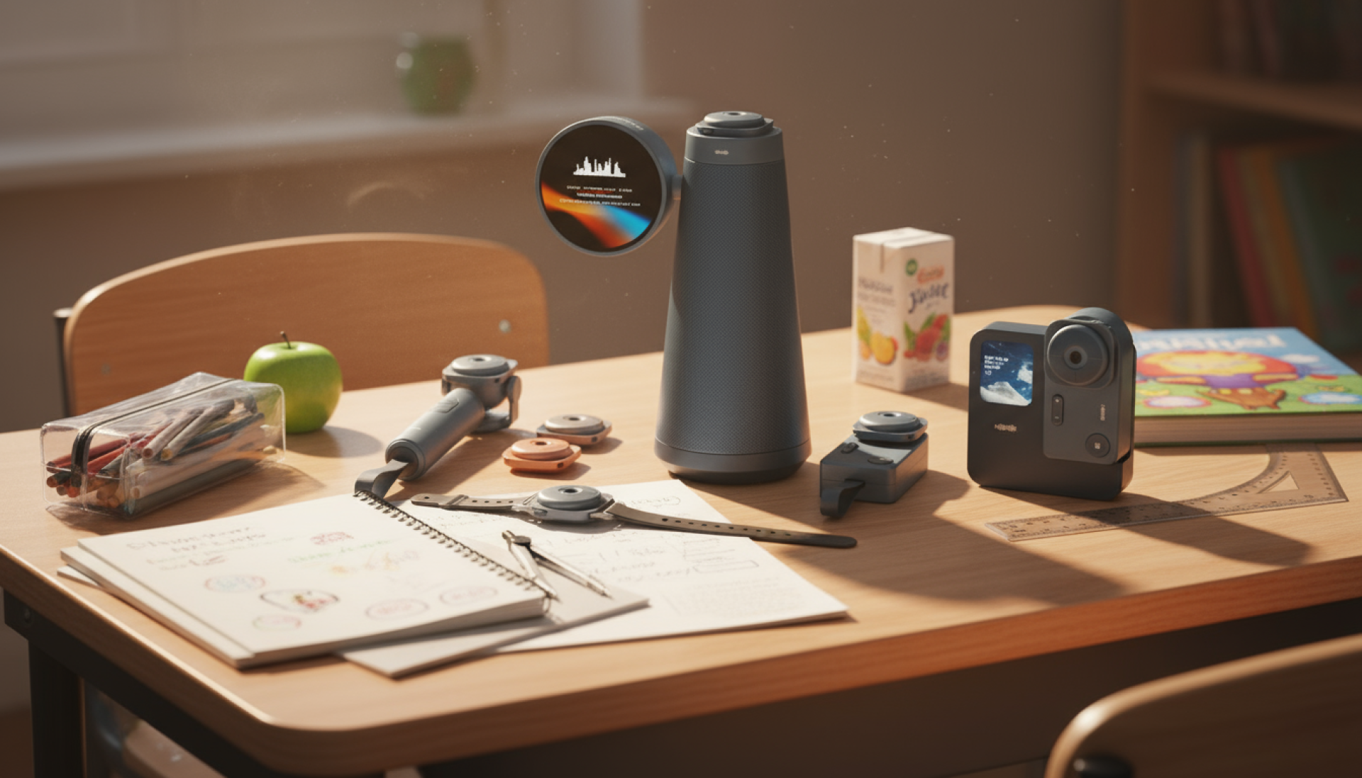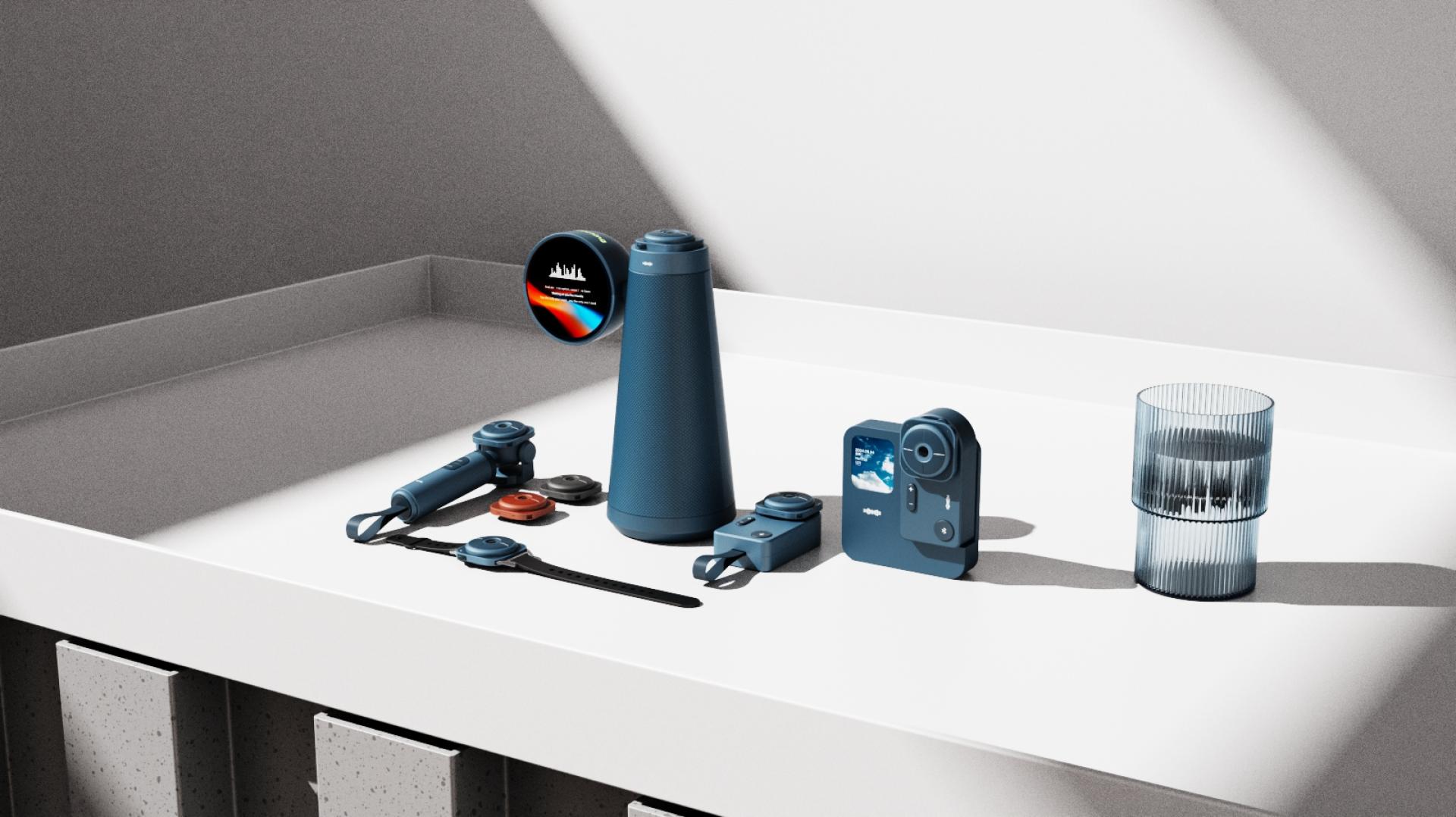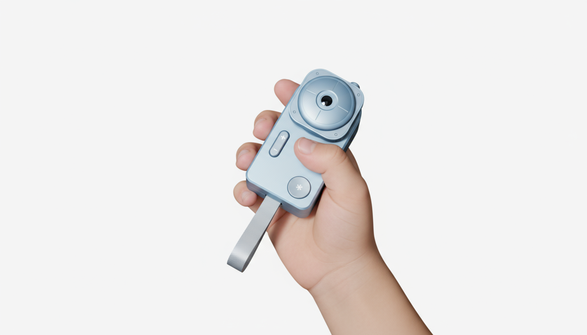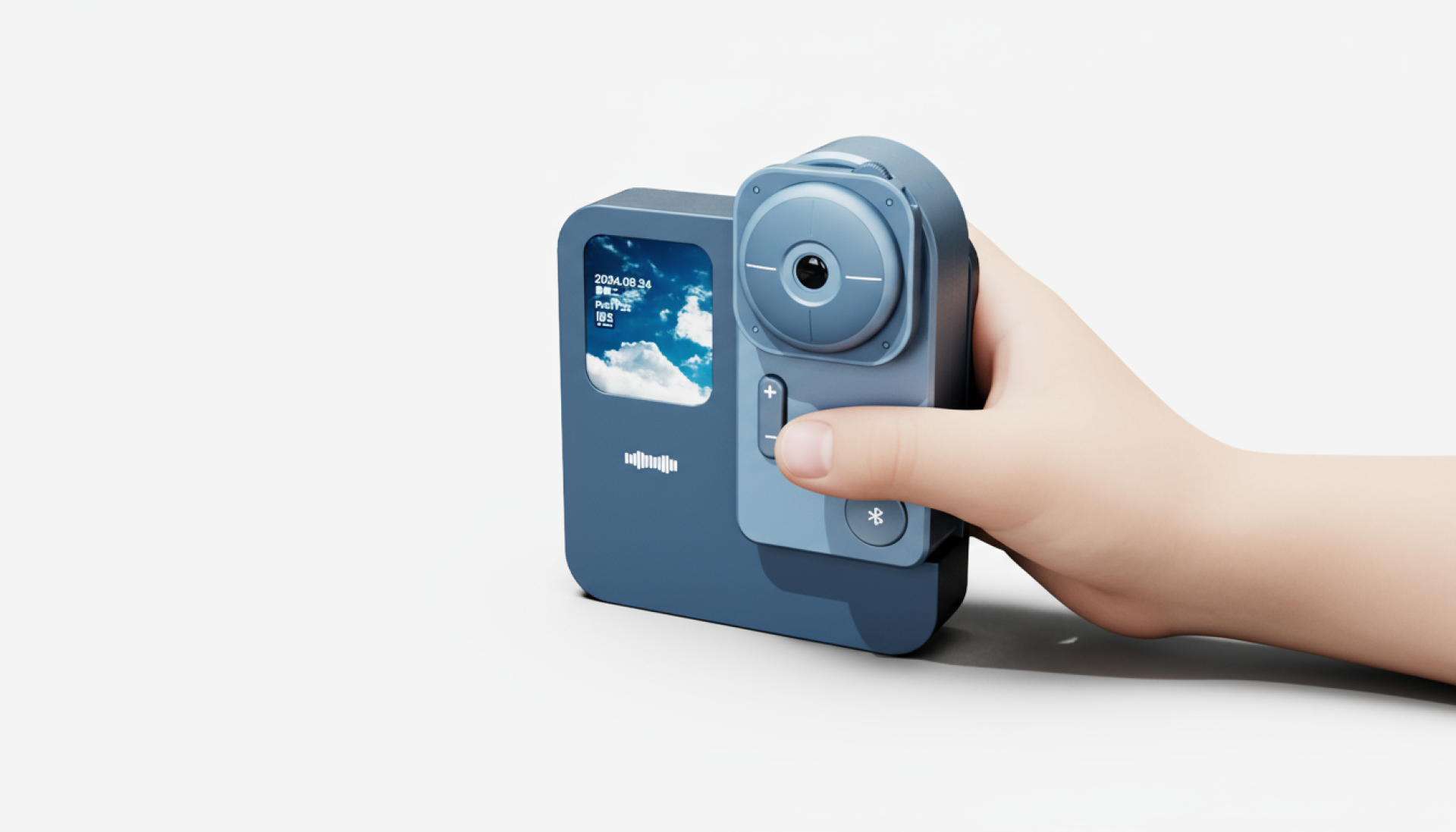 This design centers on children’s privacy protection and parent–child interaction, presenting a multifunctional interactive electronic product. The main unit serves as a smart speaker that stores and plays children’s daily recordings, videos, and voice messages—becoming a private companion for emotional expression and self-recording. A modular side screen displays the child’s digital content; when privacy is desired, the module can be flipped face down, creating a simple yet effective physical privacy barrier. The top of the main device includes a charging and docking area for a detachable camera, enabling convenient storage and recharging. Supporting accessories include a handheld grip, a wristband, and a desktop stand, allowing flexible camera use across various daily scenarios. Through the integration of “recording–display–protection,” the design creates a safe and creative digital environment for children, encouraging self-expression while ensuring privacy and trust within family interactions.
