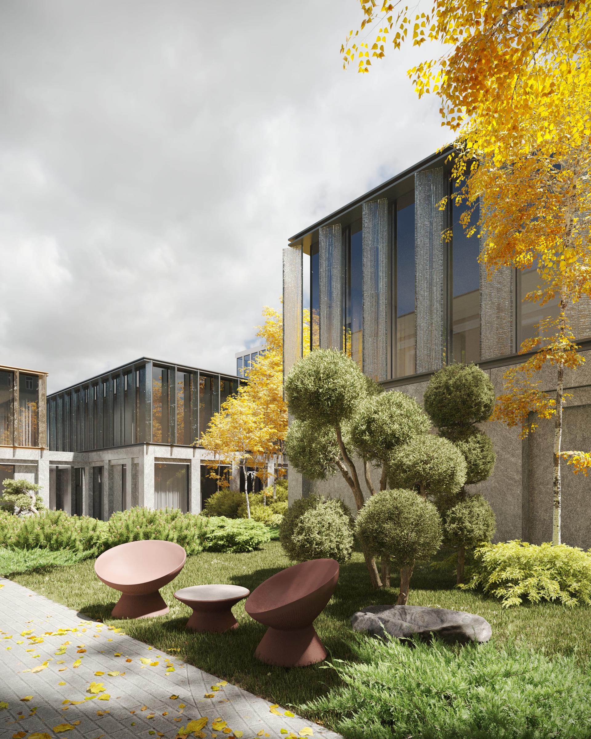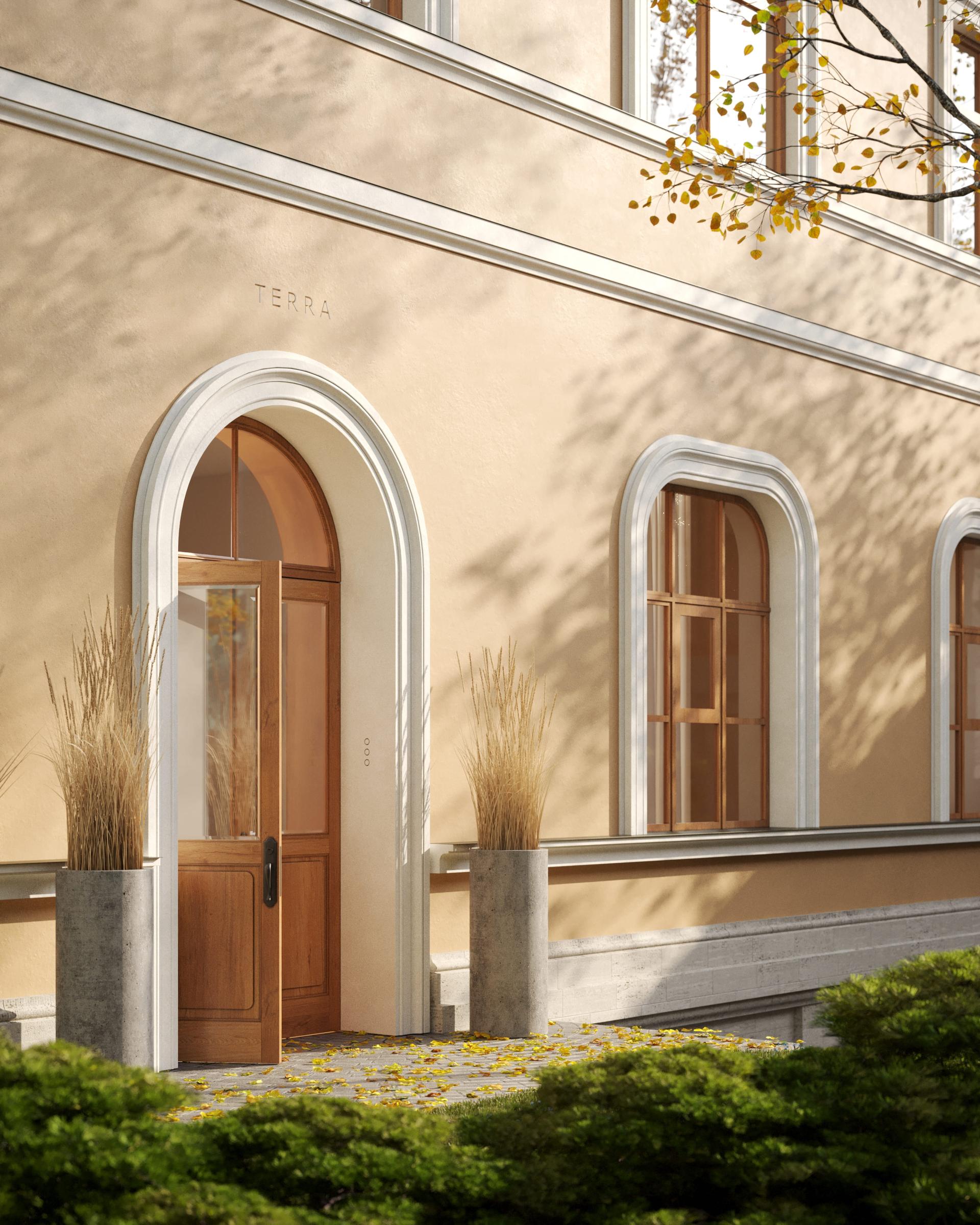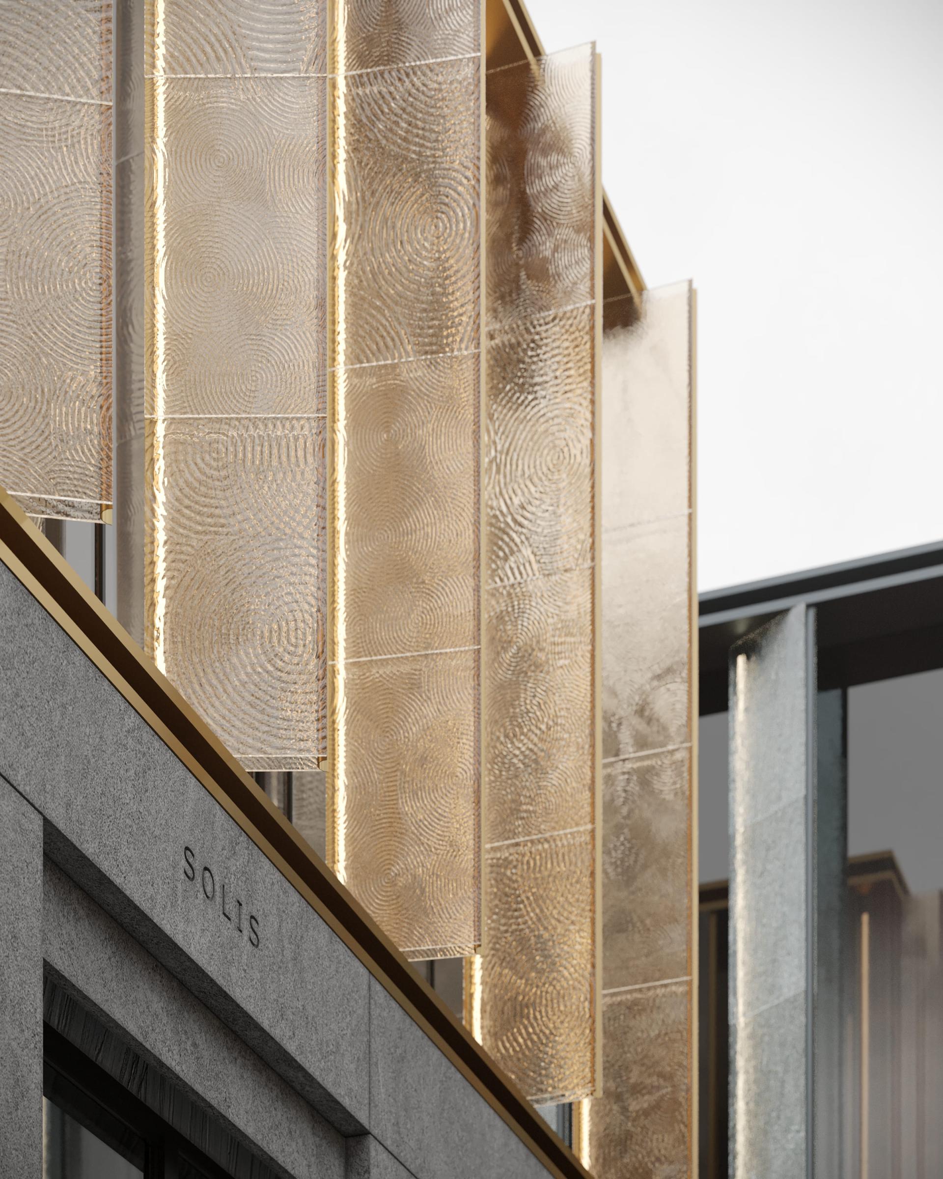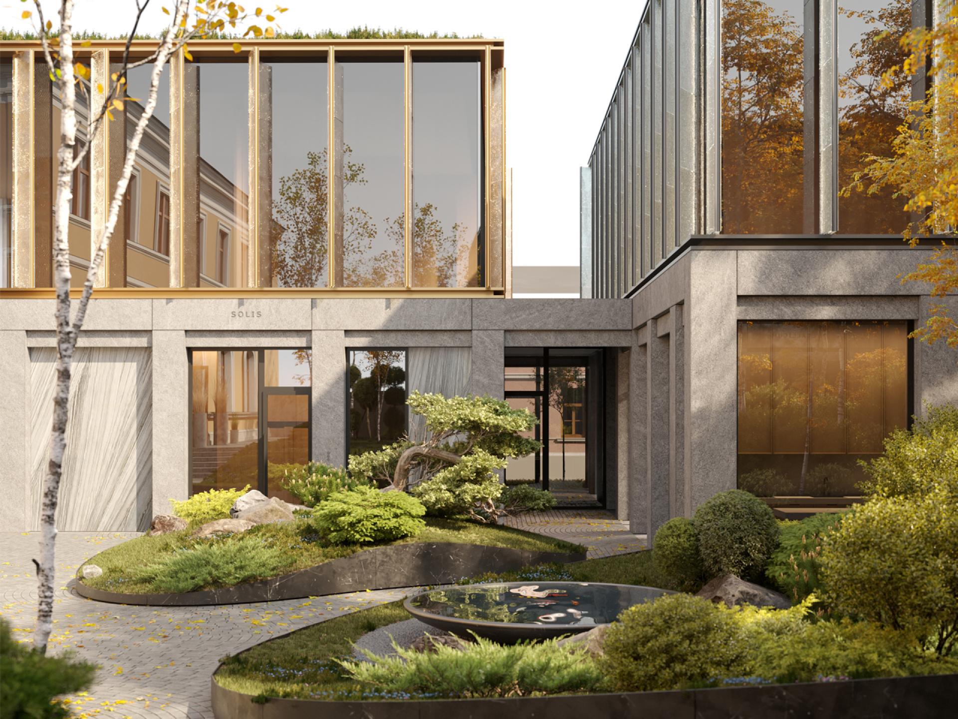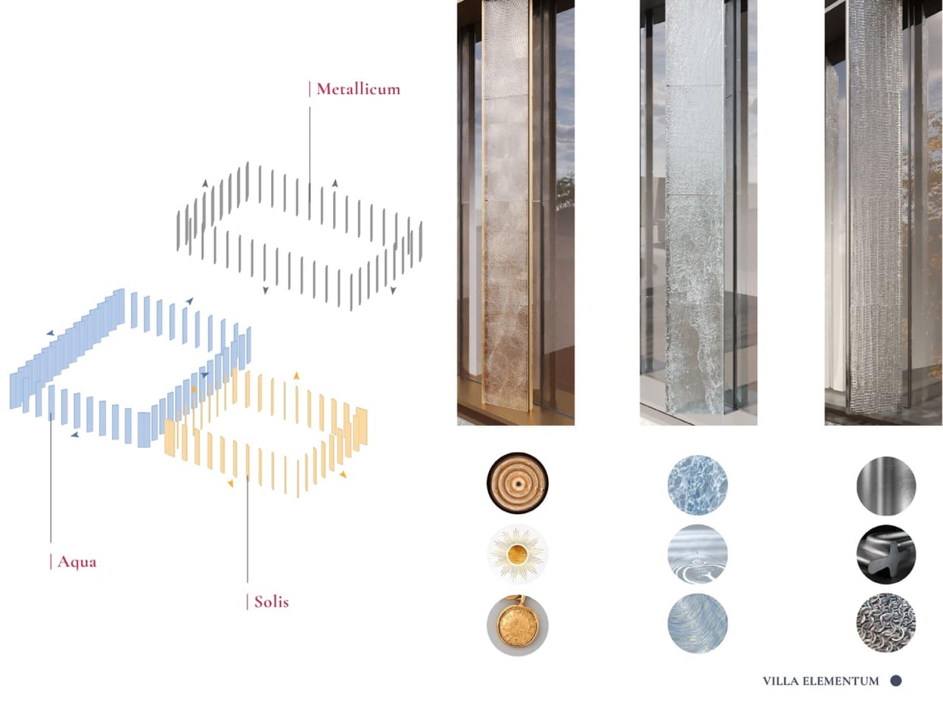4 villas, one of which is a cultural heritage site. The facade design is based on the concept of the five elements (the Chinese Wu Xing cycle). Each villa (Metallicum, Aqua, Solis, and Terra) represents its own element. The courtyard, with its geoplastic landscaping, symbolizes the wood element. The architecture is unified, but the glass facade lamelles differ in color and pattern, reflecting their respective elements.