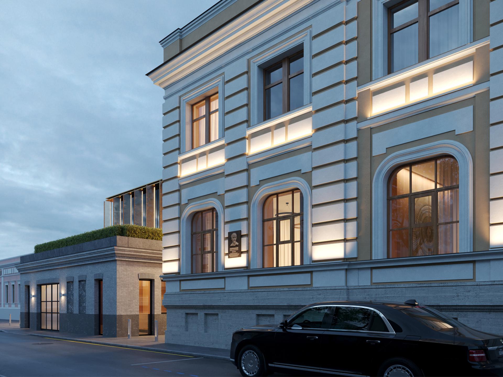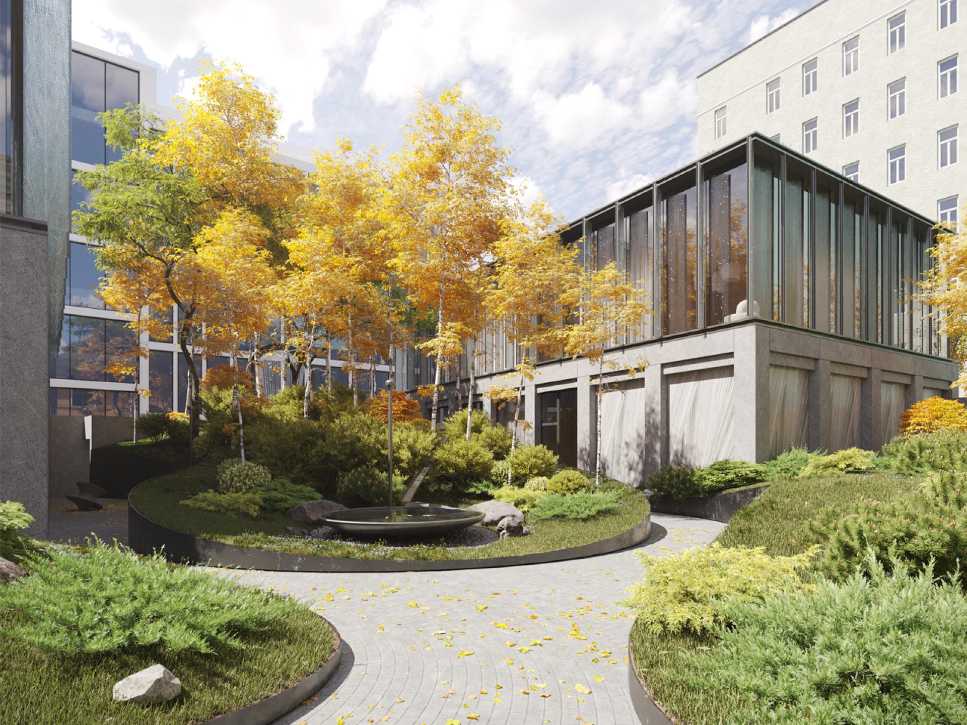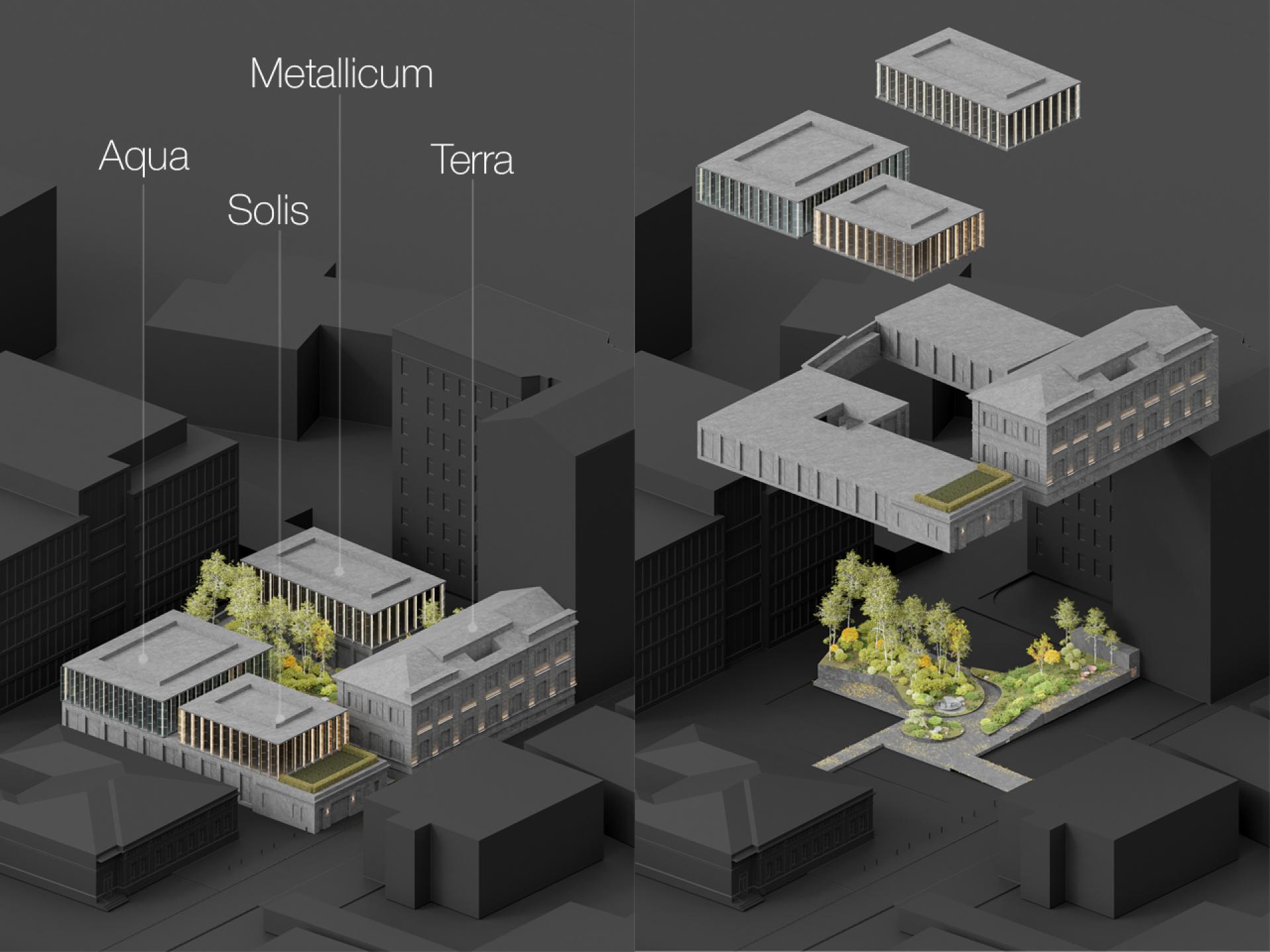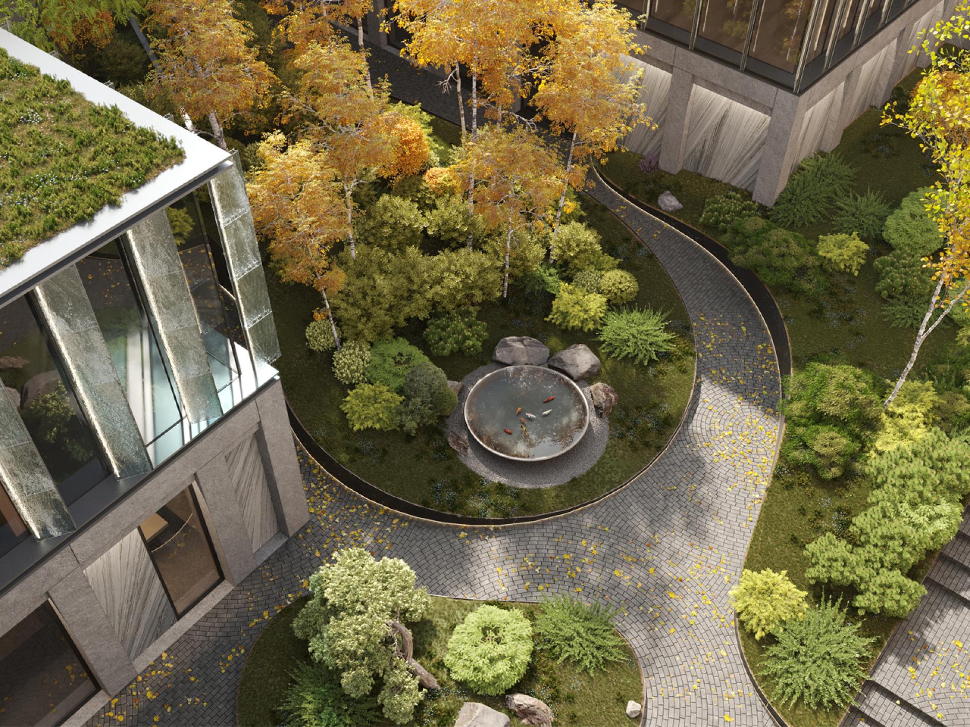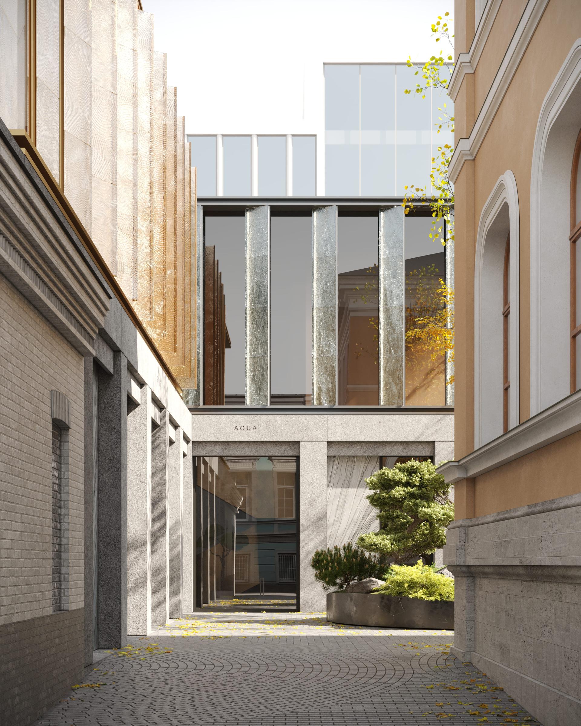 4 villas, one of which is a cultural heritage site. The facade design is based on the concept of the five elements (the Chinese Wu Xing cycle). Each villa (Metallicum, Aqua, Solis, and Terra) represents its own element. The courtyard, with its geoplastic landscaping, symbolizes the wood element. The architecture is unified, but the glass facade lamelles differ in color and pattern, reflecting their respective elements.