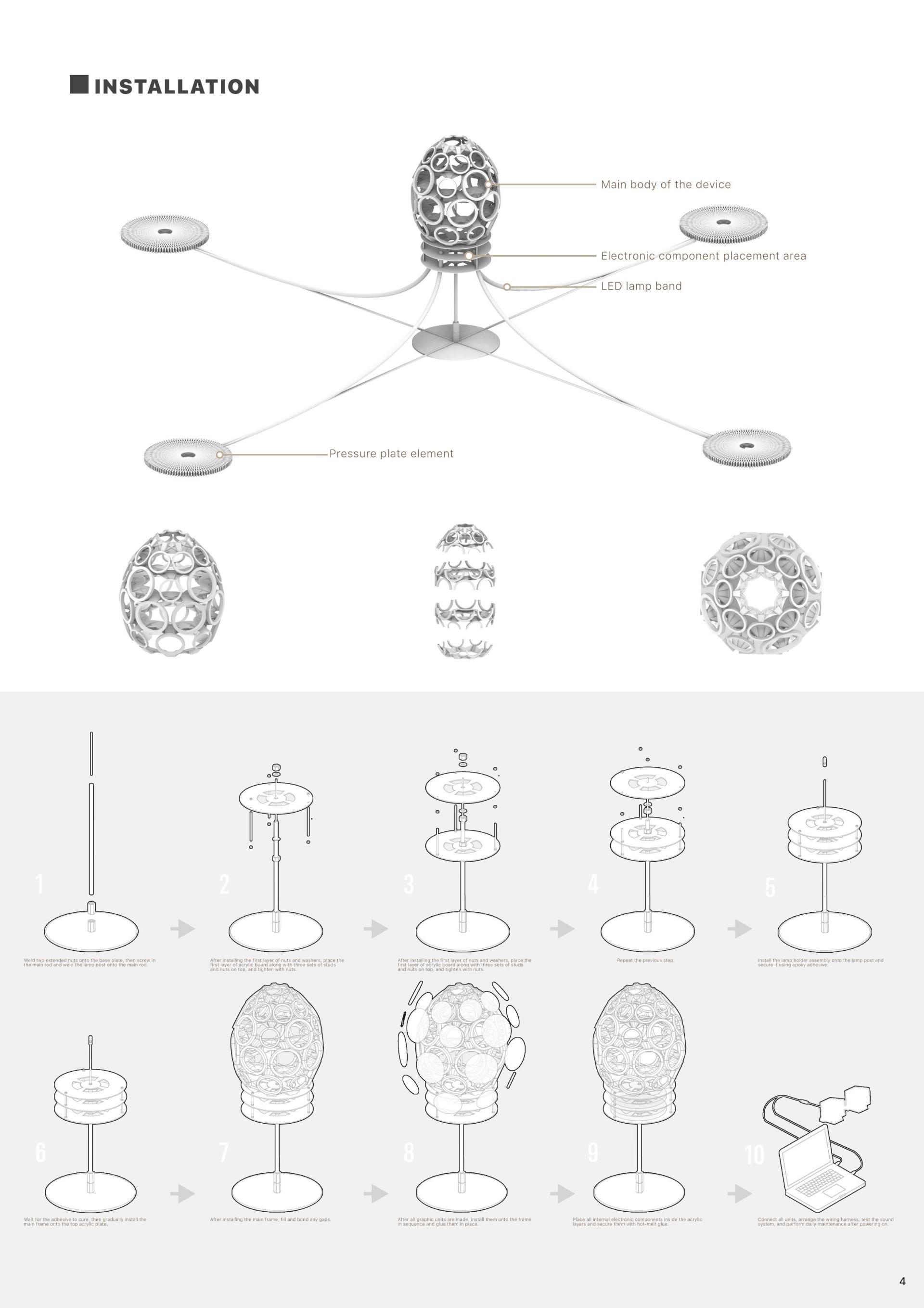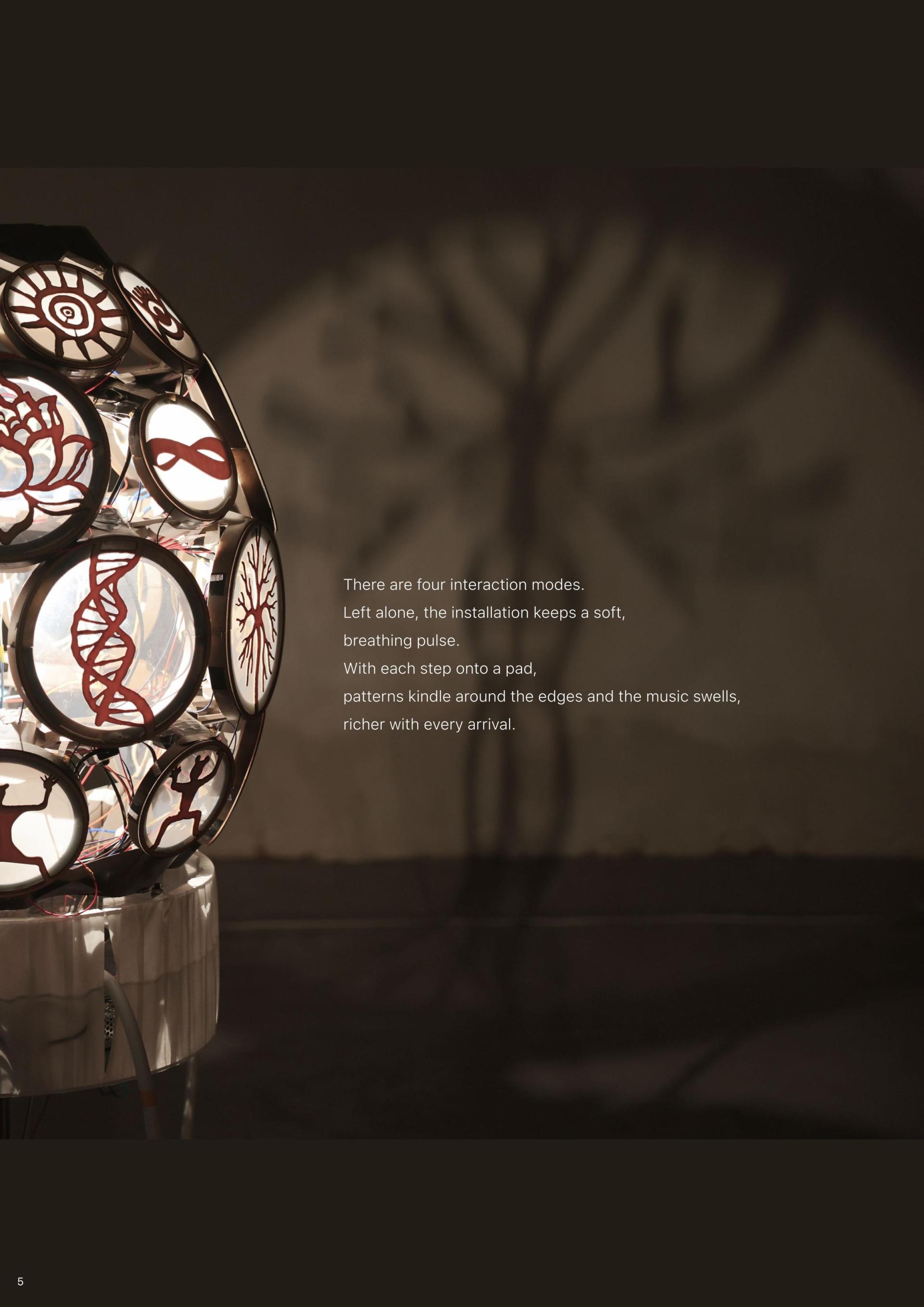 Light serves as the primary expressive medium. The surface patterns are arranged in a circular formation, symbolizing the progression of humankind—from Homo sapiens at the bottom to Homo deus at the top. Visitors interact by stepping on pedals, triggering the activation of patterns controlled by a fog-film system. As the patterns illuminate, immersive light and shadow are projected onto the surrounding walls, creating a sacred and mysterious atmosphere that envelops the space. Here, the audience is not merely an observer but also a participant; together, we co-construct the narrative of the work.