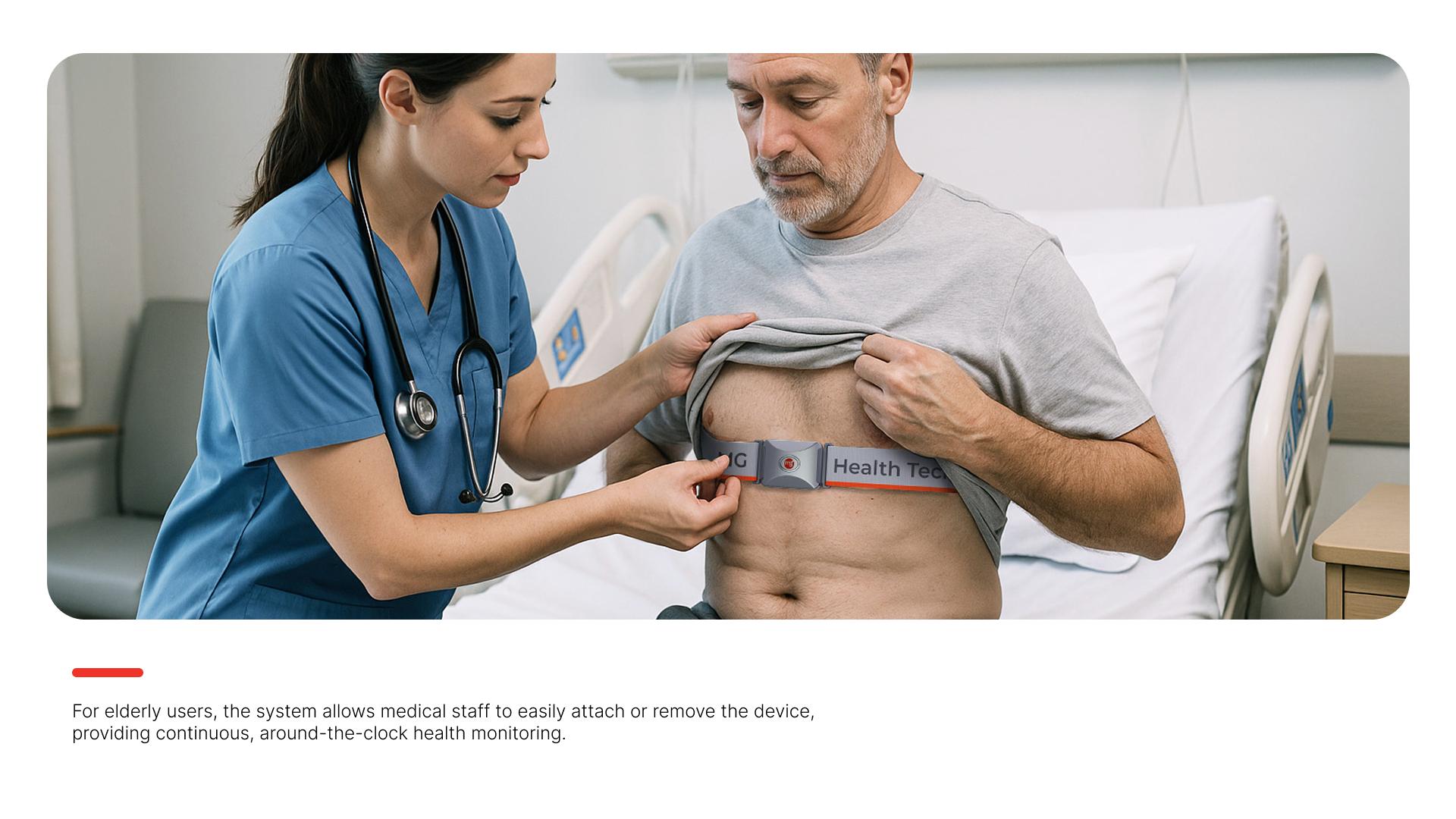 Every design decision reflects empathy and practicality: smooth edges to convey trust, breathable medical-grade fabrics for long-term comfort, and a detachable structure that simplifies charging and sanitation. For caregivers, the mobile connectivity allows multiple patients to be monitored simultaneously, supporting efficient and responsive healthcare management.