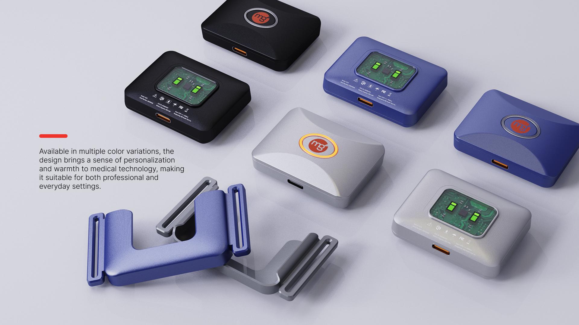 The design responds to two contrasting environments: the precision of medical care and the warmth of daily living. Its modular system—featuring interchangeable straps and armbands—adapts to different body areas and user needs, ensuring comfort and reliability for elderly users, patients in recovery, and even active individuals.