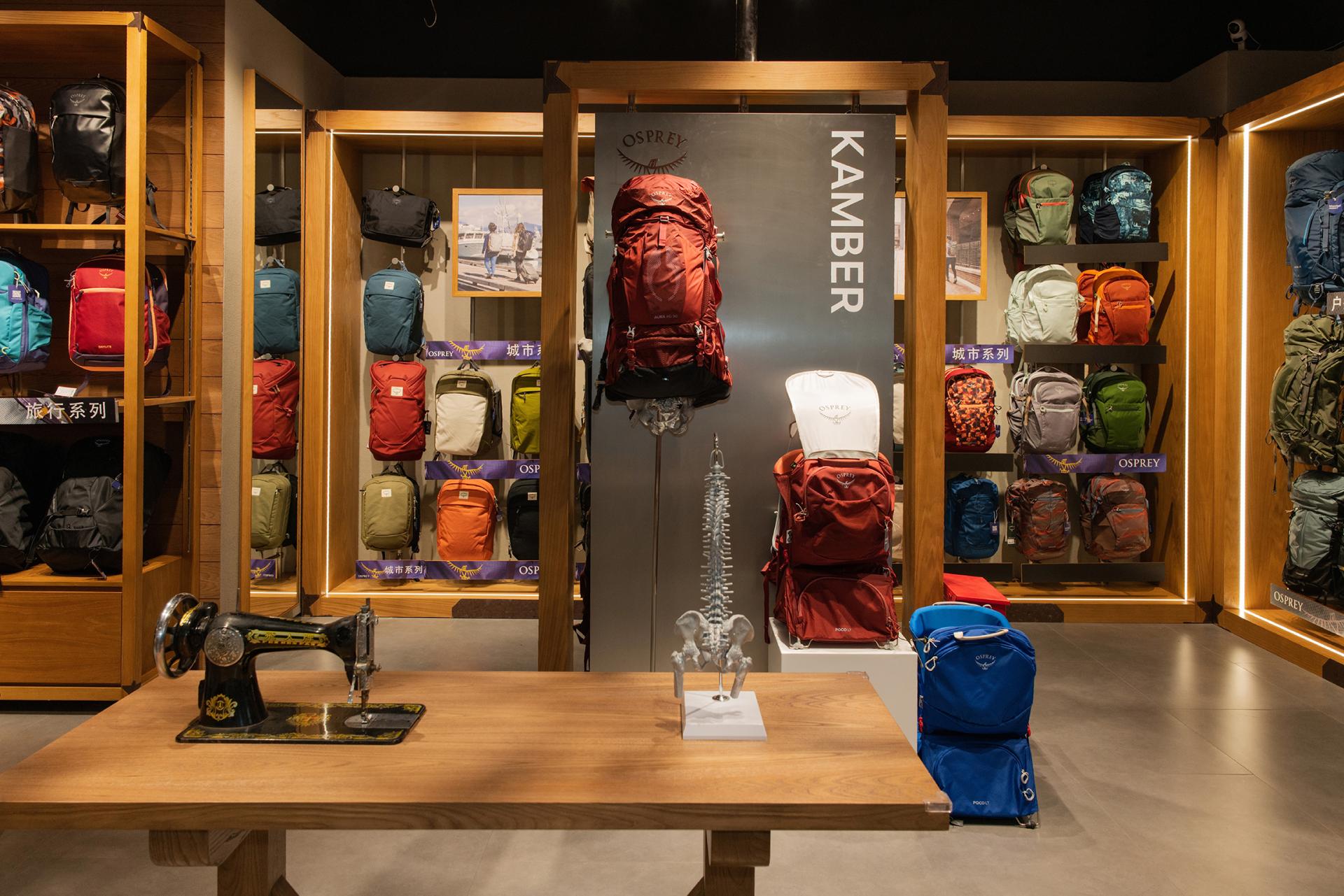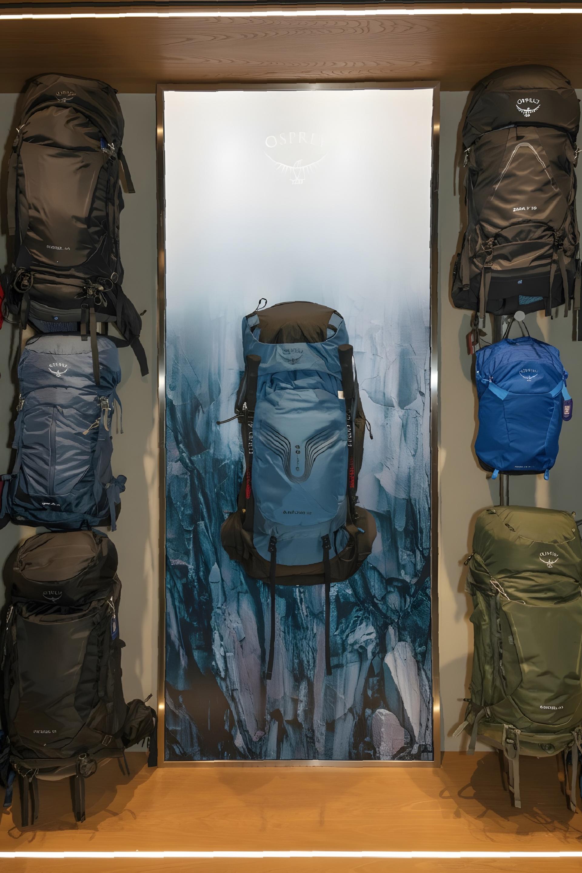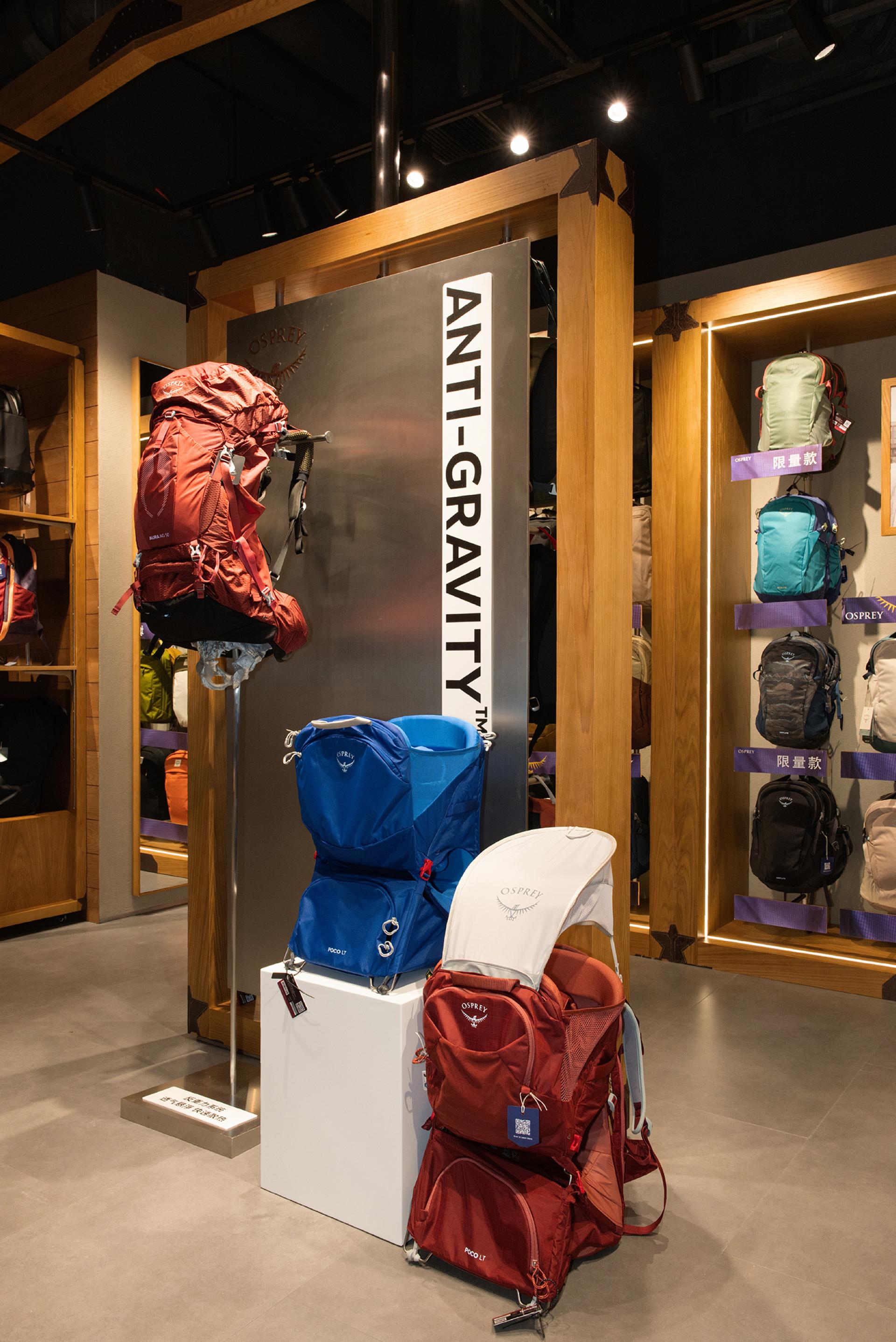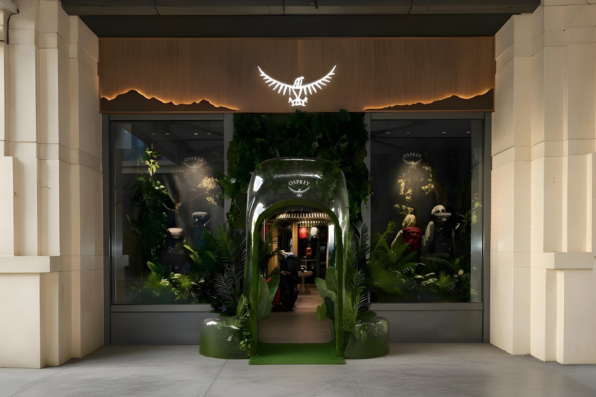 Upon entering, visitors are immersed in a natural atmosphere, with greenery surrounding the space and an arched entrance reminiscent of a tree hollow, conveying Osprey’s deep relationship with the outdoors. The spatial concept is centered on vertebral biomimicry, expressing the brand identity as an innovator of backpack carrying systems. Adjustable installations allow flexible arrangements: they highlight product technology in daily displays and redefine circulation paths during special events, creating dynamic exploratory experiences for visitors.
