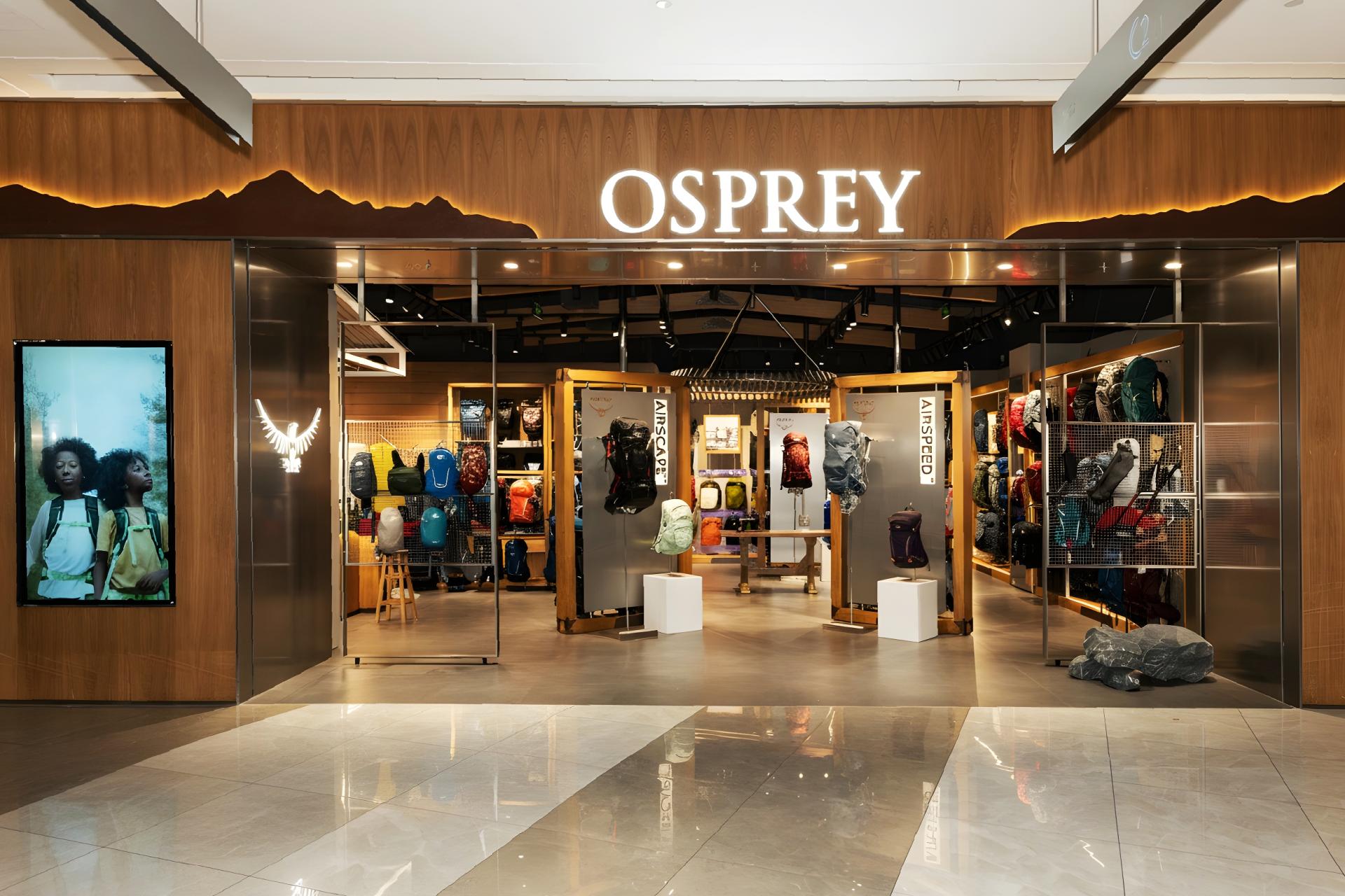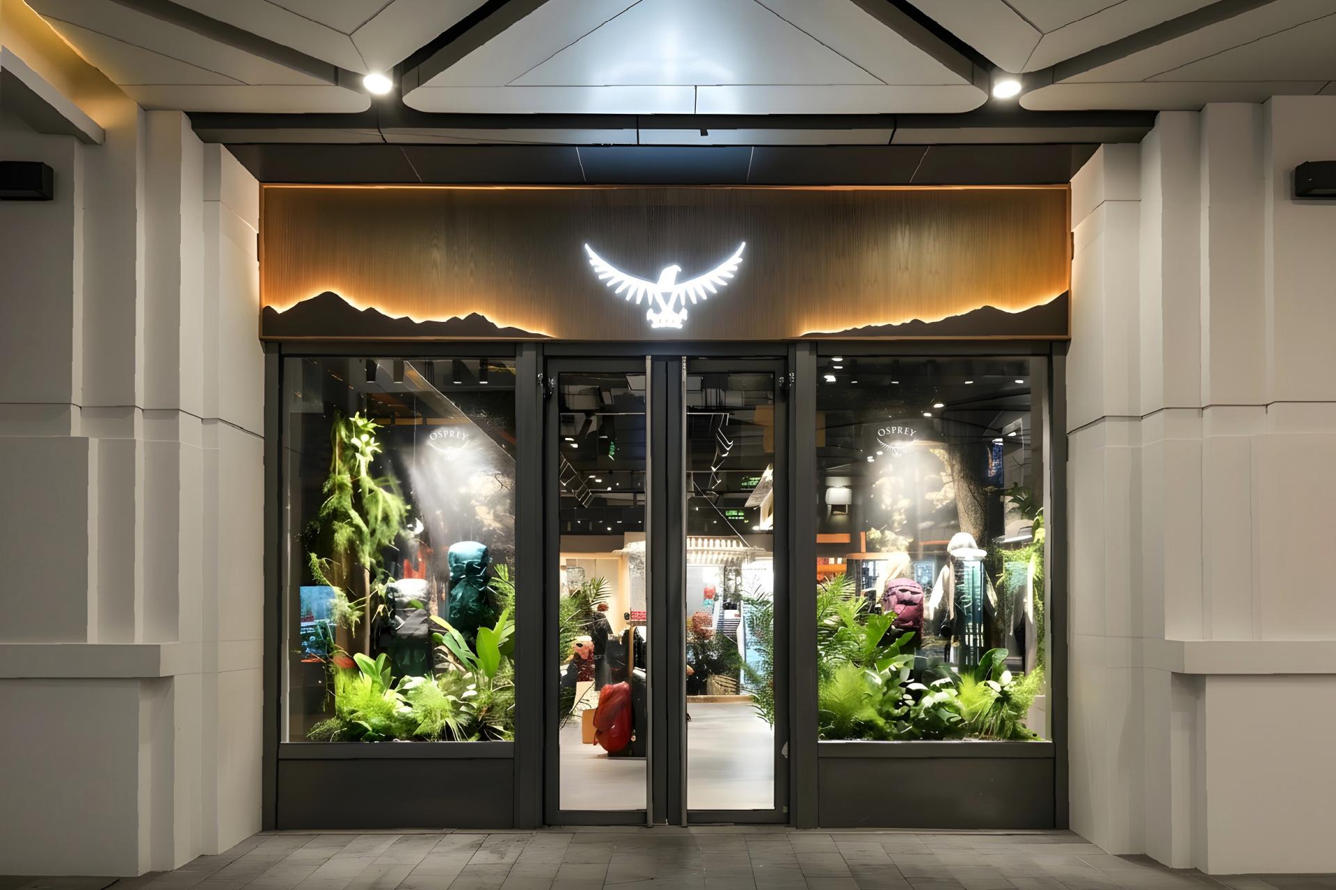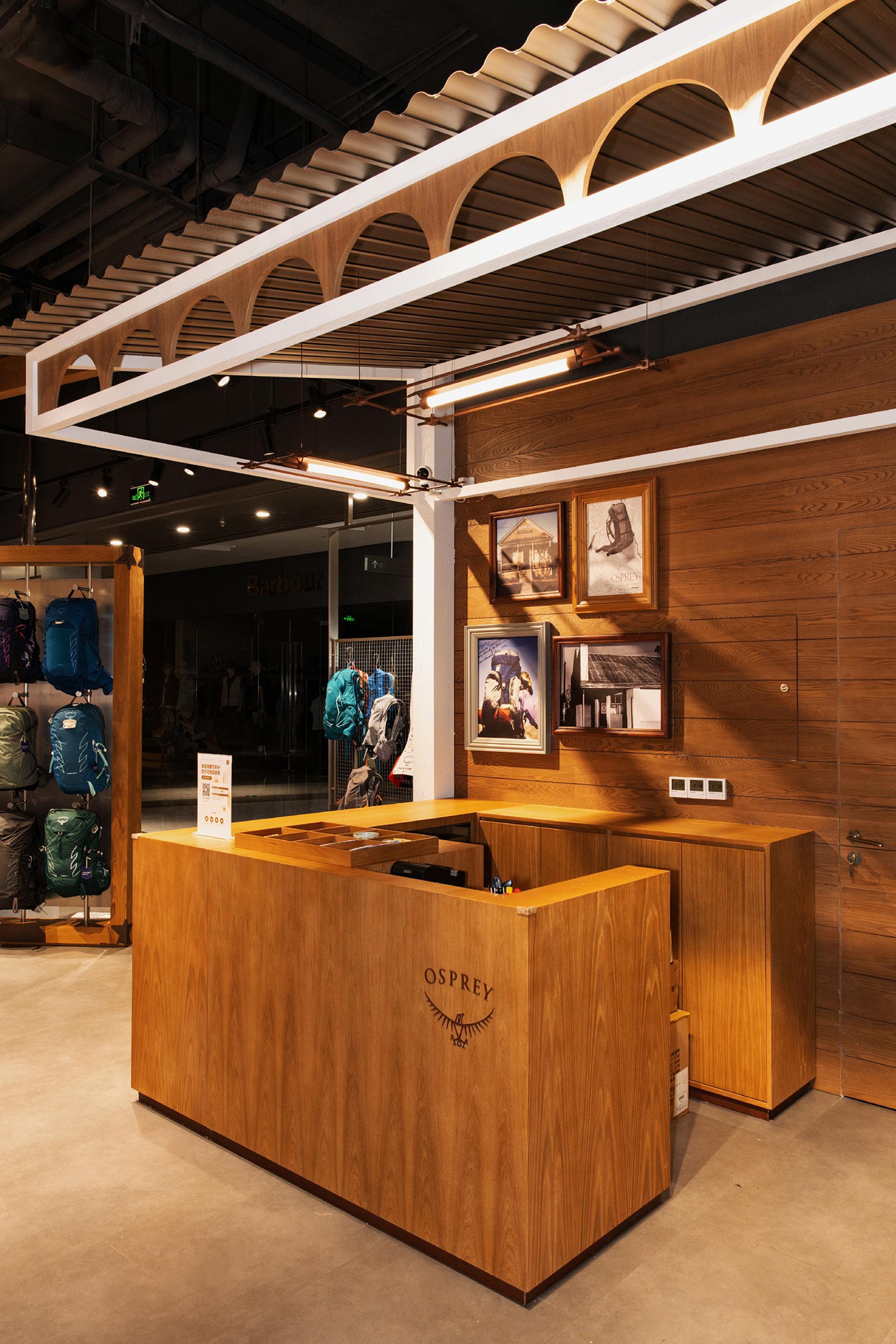 The design of Osprey IN77 store in Hangzhou draws inspiration from the Colorado residence of founder Mike Pfotenhauer, integrating his reverence for nature with a meticulous pursuit of craftsmanship. The store facade echoes the silhouette of the mountains behind Mike’s home, recreated through naturally oxidized metal to capture the timelessness of the peaks, symbolizing the brand’s enduring connection with the natural world.