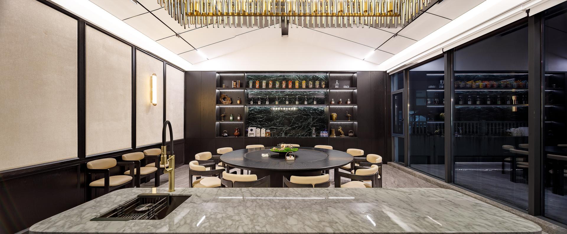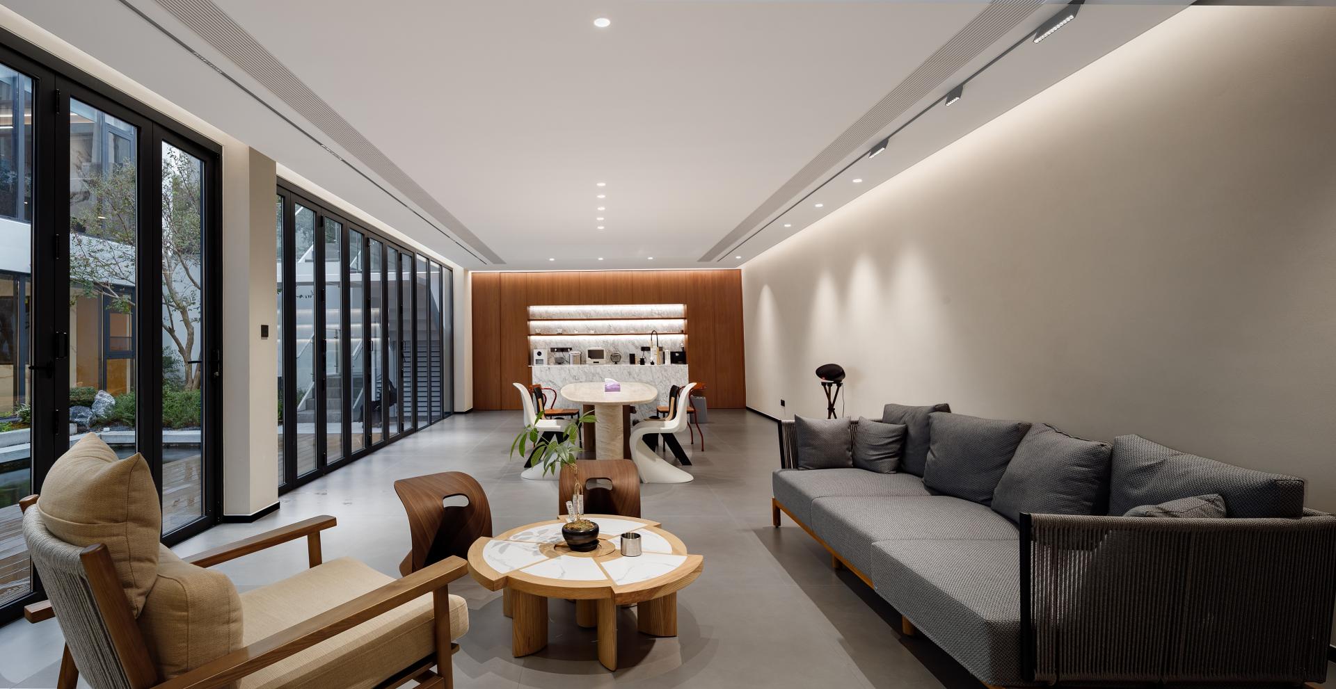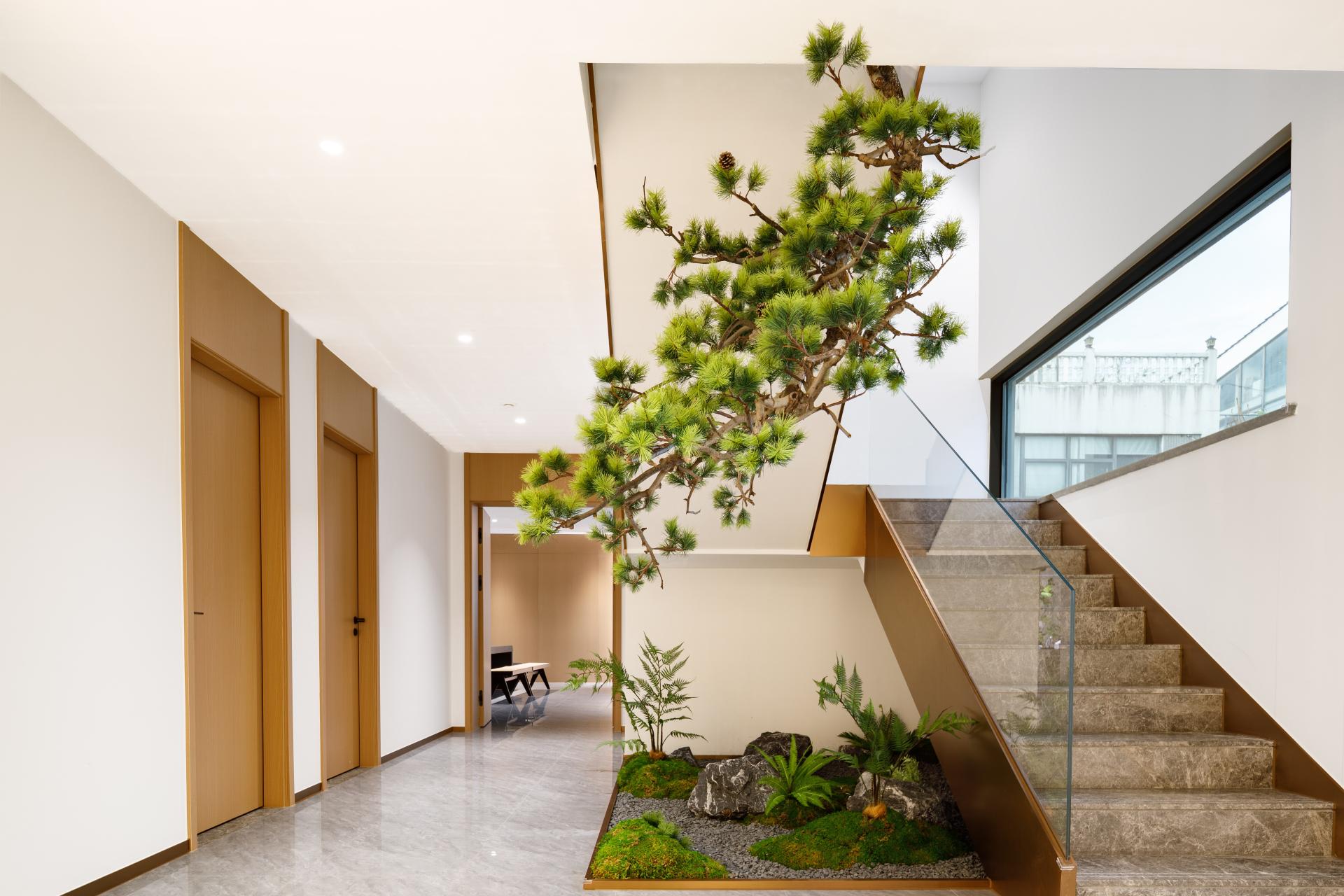 We are committed to creating an office environment that is not only efficient and practical but also rich in cultural heritage and artistic ambiance, making it a unique space that inspires creativity, fosters communication, and showcases corporate taste. The design cleverly utilizes the building's structure to create a multi-layered indoor and outdoor landscape system. From an aerial view, a meticulously planned courtyard landscape is visible, forming a Zen-inspired tableau with stones, greenery, and water features, providing employees with a tranquil resting place. Within the building, the courtyard and reflecting pool interact with the interior spaces, creating a constantly changing visual experience with the interplay of light and shadow. Especially at night, lighting outlines the building's contours and courtyard details, forming a modern and poetic picture. The 1400 square meter space is thoughtfully planned to meet the diverse needs of the group's offices: Flexible Public Areas: A spacious and bright reception area and a multi-functional lounge are designed, which can serve as both informal meeting spots and spaces for employees' daily breaks and small events. Private Executive Meeting Area: While ensuring privacy, the use of materials and lighting creates a dignified and comfortable meeting environment, showcasing the company's strength. Efficient Office Spaces: Combining natural light and intelligent systems to provide an efficient and healthy working environment. Rich Lifestyle Amenities: May include fitness and dining facilities to comprehensively enhance employee well-being and sense of belonging. The design team meticulously selects materials, aiming to enhance the overall quality of the space through the texture and luster of the materials themselves. Rose Gold Stainless Steel: With its unique color and modern feel, it outlines the exquisite lines of the space, adding a touch of understated luxury to the reception and public areas. Luxury Green Stone: As a visual focal point, it is cleverly used on background walls or tabletops. Its natural veins and deep colors are like works of art from nature, giving the space a calm and distinguished tone. Travertine: With its warm texture and unique pores, it brings a natural and elegant touch to the space, balancing the heaviness of luxury stones.
