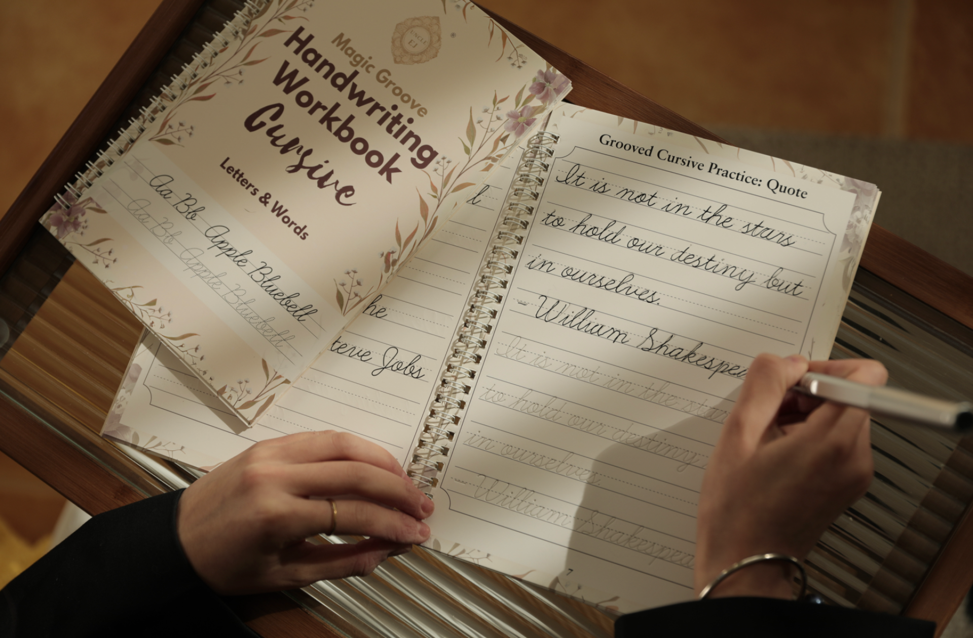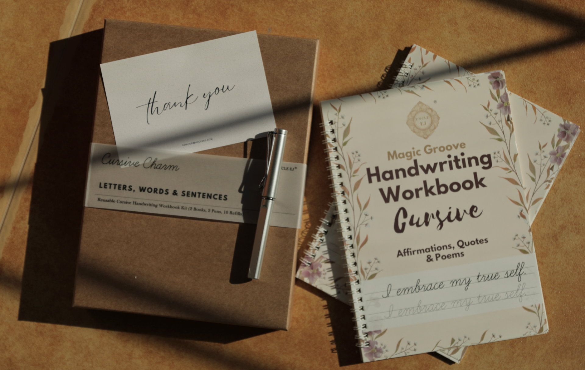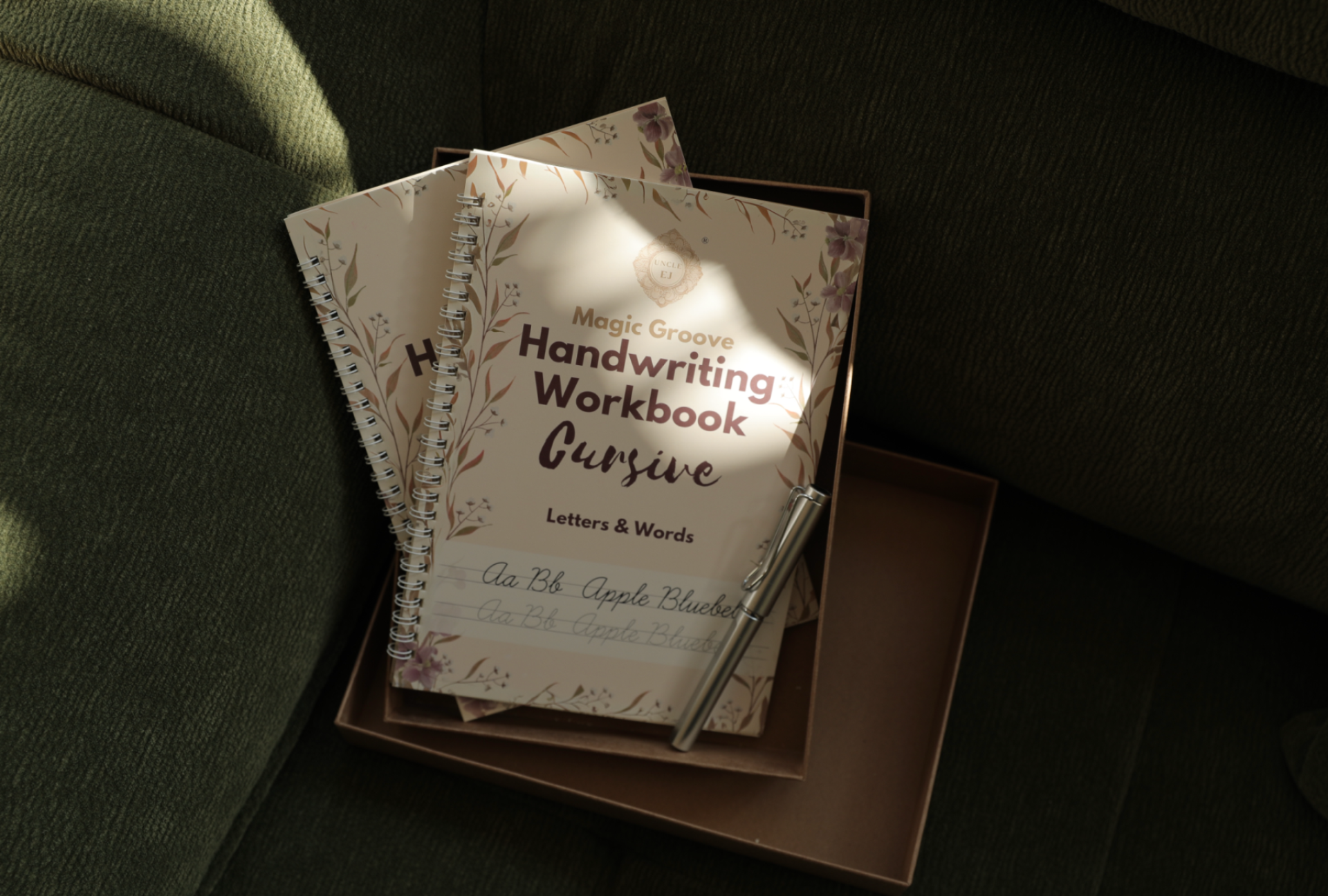 Inside the box, two beautifully designed books await. The first book introduces grooved letterforms for practicing the alphabet and basic words, while the second elevates the learner to practice quotes, sentences, and poetry, cultivating both skill and expression.