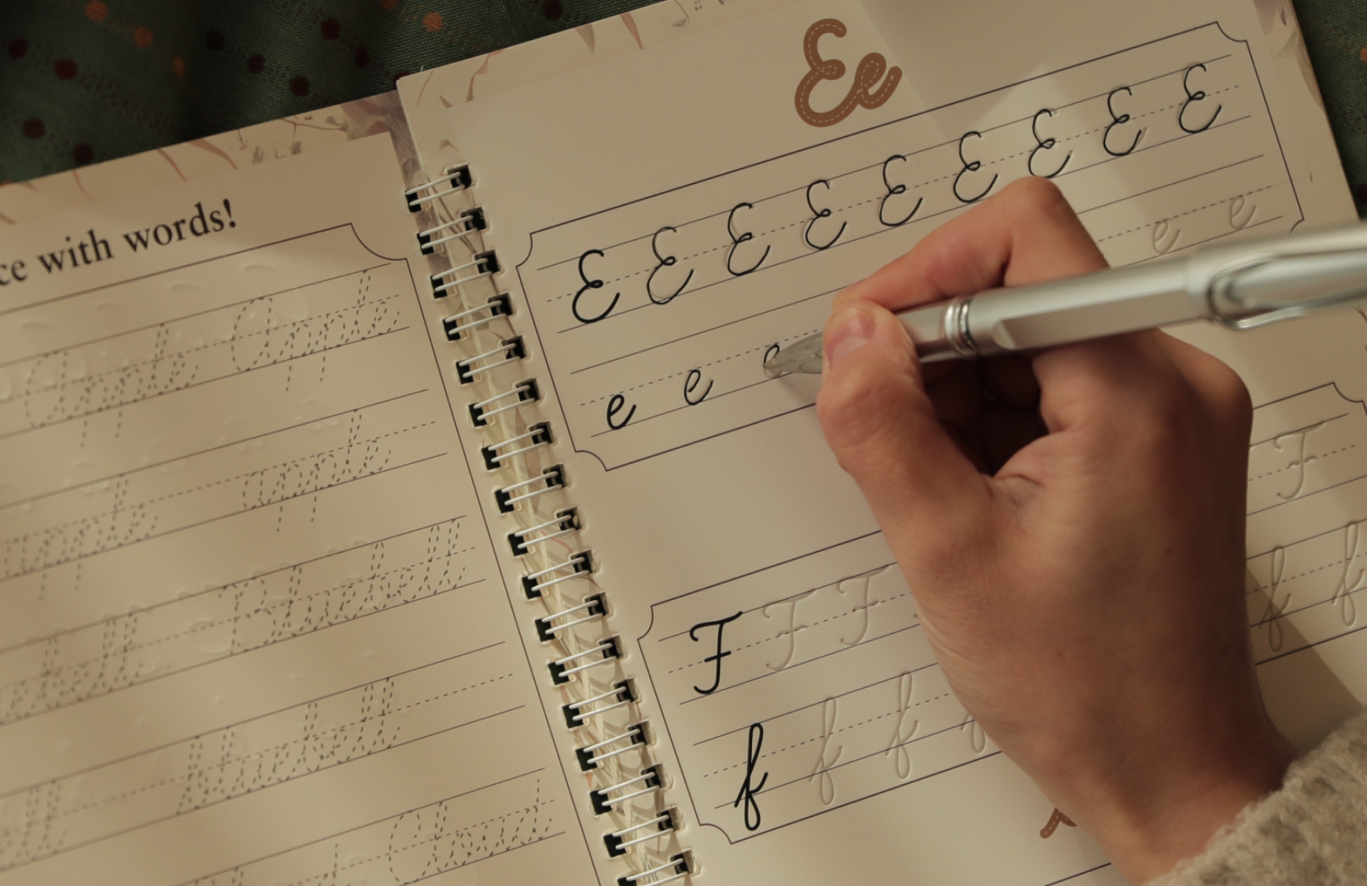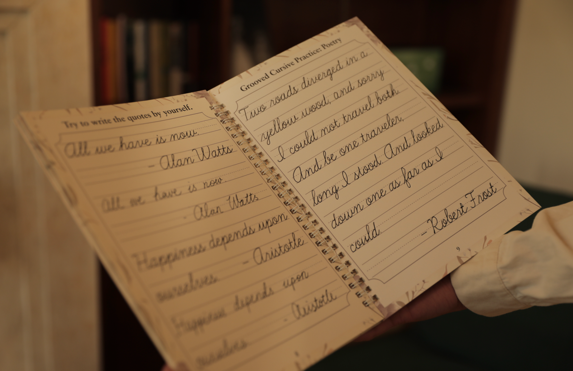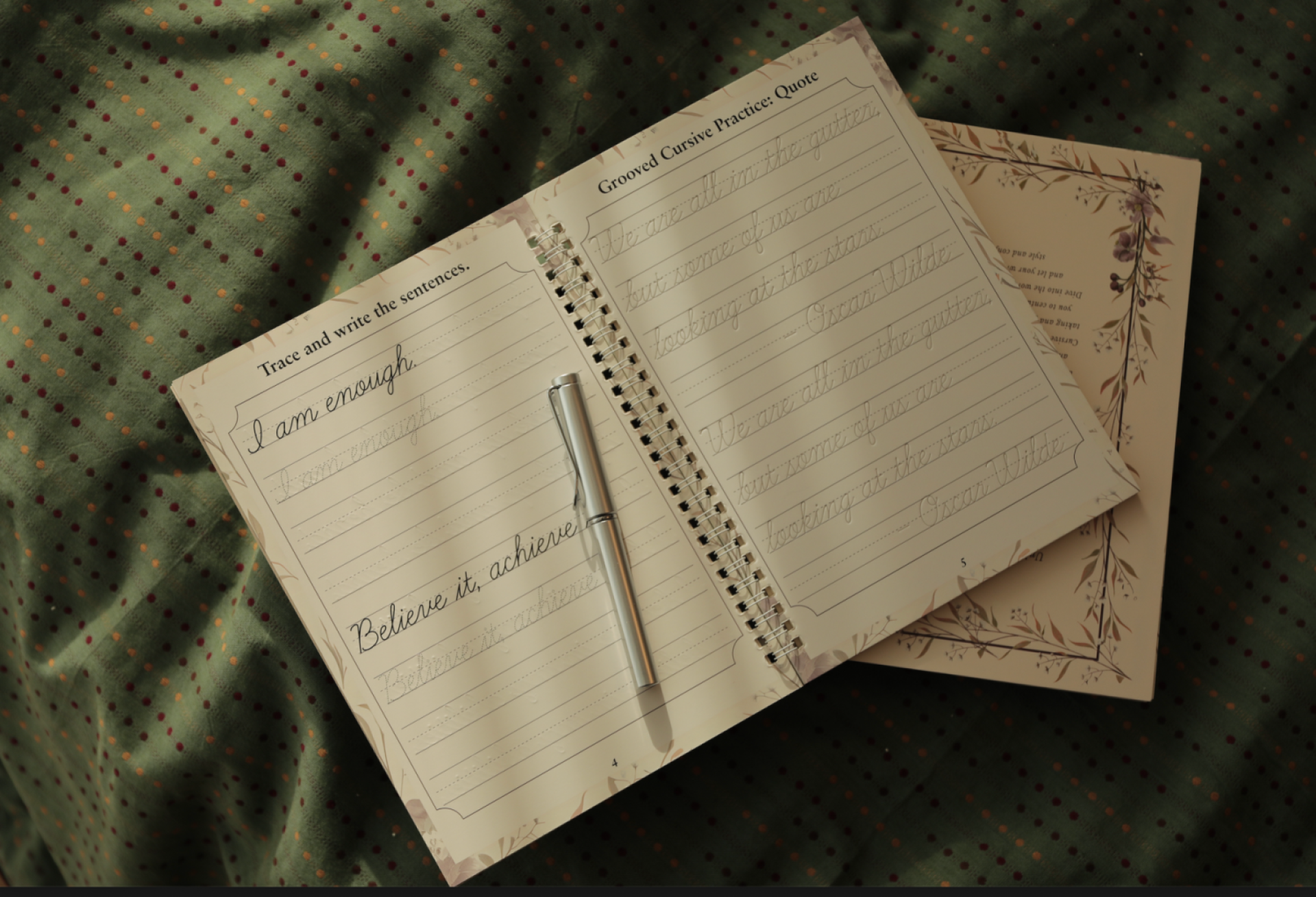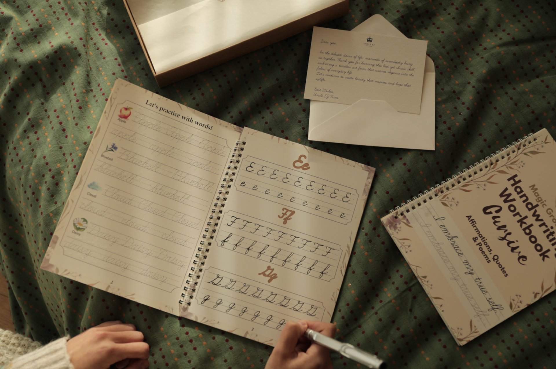 Inside the box, two beautifully designed books await. The first book introduces grooved letterforms for practicing the alphabet and basic words, while the second elevates the learner to practice quotes, sentences, and poetry, cultivating both skill and expression.