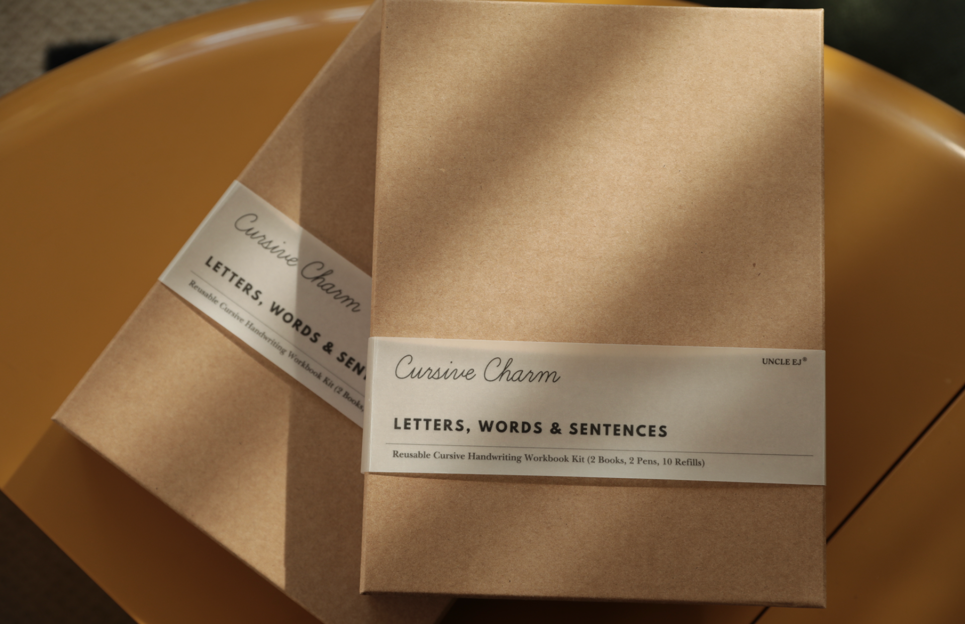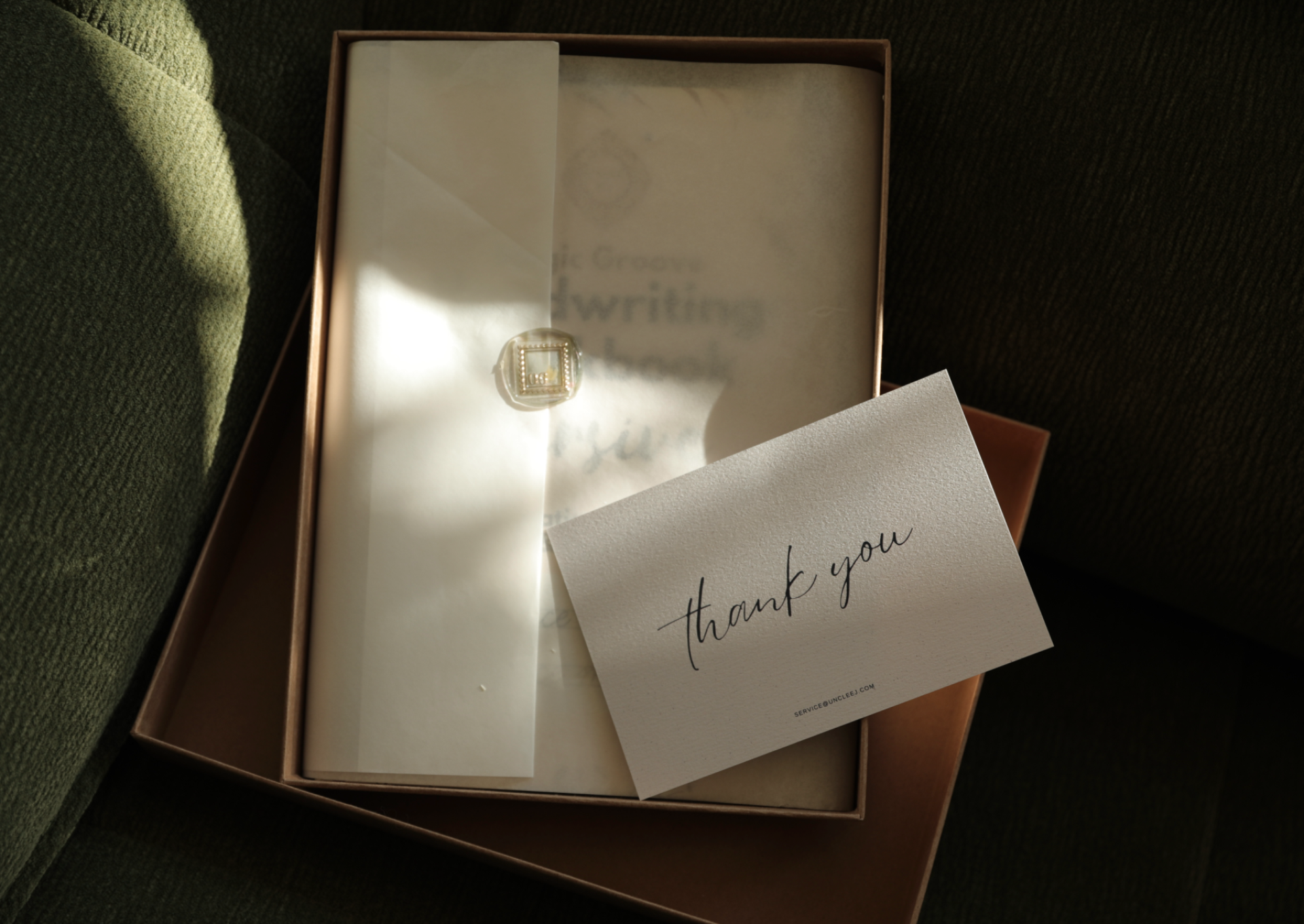 Inside, the products are delicately wrapped with semi-transparent tissue paper, sealed by a wax-seal inspired sticker. The unwrapping produces a gentle ASMR rustling sound, echoing the ritual of opening a vintage gift. This classical gesture mirrors the purpose of the books themselves — a return to the artistry of cursive handwriting.