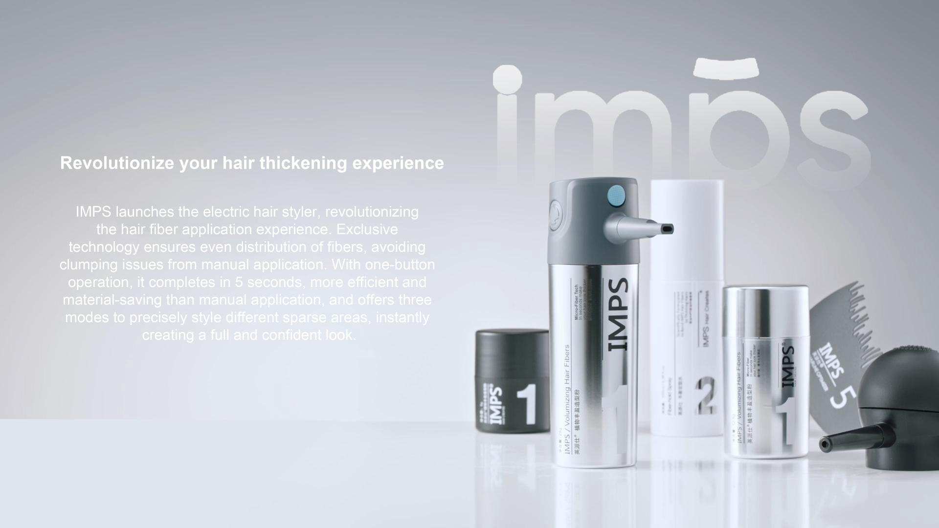 The IMPS Steadyflow™ Fiber -Optimized Electric Applicator is a hair fiber application device designed specifically for individuals with thinning hair, offering a non-invasive, quick-to-apply solution for visually enhancing scalp coverage.