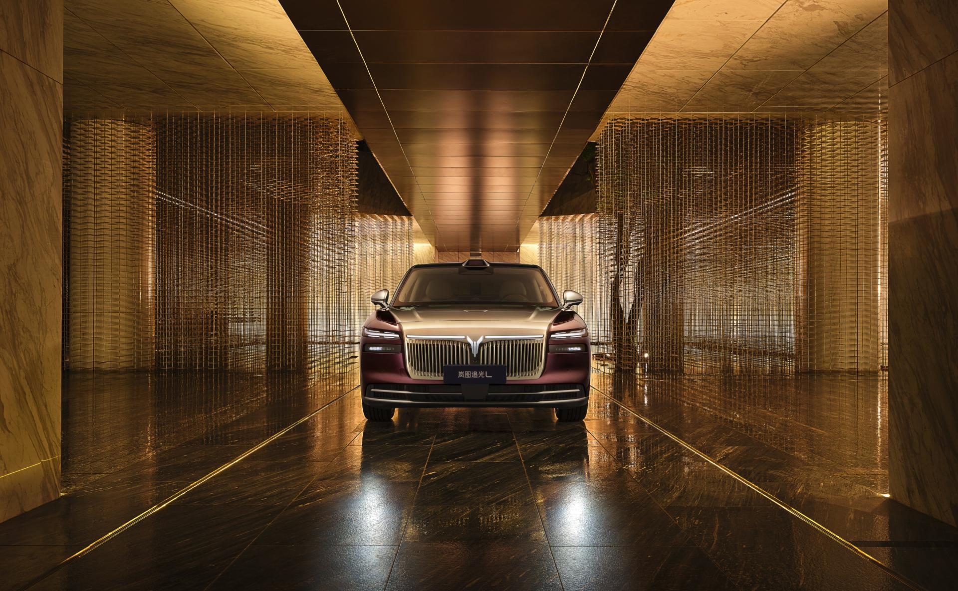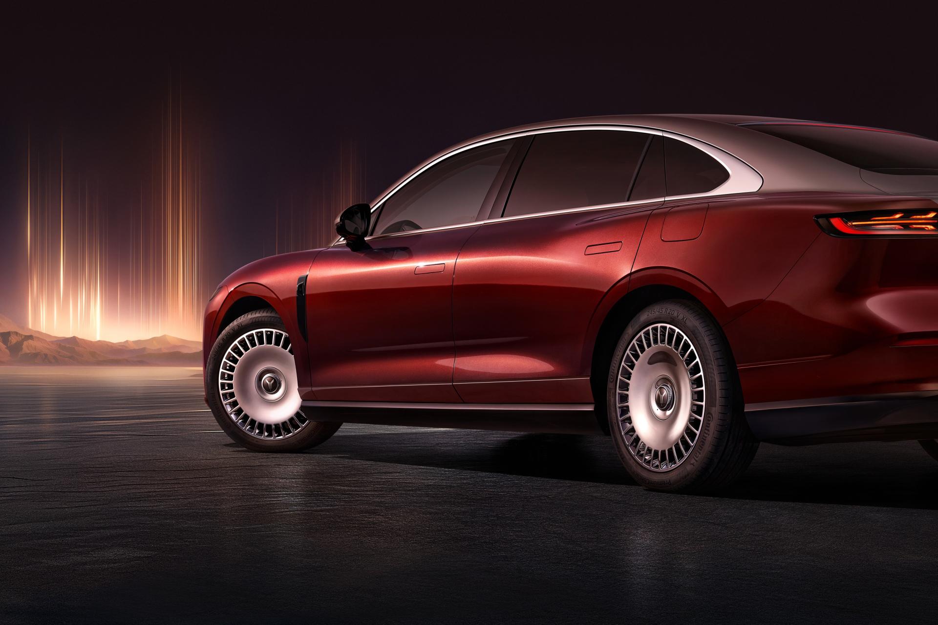 The front grille and brand logo feature a highly integrated flat design, emphasizing the electric attributes while highlighting the simplicity and technological sophistication characteristic of electric vehicles. The structured grille, inspired by the Chinese ding, a cultural symbol of power, order, and identity, is transformed through modern design techniques into a visual anchor exuding ceremony and strength. The continuous chrome trim at the base further defines the upright volume of the front face, enhancing visual weight through horizontal extension and reinforcing the commanding presence and dignity befitting a flagship model.