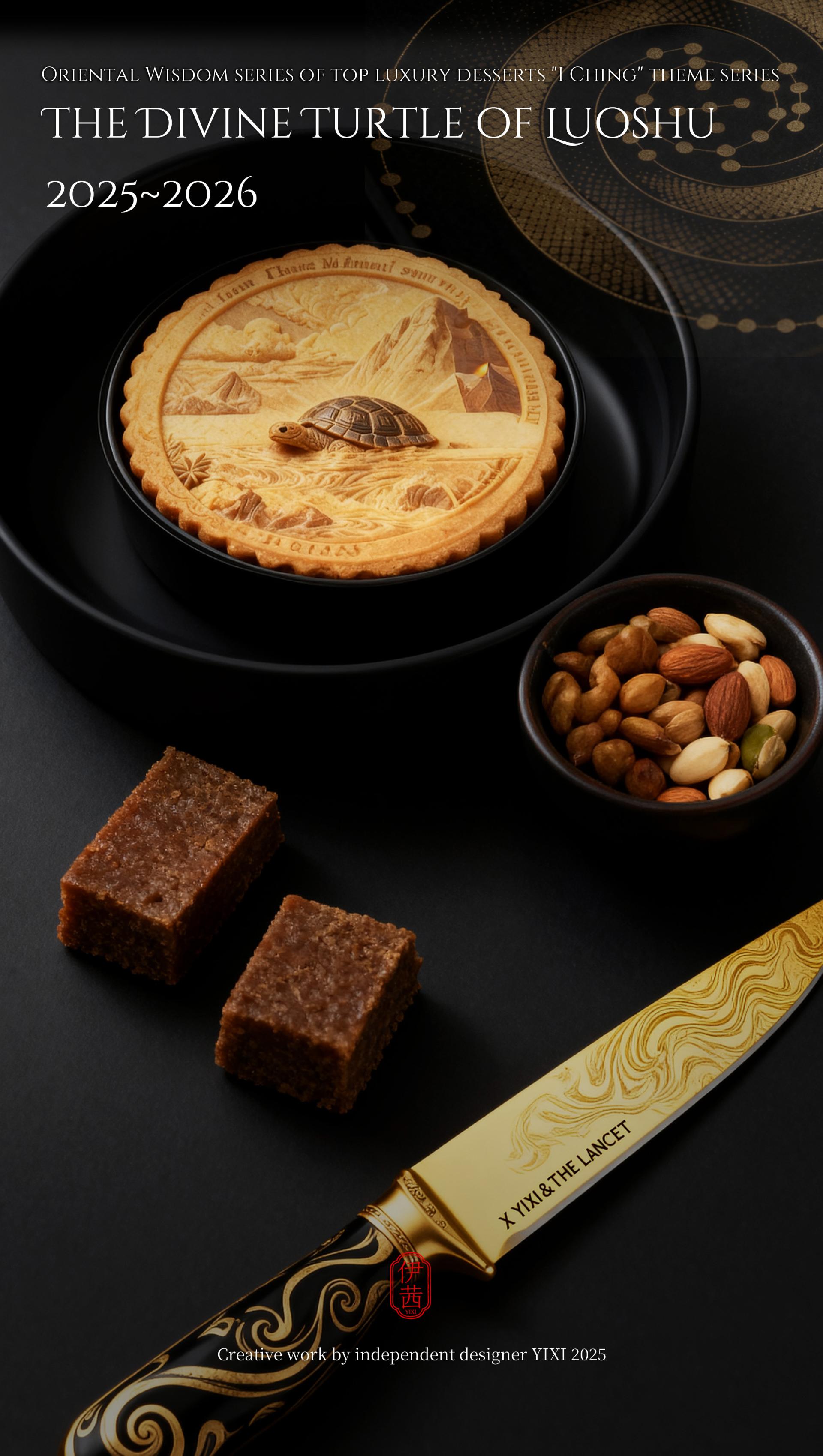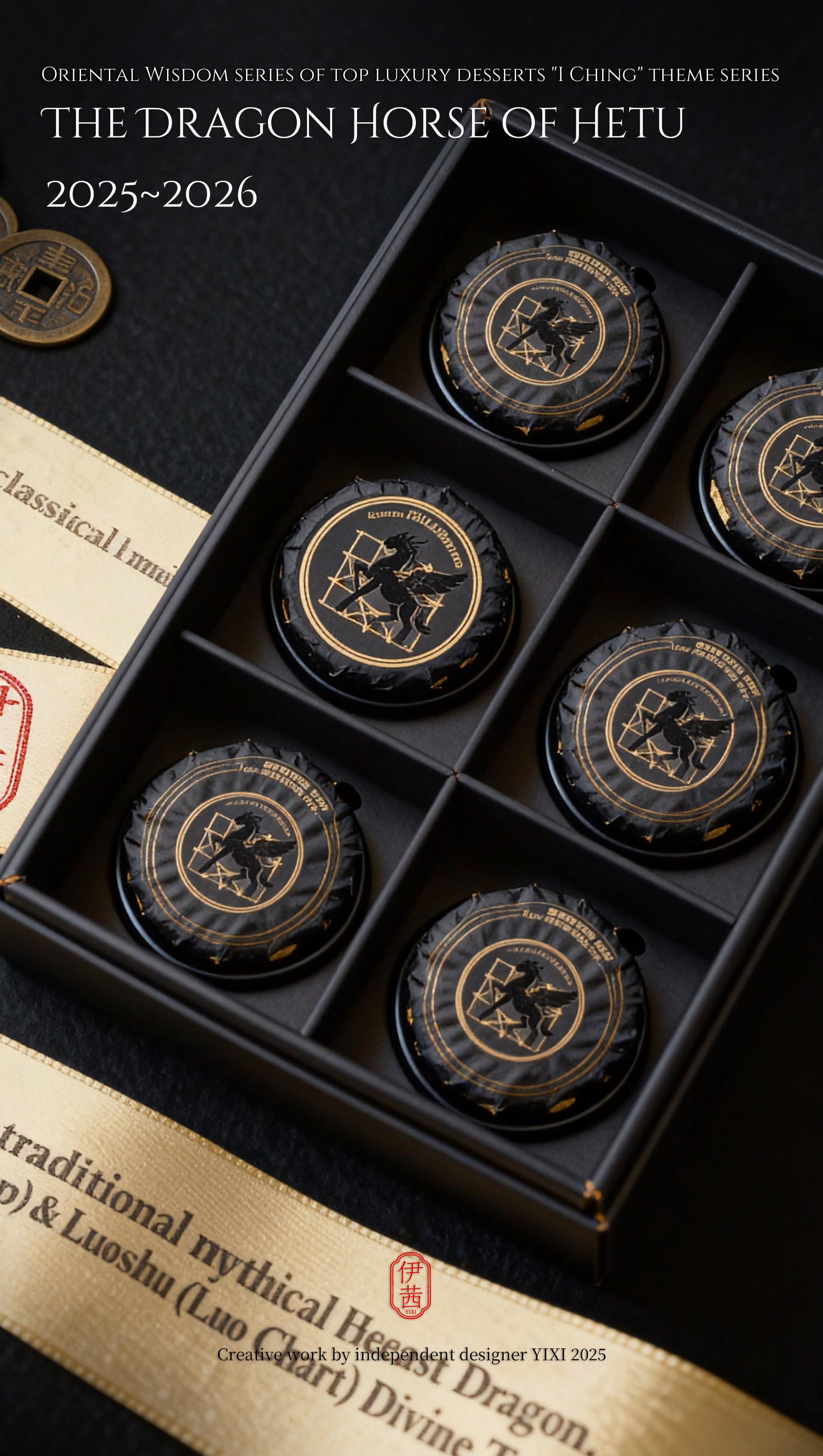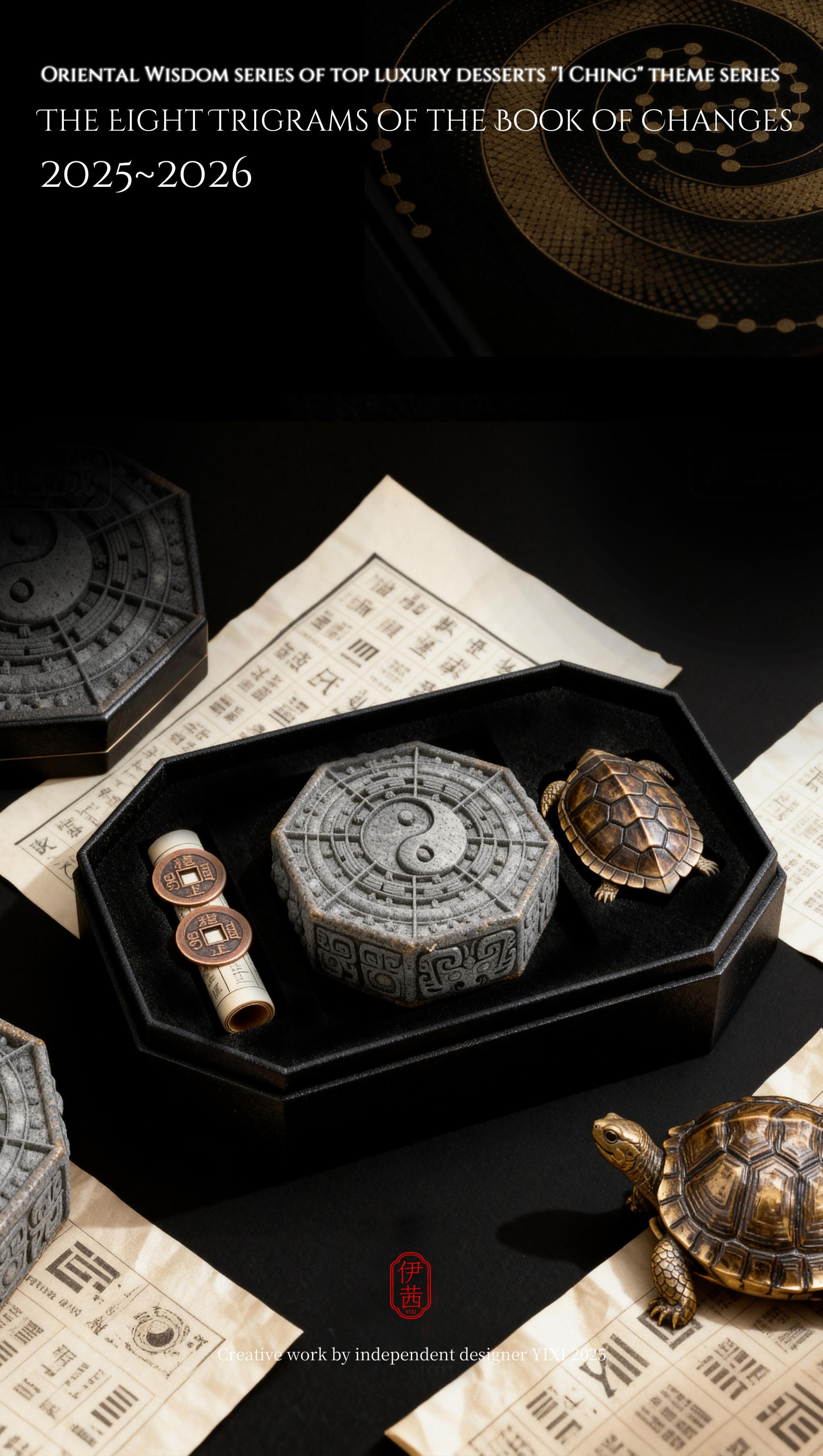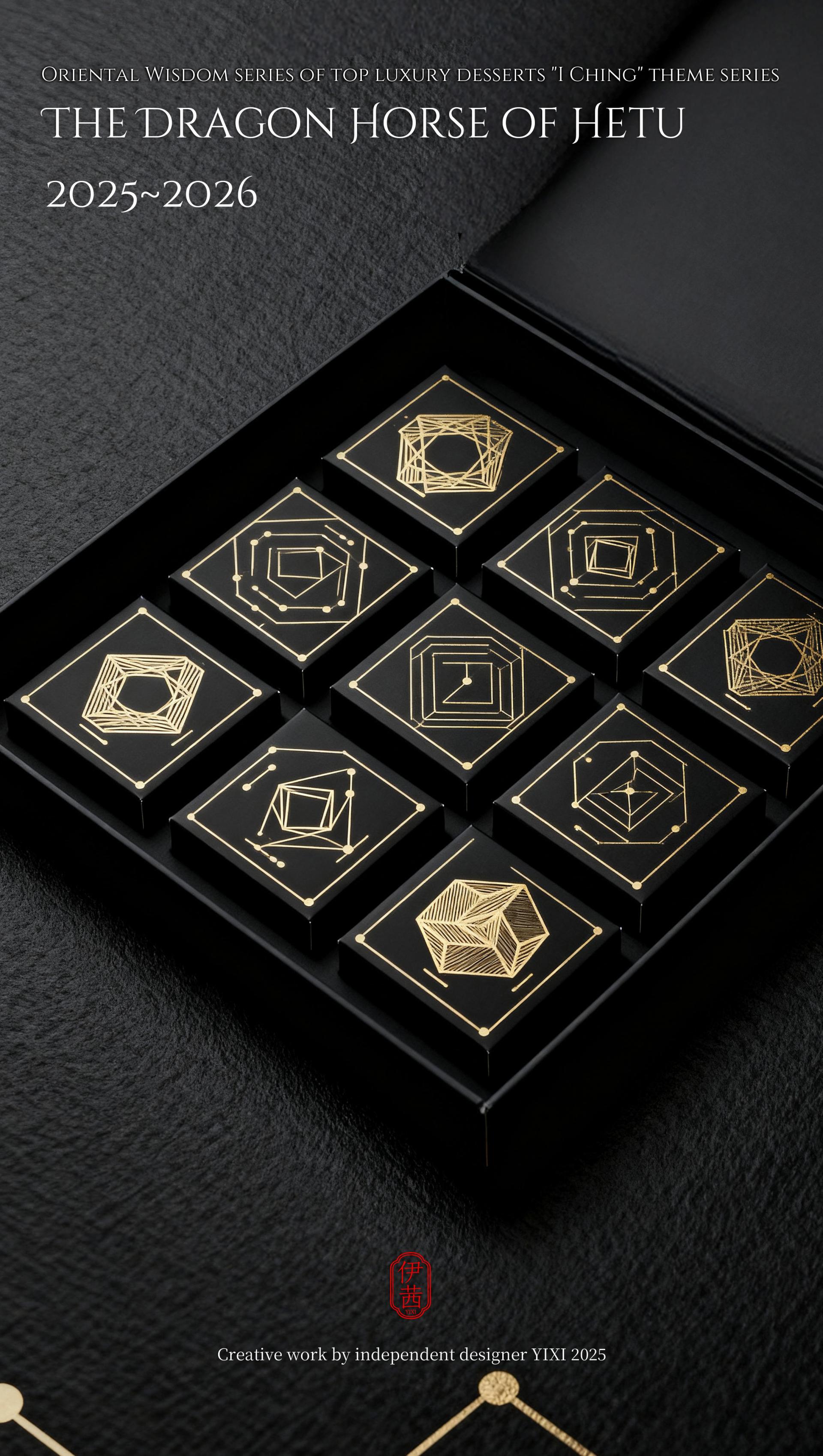 The design philosophy is rooted in the cosmological view of the I Ching, which involves contemplating the celestial patterns above and examining the terrestrial forms below. This vision integrates the transformations of Yin-Yang and the Five Elements, along with the philosophy of the unity between heaven and humanity, into the series' creative concepts, forms, and packaging. From the He Tu Dragon Horse symbolizing fortune and wisdom, to the Luo Shu Divine Tortoise embodying cosmic order; from the Ba Gua that represents the fundamental elements of nature, to the Sixty-Four Hexagrams that reveal the universal laws of change, each dessert is imbued with unique cultural symbols and auspicious meanings. It presents an extraordinary experience that connects the past with the future and melds the sensory with the spiritual.