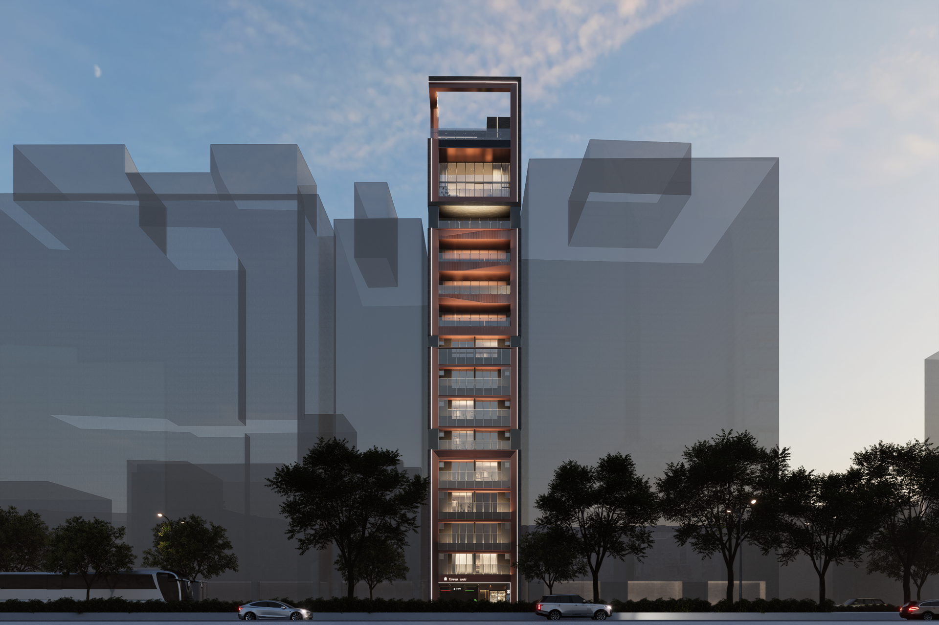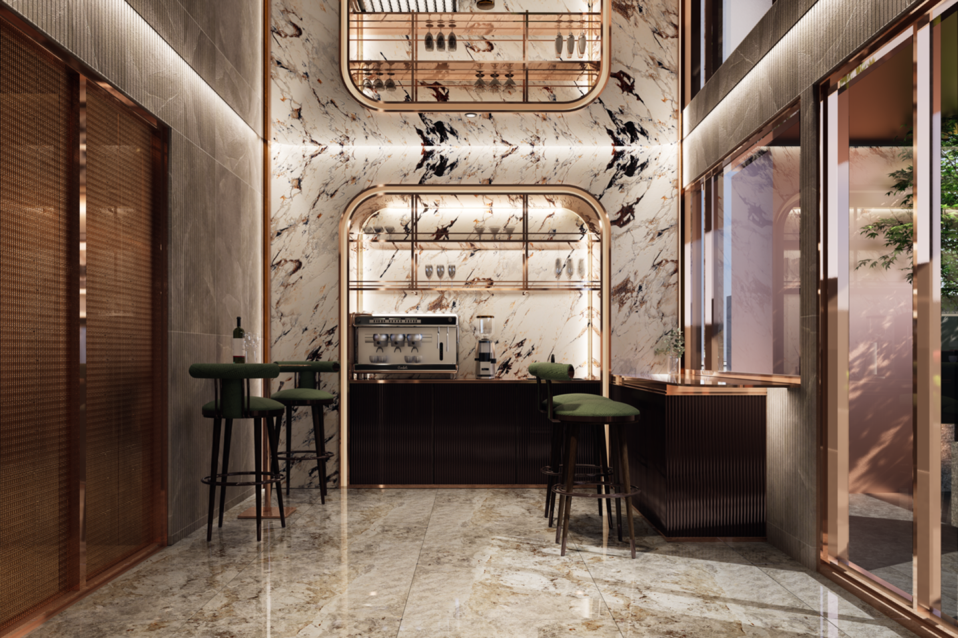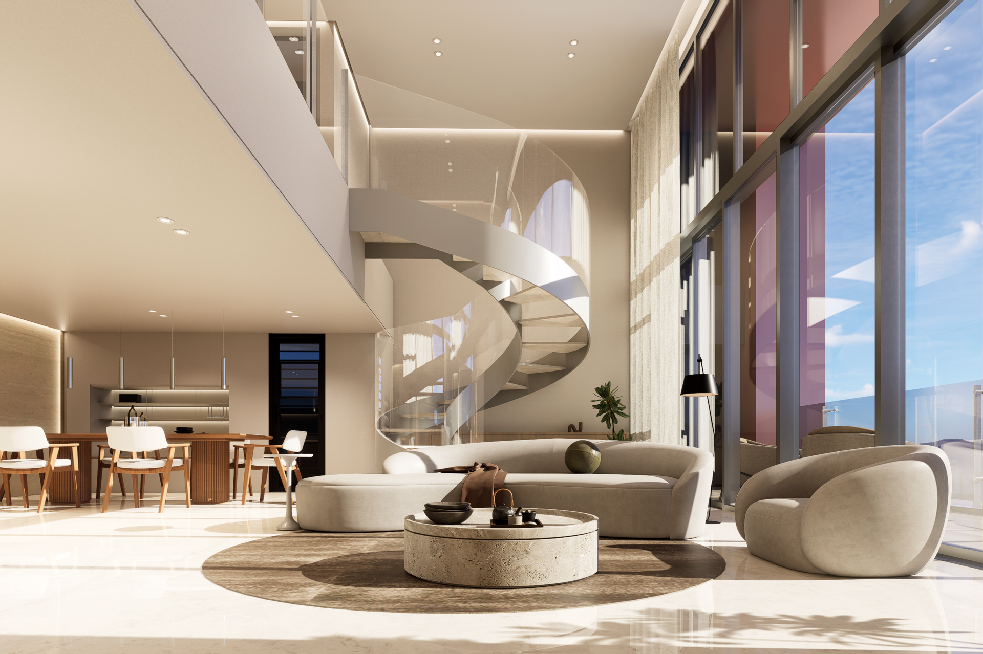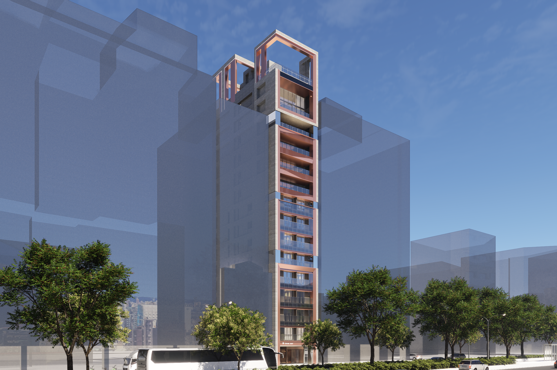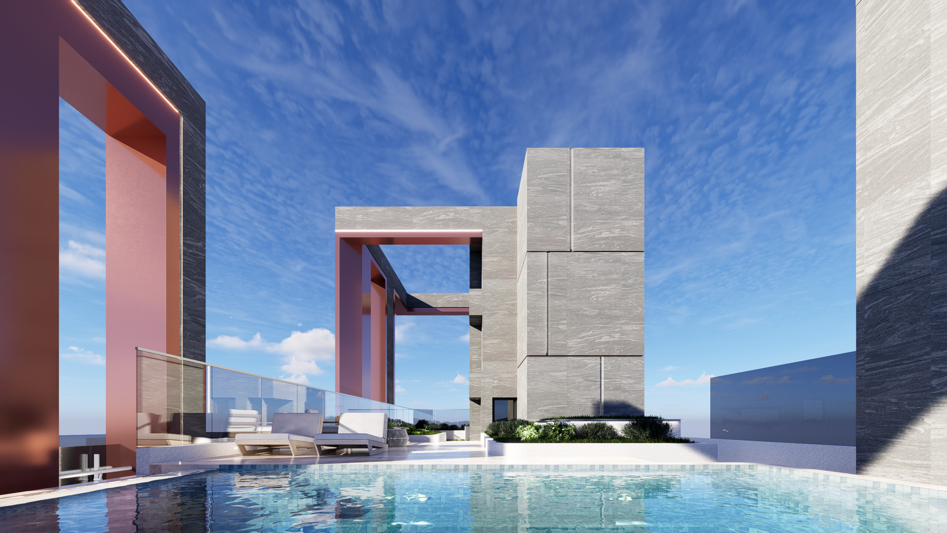 The building adopts a unified design language from its rose gold facade and an entrance with a height of 4.2 meters to the rooftop pool and skip-floor suites. With hotel style apartments on the lower floors, flexible suite layouts at mid levels, and a top level suite integrating a spiral staircase and terrace, the project maximizes space on a compact site to form a vertical micro community.